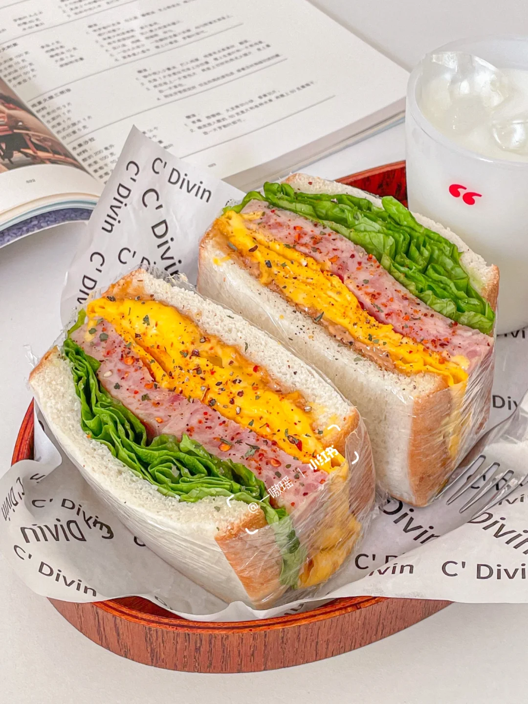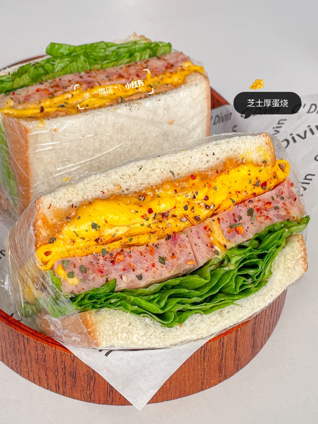 ▫️吐司抹汉堡酱(不抹也可),放上芝士厚蛋烧、午餐肉、生菜,盖上另一片吐司,包起来,对半切开