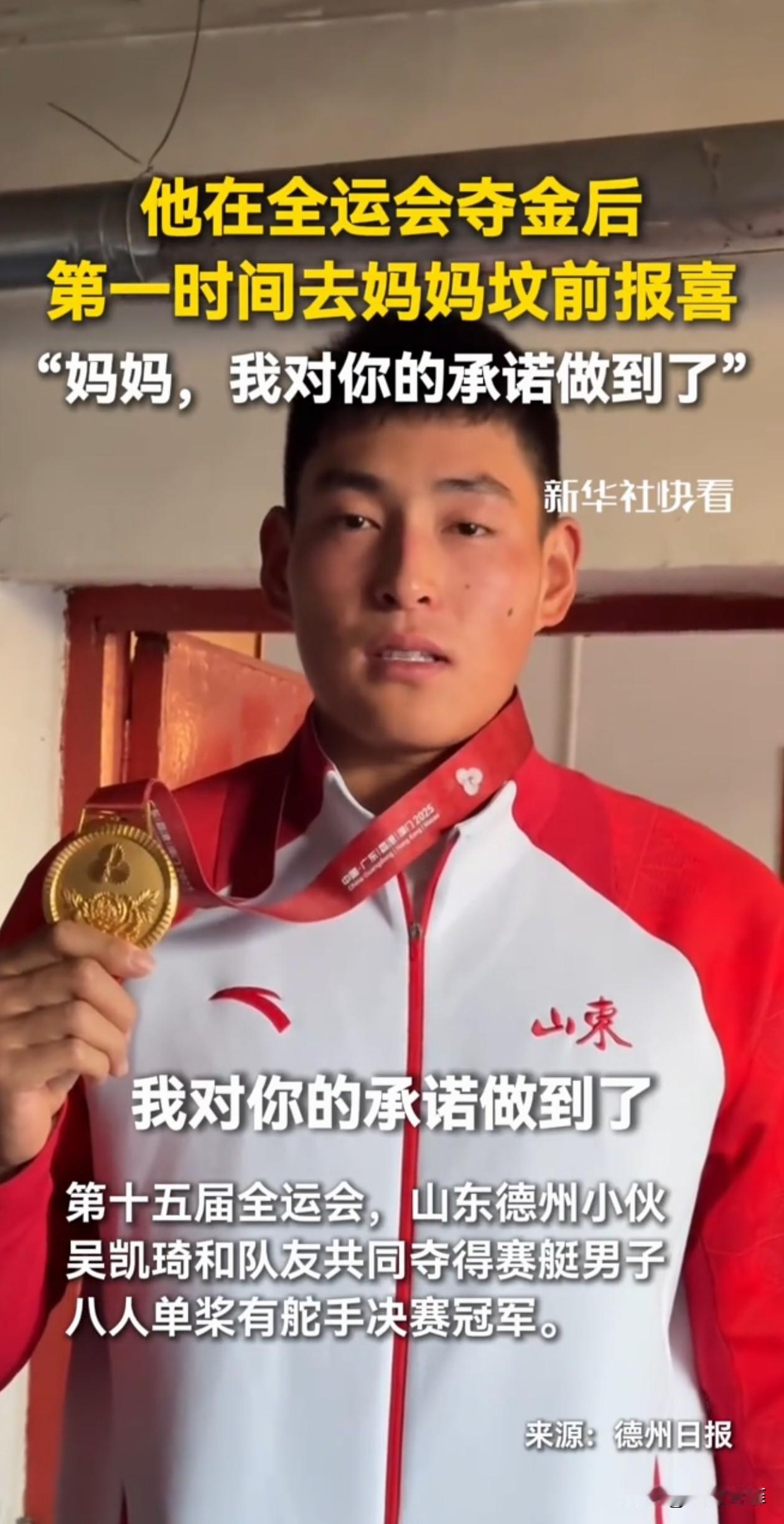 泪目了!山东,一小伙拼尽全力在全运会夺冠后,顾不上庆祝,而是直接带着金牌往家赶,来到妈妈坟前报喜,兑现当初的承诺。 小伙一直在练赛艇,妈妈生前最支持他,总盼着能看到他站上全运会最高领奖台,他也跟妈妈许下诺言,一定会拿块金牌回来给她看。 两年前,妈妈病重的时候,他正忙着备战关键比赛,没能见到妈妈最后一面,成了他心里最大的遗憾。 这份遗憾和对妈妈的承诺,成了他训练的最大动力,累到坚持不住了,他就想想妈妈的期盼,咬着牙接着练。 第十五届全运会赛艇男子八人单桨有舵手决赛上,他和队友们一起奋力挥桨冲刺,最终率先冲过终点线,拿了冠军。 赛场的欢呼还没停,金牌还热乎乎的,而他心里就只有一个念头:赶紧回家,告诉妈妈这个好消息。 他来到妈妈坟前,蹲下身,把金牌轻轻举起,和妈妈一起感受这份喜悦。看着妈妈的照片,这个在赛场上不怕苦不怕累的小伙子,再也忍不住掉下了眼泪。 面对镜头,他哽咽地说出,妈妈,我对你的承诺做到了! 金牌耀眼,孝心更动人,对小伙来说,这枚金牌不只是荣誉,更是献给妈妈最好的礼物,也是对自己遗憾的弥补。 小伙为国争光又心怀感恩,他让我们看到,荣誉背后不光有努力,还有最朴素的亲情。