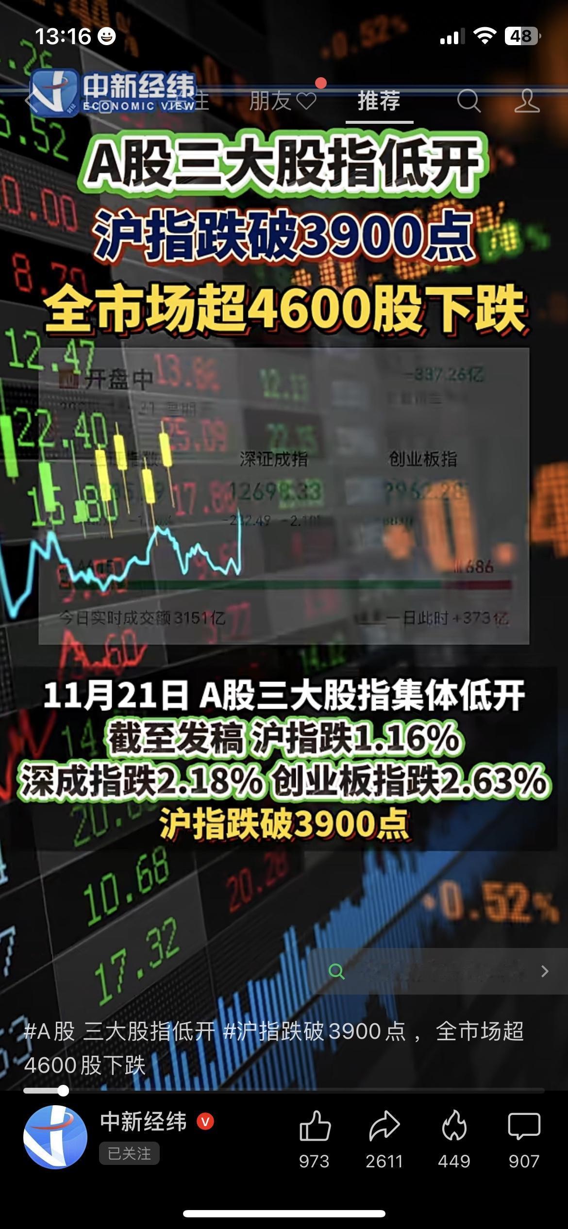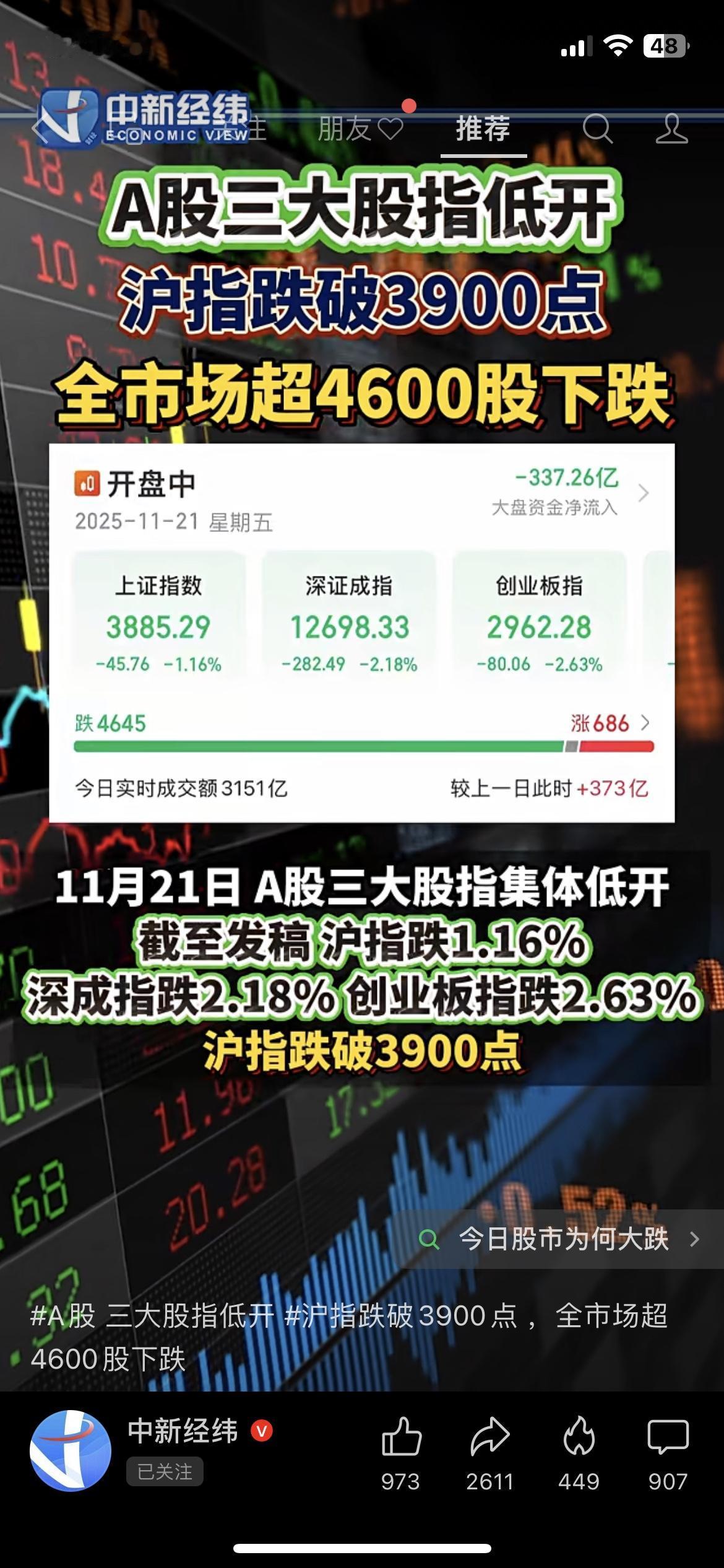 💥A股又双叒跌懵了!沪指跌破3940点,4600股飘绿,648亿资金集体跑路!为啥跌?大白话给你说透,长期要不要慌? 今天开盘直接给股民上了堂“心碎课”:沪指跌1.16%、深成指跌2.18%、创业板指跌2.63%,全市场4600多只股绿油油,就600多只红盘撑场面,成交额3151亿越跌越放量,这行情谁看了不叹气? 其实下跌原因就4点,不用懂专业术语也能看明白: 1. 外资+杠杆资金一起跑:北向资金净流出313亿,融资盘也撤了335亿,市场没了“钱撑着”,自然扛不住下跌; 2. 美股带崩全球情绪:前几天美股回调,加上美联储官员说可能不着急降息,全球投资者都慌了,A股也被这波恐慌传染; 3. 4000点关口太难闯:这位置堆了好多年前套牢的筹码,好几次冲上去都掉下来,大家心里没底,索性先卖了再说; 4. 热点来回晃没主线:一会儿炒这个一会儿炒那个,资金不敢长期待,越卖越跌形成恶性循环。 不过咱也不用过度慌!从长期看,A股向好的大趋势没改——政策一直给支持,新“国九条”和中长期资金入市政策都在释放红利,加上科技升级、消费复苏这些基本面撑着,现在的波动更像是“慢牛路上的回调”。短期跌得猛,但优质资产的价值还在,熬过去可能就是机会。 你手里的票是硬抗住了,还是被深套了?这波下跌你觉得会持续多久?长期你还看好A股吗?来评论区聊聊,看看谁是今天的“抗跌王者”~ A股大跌 沪指跌破3940 股市行情 股民日常 投资干货 A股长期趋势A股指数 A股行情 大盘走势 大盘要跌吗 大盘股下跌