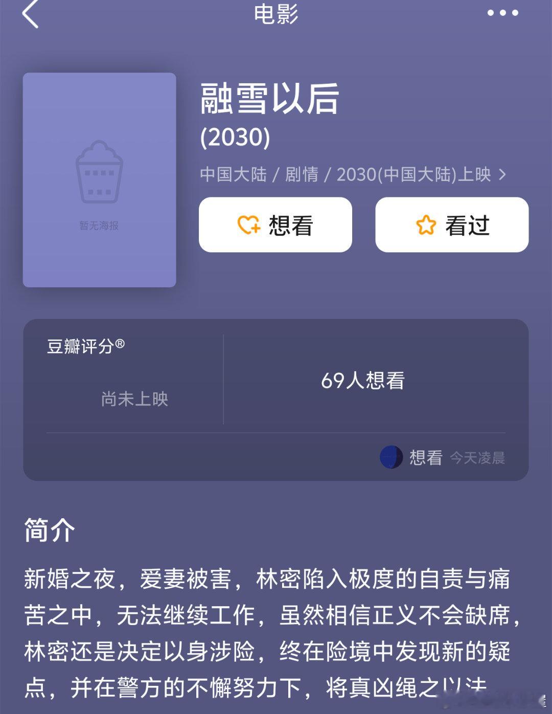 网传易烊千玺、廖凡、辛芷蕾、黄觉将合作刁亦男新电影《融雪以后》,12月哈尔滨开机,看起来这个剧情很好啊!!!简介:新婚之夜,爱妻被害,林密陷入极度的自责与痛苦之中,无法继续工作,虽然相信正义不会缺席,林密还是决定以身涉险,终在险境中发现新的疑点,并在警方的不懈努力下,将真凶绳之以法。