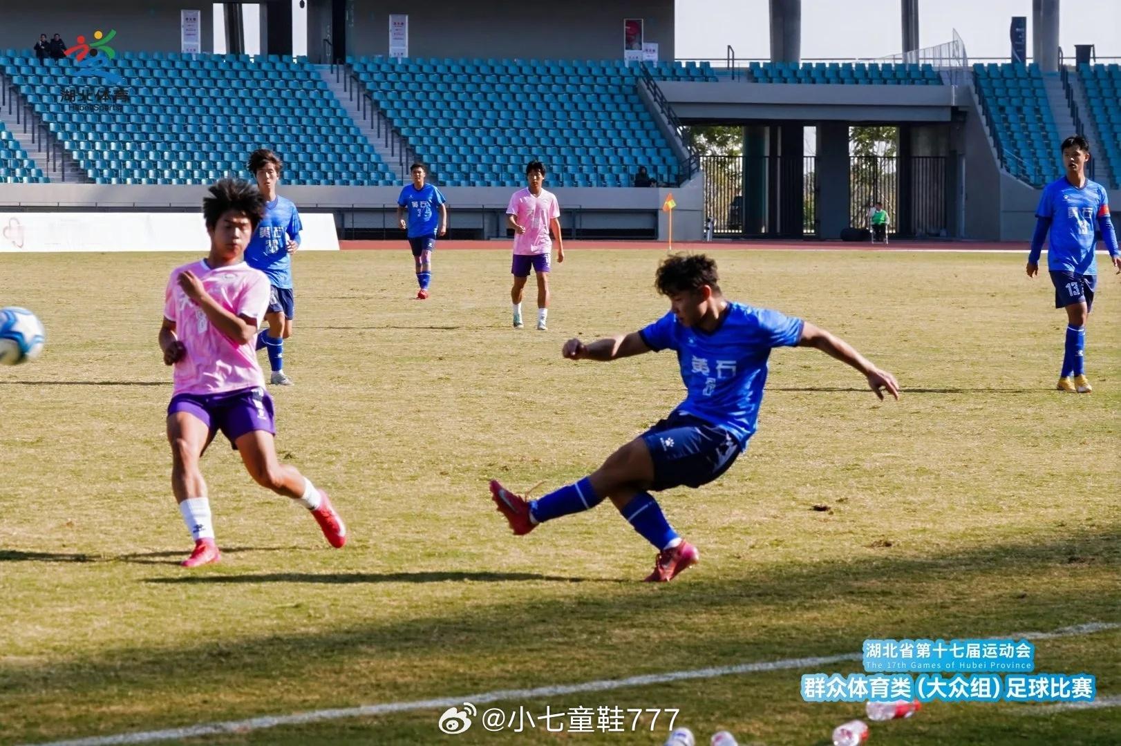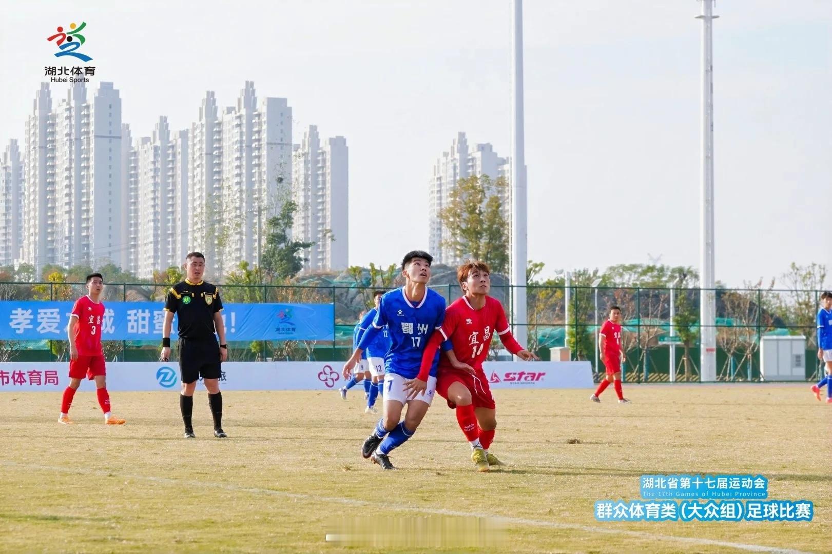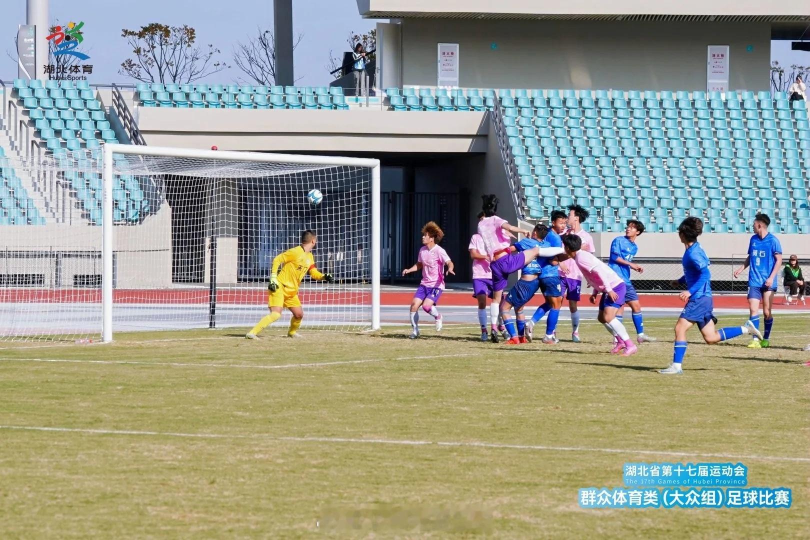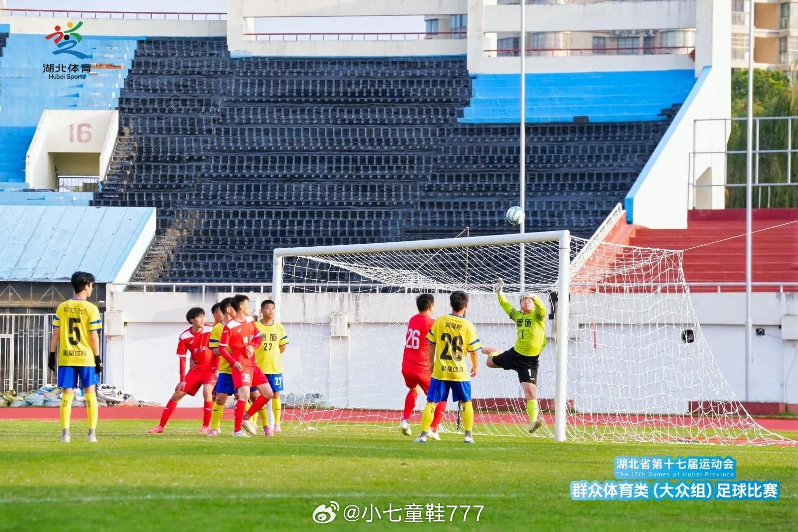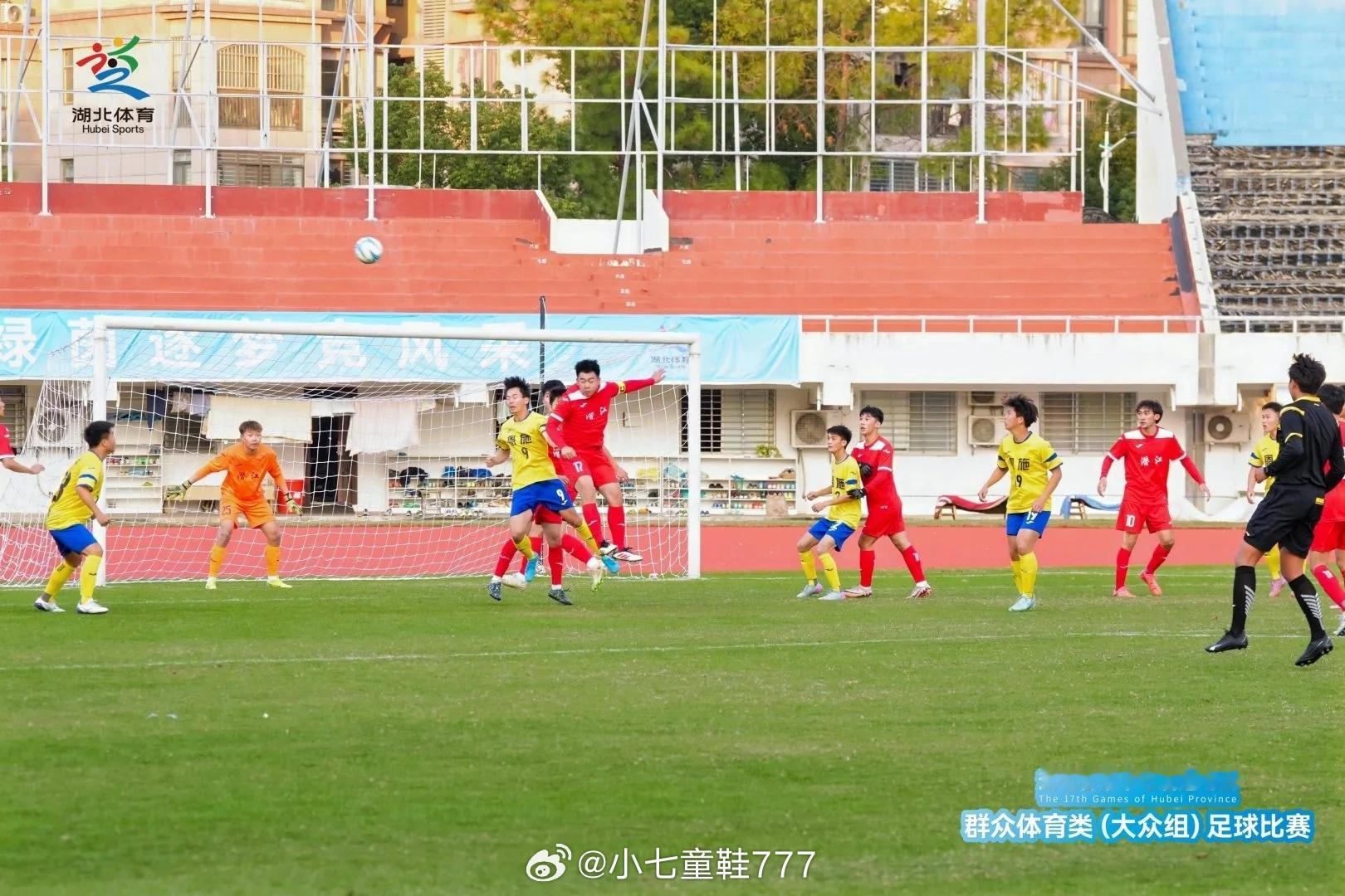湖北省第十七届运动会群众体育类(大众组)足球比赛小组赛第2轮战报天门0:6黄石【胡安别克x2、陈东、祝诚呈、陈真、江明刚】随州1:3黄冈【舒博 (OG) 、杨洁x2、卢强】仙桃0:6荆州【王翔x2、龚道军、张籽萌x2、王浩天】潜江2:1恩施【李大强/努尔艾力·乃比江 (OG)、肖乐】鄂州2:1宜昌【杨卓航、朱明昭/戴洋】荆门1:1咸宁【周泽钊/王智航】