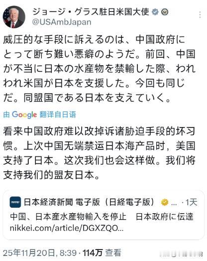 美国驻日本大使乔治·格拉斯11月20日发文表示,看来中国政府难以改掉诉诸胁迫手段的坏习惯。上次中国无端禁运日本海产品时,美国支持了日本。这次我们也会这样做。我们将支持我们的盟友日本。 说白了这就是美国拿着 “胁迫” 的帽子倒打一耙,自己才是全球胁迫界的天花板,还好意思给中国扣罪名? 美国驻日本大使乔治・格拉斯这通发言,简直把双标玩出了新高度,11 月 20 日跳出来指责中国 “诉诸胁迫手段”,还拿所谓 “中国无端禁运日本海产品” 说事,扬言要坚定支持盟友日本。 先不说中国对日本海产品的管控完全是出于食品安全考虑,毕竟核污染水排海这事全球都在反对,怎么到美国嘴里就成了 “无端胁迫”?要论胁迫,和美国比起来,中国这点 “操作” 简直是小巫见大巫,差了不止十个档次。 大家可别忘了,美国的航母都直接开到委内瑞拉家门口了,围着人家的海岸线耀武扬威,还公开喊话要颠覆马杜罗政府,这可不是口头说说,是真刀真枪的军事威慑。 一边派军舰施压,一边联合盟友搞制裁,冻结海外资产、切断贸易往来,把委内瑞拉折腾得经济濒临崩溃,这才是赤裸裸的胁迫吧?反观中国,从来没派过一兵一卒去他国门口挑衅,也没动辄就威胁颠覆别国政府,到底谁在搞胁迫,明眼人一看就清楚。 “胁迫” 这两个字,美国人说第二,世界上真没人敢说第一,先看看对自己的盟友,所谓的 “保护费” 可不是白拿的,逼着盟友提高军费占比,不达标就威胁要撤军、要制裁,这和强盗上门要钱有什么区别? 德国、韩国这些盟友,每年都得乖乖掏出巨额资金给美国驻军买单,稍有异议就会被美国各种敲打,这难道不是对盟友的胁迫? 再看看对其他国家,美国动辄就挥舞关税大棒,看谁不顺眼就加征关税,从中国到欧洲,从墨西哥到加拿大,没有哪个国家能逃过美国的关税胁迫。 更过分的是,美国还动辄实施单边制裁,把制裁当成打压异己的工具,全球近一半的国家都遭受过美国的制裁,这种动辄以经济、军事手段施压的做法,不是胁迫是什么? 美国口口声声说支持盟友日本,可美日之间所谓的 “盟友关系”,说到底不过是利益捆绑,一旦没有了利益,所谓的盟友转眼就能变成敌人。 可别忘了当年投向日本的 “小男孩” 原子弹,那可是美国亲手送给日本的 “大礼”,直接造成了数十万日本民众伤亡,现在美国和日本打得火热,可当年美国对日本的打击,可比任何所谓的 “胁迫” 都要惨烈得多。 美国现在拿 “支持盟友” 当幌子,本质上不过是想利用日本遏制中国,这种出于地缘政治私利的 “支持”,说到底还是对地区和平稳定的破坏。 中国对日本海产品的管控,完全是基于核污染水排海带来的食品安全风险,是为了保护中国民众的健康权益,这和所谓的 “胁迫” 没有半毛钱关系。 美国无视核污染水排海带来的全球环境和食品安全问题,反而倒打一耙指责中国,这种颠倒黑白的做法,实在是让人不齿,美国自己才是全球最大的胁迫者,却还好意思造谣抹黑中国,这种双重标准的嘴脸,真是暴露无遗。 以上仅为个人看法,大家觉得美国是不是全球最大的胁迫者?美日之间的盟友关系到底靠不靠谱?欢迎在评论区留下你的观点。