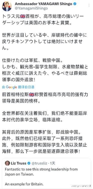 英国首相特拉斯11月19日发文表示,很高兴看到日本在台湾问题上展现出如此坚定的领导力。英国的榜样。 说白了这就是一场过气政客蹭热度、日本政客找错偶像的国际荒诞剧,拿别人的内政当自己的政治秀,还捧着个执政 45 天就被赶下台的失败者当宝贝,简直离谱到没边! 日本驻澳大利亚大使最近这番操作是真让人看乐了,放着国际上那么多有分量的声音不听,偏偏把特拉斯这号人物搬出来当靠山,不知道的还以为找到了什么政治大神,殊不知在国际政坛上,特拉斯早就成了 “短命昏庸” 的代名词。 这位前英国首相的执政生涯堪称一场灾难片,上台前喊着各种激进口号,结果刚推出所谓的 “迷你预算”,就直接把英国金融市场搅得天翻地覆。 英镑暴跌破 37 年纪录,股债汇集体崩盘,老百姓怨声载道,保守党内部也直接反水,短短 45 天就把她赶下了台,创下英国史上最短命首相的纪录,被媒体嘲讽 “任期还没生菜保质期长”。 现在的特拉斯在英国是什么地位?本国人民提起她都摇头,政坛上更是没人把她当回事,只能靠窜访台湾、发表极端言论刷存在感。 这样一个连自家事都搞砸的政客,居然被日本搞事的早苗一派奉为榜样,这操作真是让人笑掉大牙,难不成是想跟着她的脚步,也体验一把 “闪电下台” 的滋味? 说到英国,其实真要较真,有的是让他们自顾不暇的麻烦事,哪里还有闲心对别国内政指手画脚。 就说苏格兰独立运动,现在支持独立的民意一直居高不下。 苏格兰民族党虽然遇到些波折,但在 2026 年的议会选举中依然有望保持优势,加上苏格兰绿党的助力,独立派多数的局面大概率不会改变,越来越多的苏格兰人觉得 Westminster 政府不靠谱,对自己的执政能力失去信任,这独立的火苗可不是那么容易扑灭的。 再看马尔维纳斯群岛,阿根廷从来没放弃过主权要求,2025 年还专门发文重申对马岛及周边海域的主权,呼吁英国回到谈判桌,联合国也支持秘书长从中斡旋,当年英国靠武力占领的做法本来就站不住脚,现在国际社会越来越重视主权平等,阿根廷的诉求得到不少支持,这马岛之争怕是要长期拉锯下去。 还有北爱尔兰,回归爱尔兰的呼声这些年也没断过,内部的政治分歧和民意摇摆,让英国政府头疼不已。 这三张牌随便一张都够英国忙上几十年,要是真要认真应对,打 100 年都未必能解决,自家后院都快着火了,特拉斯还有闲心隔海给别人 “点赞”,这心也太大了点。 更讽刺的是,特拉斯这边刚发文力挺日本,英国现任首相斯塔默那边就传出明年 1 月底要访华的消息,这可是七年来英国首相首次访华。 要知道中国是英国第五大贸易伙伴,每年近千亿英镑的双边贸易额,对脱欧后经济疲弱的英国来说至关重要,斯塔默政府早就开始铺垫对华关系,恢复经济峰会、重启气候谈判,处处透着务实的态度。 一边是前任首相靠着极端言论刷存在感,一边是现任政府忙着修复对华关系争取实际利益,两相对比之下,特拉斯的那番表态更显得像个笑话,也让日本政客的 “抱大腿” 显得格外滑稽。 其实高市早苗现在的处境和当年的特拉斯有点像,推出的大规模经济刺激计划没有明确的资金来源,日本本身债务压力就大,加上涉台言论引发中日关系紧张,旅游业、水产出口都受了重创,东京股市连续下跌,日元汇率也跌到低点,市场信心早就不稳了。 这个时候不去想办法解决国内经济问题、改善外交环境,反而抱着特拉斯这个 “失败者榜样” 不放,实在让人看不懂。 以上仅为个人看法,不知道大家觉得特拉斯的支持是真帮忙还是帮倒忙?日本政客这番操作到底图什么?欢迎在评论区留下你的观点。