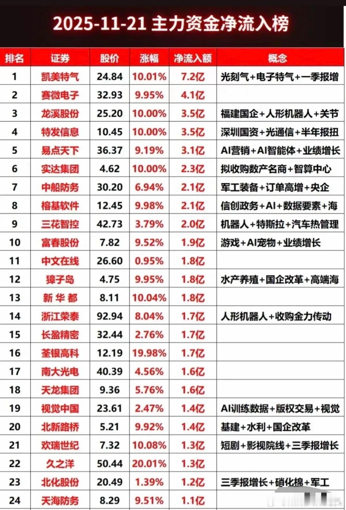 11月21日的主力资金净流入榜梳理分析!今天资金集中涌向AI、人形机器人、半导体、军工、国企改革等热门赛道;多股实现涨停(含20cm),头部个股(如凯美特气)净流入超7亿,部分个股涨幅平淡但资金逆势布局,整体市场情绪偏向题材+成长股。个股分析1. 凯美特气:股价24.84元涨停,主力净流入7.2亿居首,主打光刻气、电子特气,叠加一季报增长,是半导体材料赛道热门标的,行业景气+业绩催化下,成为当日资金抢筹核心。2. 赛微电子:股价32.93元近涨停,净流入4.1亿,结合其过往属性,大概率涉及半导体、MEMS赛道,当日资金关注度高,短期走势强劲。3. 龙溪股份:股价25.20元涨停,净流入3.5亿,沾福建国企、人形机器人关节概念,人形机器人赛道热度+国企属性,成资金青睐标的。4. 特发信息:股价10.45元涨停,净流入3.5亿,属深圳国资+光通信+半年报扭亏,国资背景+业绩改善+通信热度,共同推动资金流入。5. 易点天下:股价36.37元涨9.19%,净流入3.1亿,主打AI营销、AI智能体+业绩增长,AI应用赛道活跃+业绩加持,获资金认可。6. 实达集团:股价4.62元涨停,净流入2.3亿,拟收购数产名商+智算中心,智算中心是AI基建热门,收购预期催化资金流入。7. 中船防务:股价30.20元涨6.94%,净流入2.1亿,属军工装备+订单高增+央企,军工订单景气+央企属性,资金逢高布局。8. 榕基软件:股价12.45元近涨停,净流入2.1亿,沾信创政务+AI+数据要素,政策支持赛道+AI应用,资金关注度提升。9. 三花智控:股价42.73元涨3.79%,净流入2.0亿,主打机器人+特斯拉+汽车热管理,绑定高景气赛道,资金逆势布局。10. 富春股份:股价7.82元涨9.52%,净流入1.9亿,沾游戏+AI宠物+业绩增长,AI+游戏热门+业绩改善,走势强劲。11. 中文在线:股价26.60元仅涨0.95%,净流入1.8亿,虽涨幅平淡,但资金逆势流入,或提前布局其IP+AI题材。12. 獐子岛:股价4.75元近涨停,净流入1.8亿,属水产养殖+国企改革,国企改革+赛道异动,资金推动上涨。13. 新华都:股价8.11元涨停,净流入1.8亿,结合零售+国企属性,或受益消费复苏/国企改革预期,资金推涨停。14. 浙江荣泰:股价92.94元涨8.04%,净流入1.7亿,沾人形机器人+收购金力传动,赛道热度+收购动作,吸引资金。15. 长盈精密:股价32.44元涨2.76%,净流入1.7亿,属消费电子+新能源赛道,涨幅温和但资金逢低布局,看好后续景气。16. 荃银高科:股价12.19元20cm涨停,净流入1.7亿,属农业育种赛道,政策/行业异动催化,资金推20cm涨停。17. 南大光电:股价40.39元涨4.56%,净流入1.6亿,属半导体材料(如光刻胶),行业景气高,资金持续关注。18. 天龙集团:股价9.36元涨5.76%,净流入1.6亿,结合广告营销+化工属性,或受益细分需求改善,资金小幅布局。19. 视觉中国:股价23.61元涨2.47%,净流入1.4亿,沾AI训练数据+版权交易,AI数据需求提升,资金逐步布局。20. 北新路桥:股价5.21元近涨停,净流入1.4亿,属基建+水利+国企改革,政策支持赛道+改革预期,资金推涨停。21. 欢瑞世纪:股价7.32元涨停,净流入1.3亿,沾短剧+影视+三季报增长,短剧热度+业绩增长,资金推涨停。22. 久之洋:股价50.44元20cm涨停,净流入1.3亿,属军工电子赛道,军工活跃度提升,资金推20cm涨停。23. 北化股份:股价20.49元涨1.39%,净流入1.2亿,沾三季报增长+硝化棉+军工,业绩支撑+军工属性,资金逢低布局。24. 天海防务:股价8.29元涨9.51%,净流入1.1亿,属军工船舶赛道,军工热度延续,资金推动上涨。总结今日主力资金围绕“高景气赛道(AI/人形机器人/半导体)+题材预期(国企改革/收购)+业绩增长”布局,多股实现涨停,头部个股抢筹集中,部分标的虽涨幅温和但获资金逆势布局,整体市场情绪偏向成长型题材股。本文涉及资讯、数据等内容来自网络公共信息,仅供参考,不构成投资建议!
