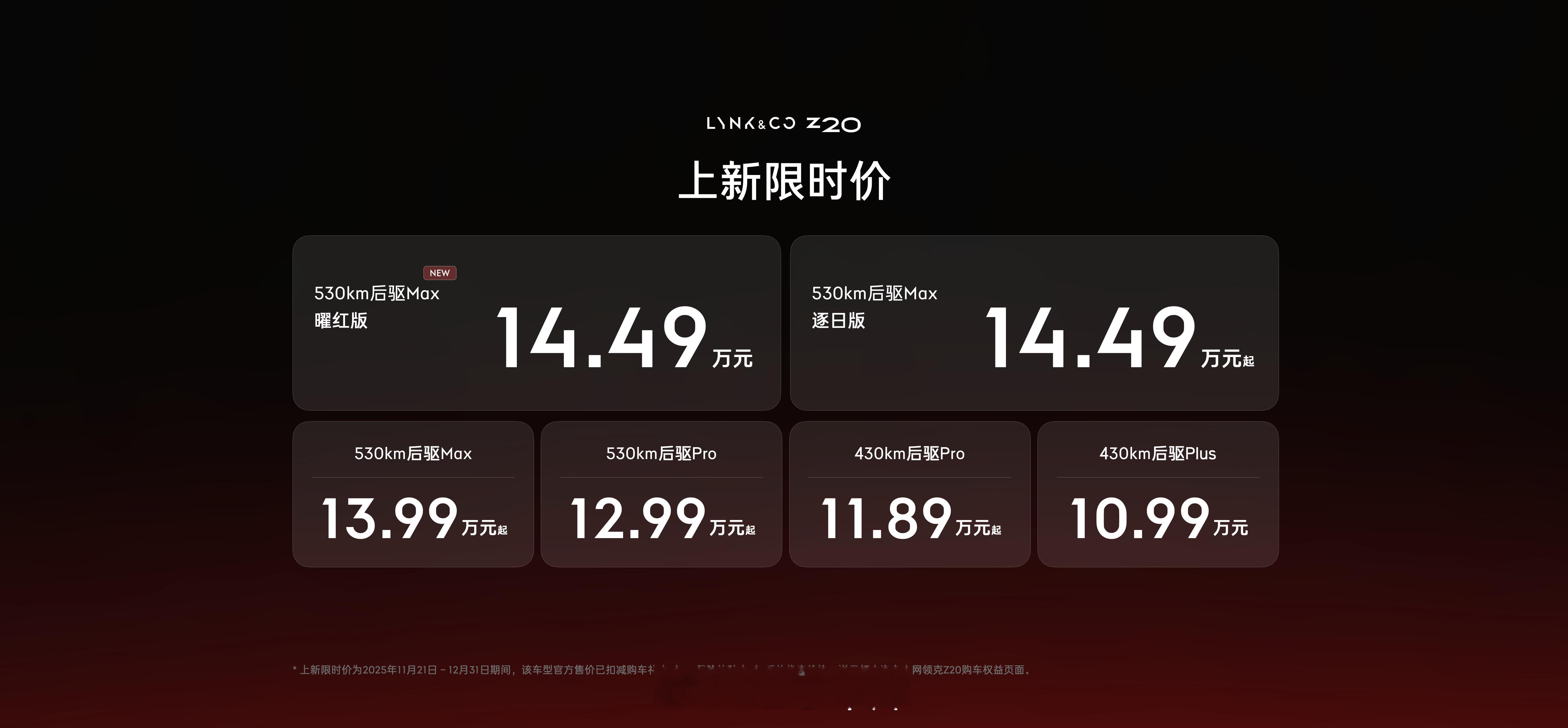 领克Z20曜红版在广州车展正式上市,限时售价14.49万元。Z20曜红