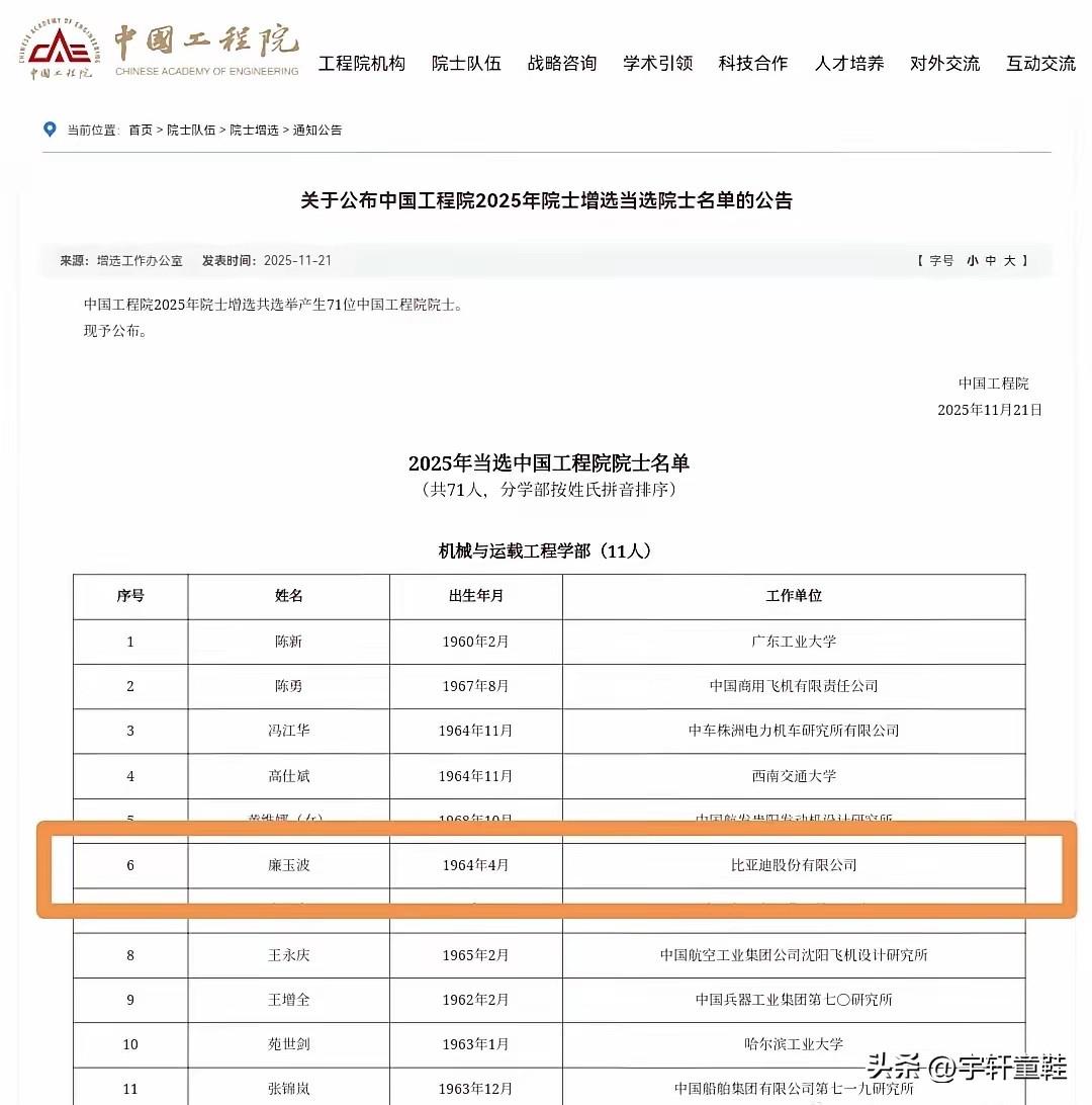 比亚迪:“我出个……” 友商:“你说,你到底出啥?” 比亚迪:“我出个廉玉波!” 友商:“呃,跟不起,等我再努力几年!” 这个时候,就很需要那两个动不动喜欢“阴阳”的车企也跟一下了! 话说,比亚迪也是真不容易啊,熬了这么多年终于熬出个院士了,但还得加把力才行,因为一个院士还是堵不住喷子的嘴![呲牙]