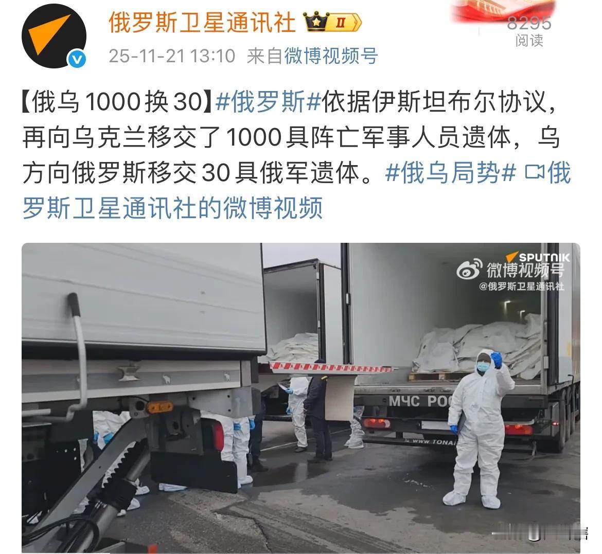 【俄罗斯再向乌克兰移交1000具乌军士兵遗体】 据《俄罗斯卫星通讯社》消息,俄乌双方根据在土耳其伊斯坦布尔达成的协议,双方近期完成了一次阵亡士兵遗体交换工作。 其中,俄罗斯向乌克兰移交了1000具乌军阵亡士兵遗体,而乌克兰则向俄罗斯移交了30具俄军阵亡士兵遗体。 从双方交换数据看,此次俄乌士兵遗体交换比达到了1:33,虽然该数据无法具体衡量双方在战场中所损失的士兵人数,但是依然可以反映出当前战况的激烈程度