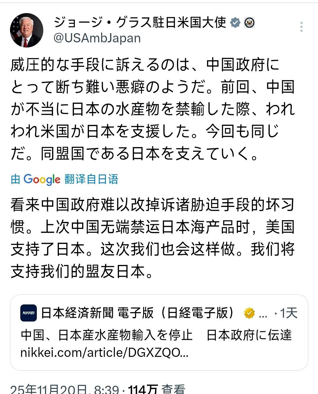 美国驻日本大使乔治·格拉斯今天(11月20日)发文写道:“看来中国政府难以改掉诉诸胁迫手段的坏习惯。上次中国无端禁运日本海产品时,美国支持了日本。这次我们也会这样做。我们将支持我们的盟友日本。” 大使的一番言论听起来义正辞严,但细究之下,却显得颇为可笑。 美国这样的国家,本身在国际贸易中常常采取高压手段,“胁迫”,似乎早已成为其散布影响力的惯用手法,而如今对中国指手画脚,未免显得有些讽刺。 尤其是“支持日本”这句话,听上去充满了熟悉的套路感,仿佛是一句拍胸脯的承诺,但又缺乏足够的实际行动支撑。 事实上,上一次中国针对日本海产的限制,美国所谓的支持不过停留在表面,没有拿出有真正意义的市场资源来帮助日本渡过难关。 回顾过往局势,美国的支持到底有多少诚意,早已显而易见。 当初日本遭遇来自中国的经济制裁时,美国虽然口头上宣称“全力站在盟友这一边”,但在贸易实际操作层面,他们并未承担过多的责任。 反观自己却通过高额的贸易关税和关税壁垒,对于日本的出口商品毫不留情地限制。 这种“明里友好、暗中制约”的手法,才真正揭示了所谓盟友的本质关系。 美国驻日大使乔治·格拉斯的言论,更多是一场舆论战的序幕,而非实际支持行动的开始。 更不可忽视的是,中国之所以采取措施,背后自有其原因。 无论是食品安全问题,还是国民健康维护,中国政府在进口日本海产品方面的顾虑,都值得被认真对待。 而美国选择在这个时间节点,单方面将事件上升为“胁迫”的政治问题,并对中国进行毫无依据的指责,无疑是用情绪化的言辞掩盖事实。 今年以来,中日关系微妙,而美国也正试图利用这种局势,通过挑拨离间攫取地缘政治上的好处。 这种借题发挥的手法,既发动了信息吸引力,又激化了敏感民族情绪。 从更大的历史视角来看,类似的言论和行动并非首次出现。 近年来,针对中国的抹黑宣言常见于西方政客的演讲中,而试图“团结盟友”针对中国的策略,也已成为美国对外政策的一大老套路。 殊不知,这种用盟友作为“棋子”替自己站台的操作,反倒激起众多国家对美国信任度的质疑。 毕竟“支持”如果继续停留在口头和外交辞令当中,长期以来的基础合作关系只会日渐疏离。 以上种种,不禁让人思考:尤记得在过去漫长的国际经济争端中,真正能够为对手提供实现共赢机制的行为,往往建立在平等与理解的基础上。 而单纯依靠喧嚣化的指责,能带来的不仅是更多的裂痕,更会压缩解决问题的空间。 美国的做法不止一次地表明,其外交方式的核心更多是服务于自身利益诉求,而非解决具体问题。 日本位于风口浪尖,但真实的海产贸易数据却可能让美国的宣传显得底气不足。 正如人们常说的那样,真正的朋友从行为而非语言中体现。 美国对日方的态度,看似保护属下,但更多是一种自利的算计。 每一次“高姿态”的表态背后,都伴随着经济或军事战略。 而这种单以“胁迫”标签化他国行为的做法,不仅会让该国失去自己的立场受国际共识的信任,也更难扮演负责任的大国角色。 问题的解决,关键还在于如何公正、理性地看待双方立场。 摆脱“冷战思维”,才是避免争端升级的出路之一。 在当下,国际政治博弈风云莫测,大国之间的较量时而激烈,但对民众来说,则希望看到更多维护安全稳定的务实政策。 这也给某些国家敲响警钟:口号终究是短暂的,实际的行动和影响才是决定合作深度的关键。 最后,这场争议给我们留下了什么样的启示? 美国虚情假意式的“站队”,究竟还能骗过多少国家? 更重要的是,面对瞬息万变的国际环境,这样的言论要真正信服于世界恐怕还有相当的距离。 你认为,大国之间该如何理性对待争端,才能引导这场棋局走向和平和繁荣的正轨? 信源:美国突然高调“挺日”,并非为了日本,而是害怕中国制度型反击-新浪·财经头条