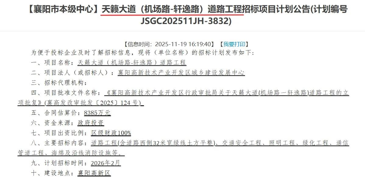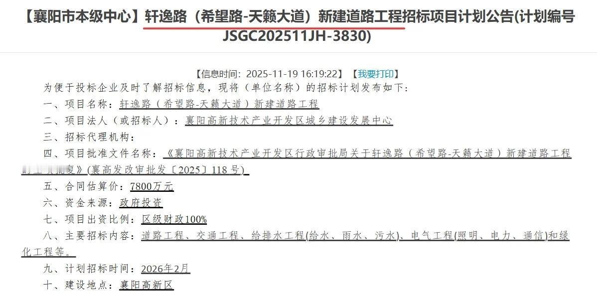 襄阳楚能新能源配套道路工程 天籁大道(机场路-轩逸路)道路工程 轩逸路(希望路-天籁大道)新建道路工程 这两条路计划2026年2月招标,是220亿楚能新能源项目的配套基础工程。 襄阳 明年2月招标,基本上工厂也快完工了吧,不然工厂都建好了,旁边市政道路不修好这算什么事。[偷笑]