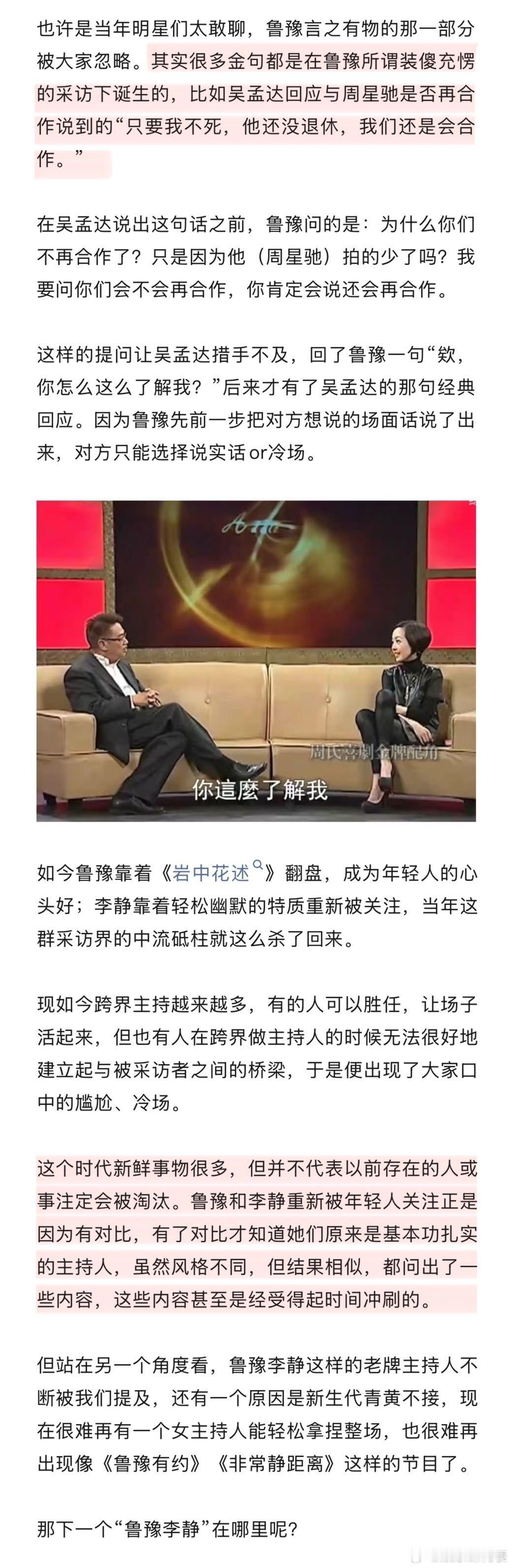 鲁豫早年虽因“不刻意暖场”“口头禅出圈”遭吐槽,但重看才知其提问巧思——采访章子怡时共情舞蹈求学经历,追问吴孟达时预判场面话,逼出“只要我不死,他还没退休就会合作”的经典金句。如今凭《岩中花述》翻盘圈粉年轻人,在跨界主持频现冷场的当下,她扎实的访谈功底更显珍贵。