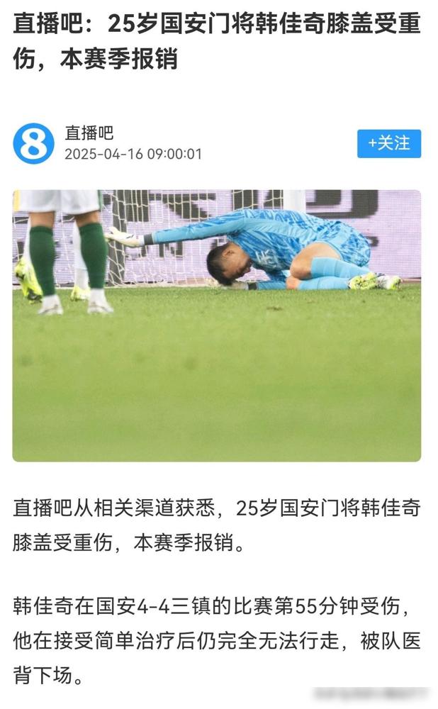 晴天霹雳!国安门神韩佳奇赛季报销,争冠之路突遭重创!昨晚中超第7轮,国安客场对阵
