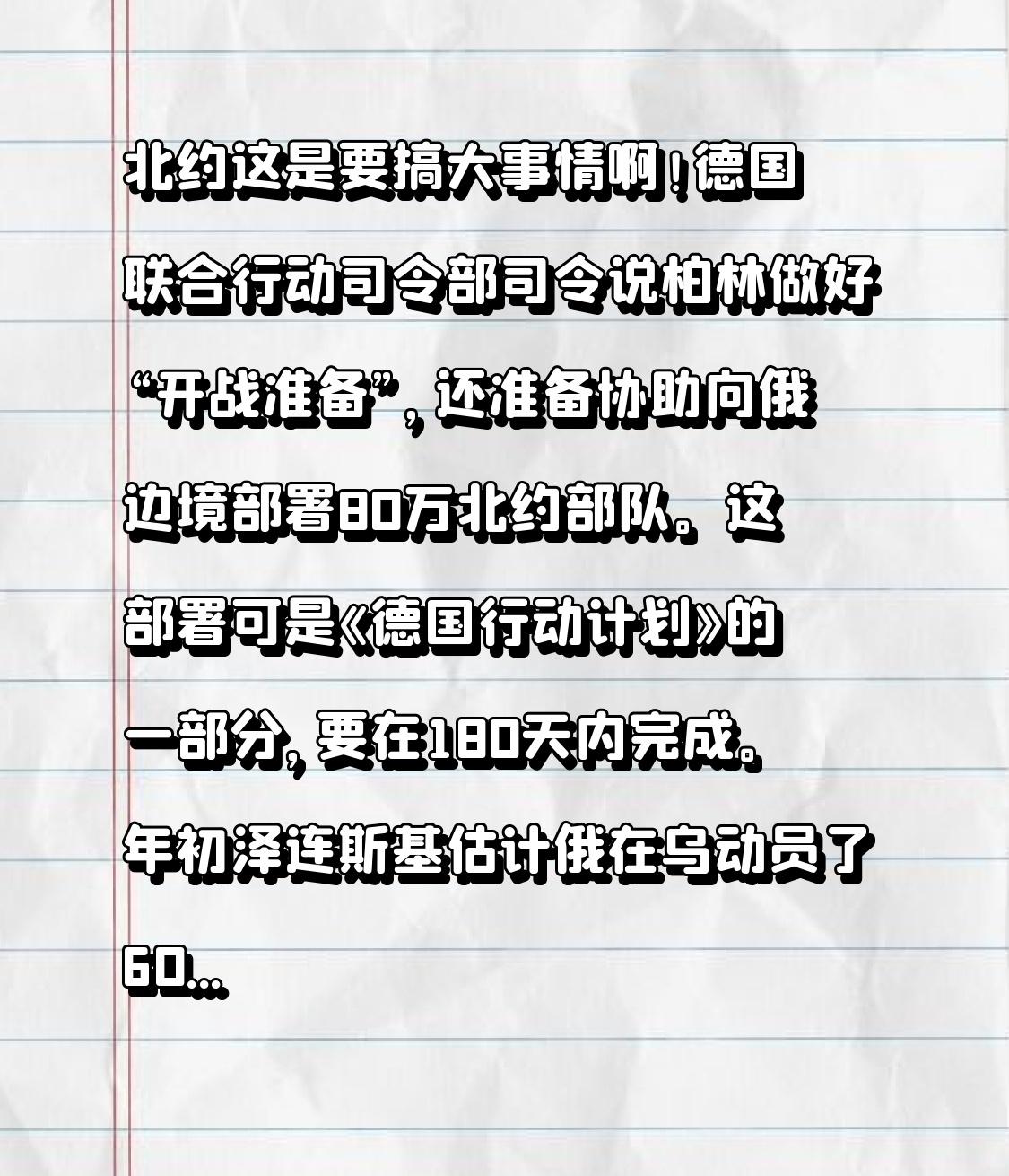 柏林:北约准备80万兵力,走拿破仑老路? 北约这是要搞大事情啊!德国联合行动司令部司令说柏林做好“开战准备”,还准备协助向俄边境部署80万北约部队。这部署可是《德国行动计划》的一部分,要在180天内完成。年初泽连斯基估计俄在乌动员了60万军队。 索尔弗兰克还说俄“最早明天”就能发动进攻,感觉是在制造紧张氛围。而且德国官员最近都在强调所谓的俄罗斯威胁,10月还通过军费翻倍方案。80万兵力调动不易,得绕好多地方。俄罗斯外长拉夫罗夫回应,让人联想到纳粹复苏迹象。北约这是想干嘛?是真有威胁,还是另有企图呢。 一个纳粹复活与一个二战至今霸权国共同对俄罗斯下狠手?