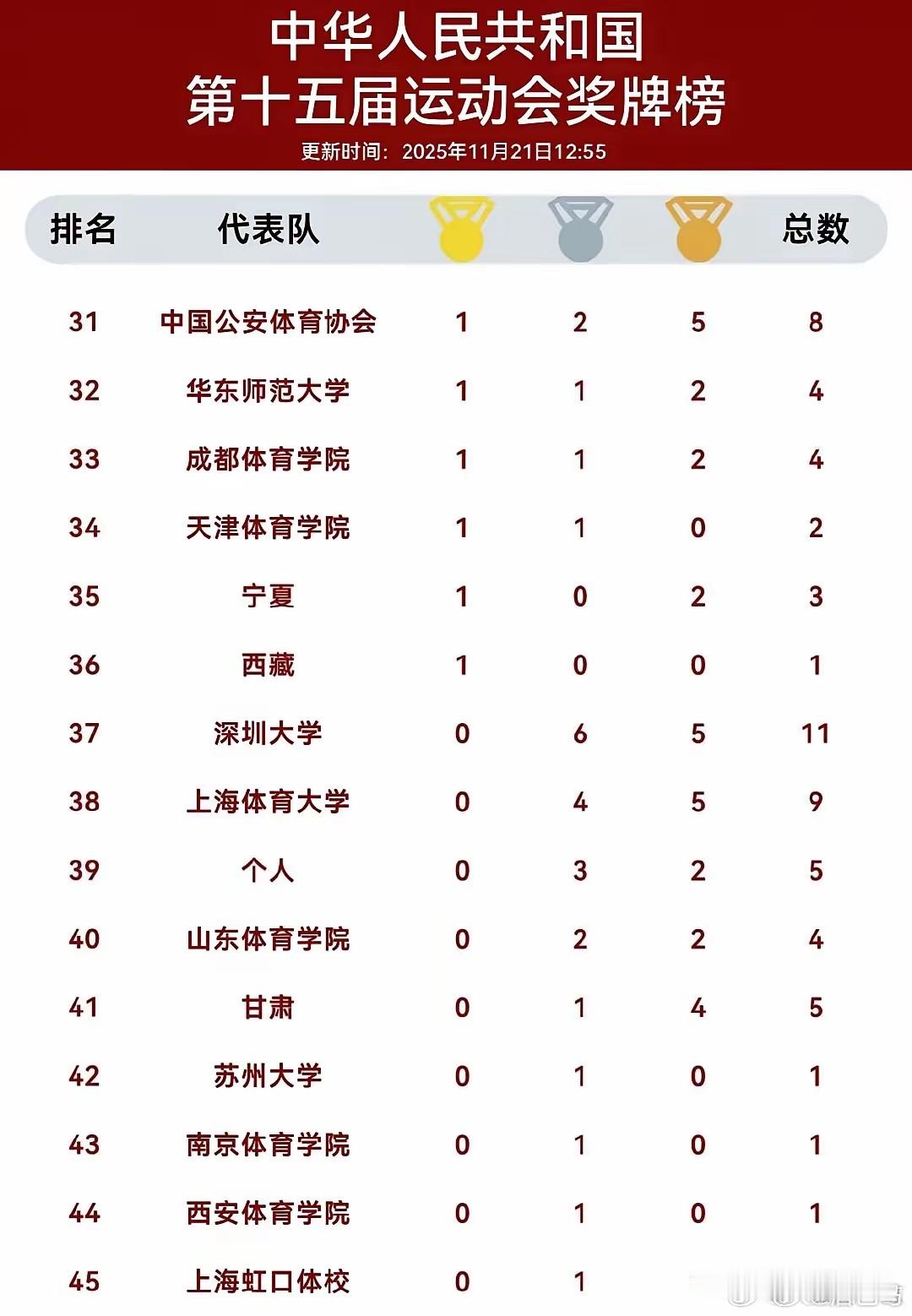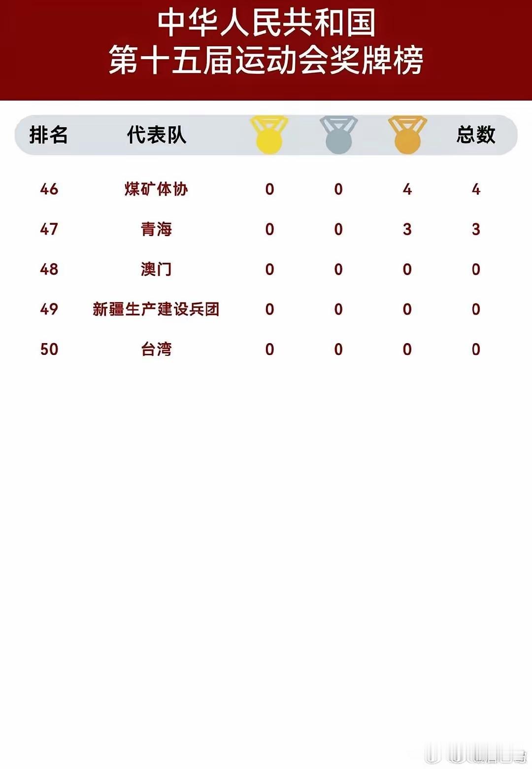 截止今天闭幕式前,全运会奖牌榜出炉,山东以49金排名第1,东道主广东和浙江以44金排名2、3,江苏以38金排名第四,而作为传统体育大省的辽宁以11金排名12!广西紧跟其后,以10金排名13!有点牛!