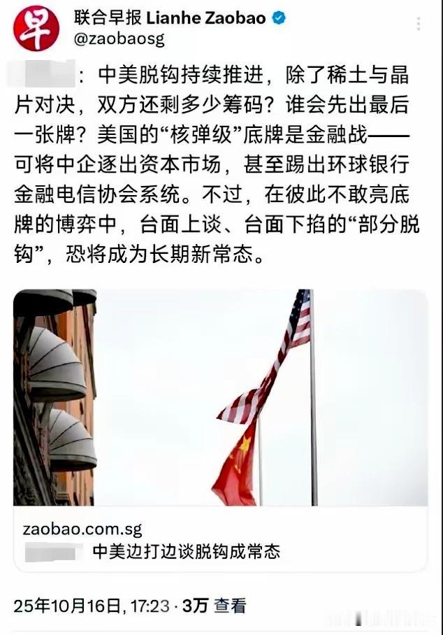新加坡联合早报:芯片和稀土都不是中美的最后底牌。美国的“核弹级”一张牌是把中企逐