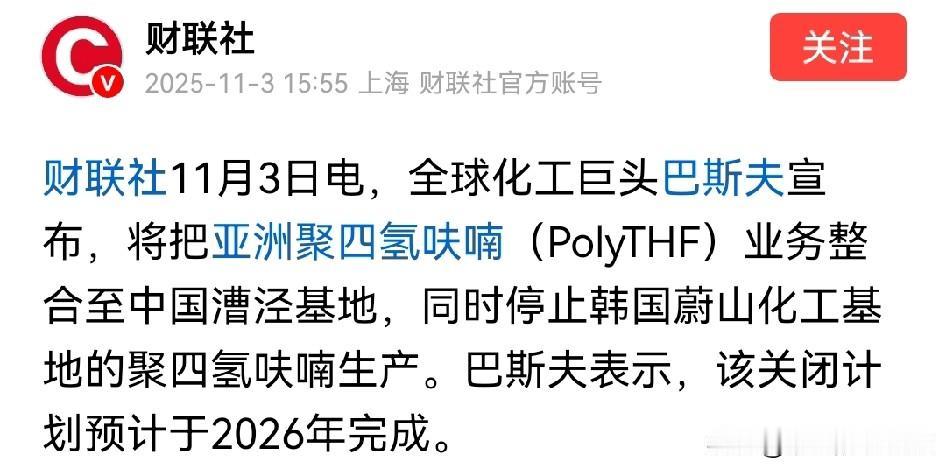 巴斯夫关停韩国聚四氢呋喃生产,把所有亚洲产能搬迁至中国。 可以看出全球化工巨头巴斯夫,正在着手整合资源,以降低成本,抵御未来的不确定性。 当然巴斯夫也非常聪明,知道在也没有比中国更适合例如巴斯夫这种国际巨头实现工业4.0的目的地了。 朋友们,你们对此事怎么看? 欢迎大家在评论区探讨,留言…[送心]