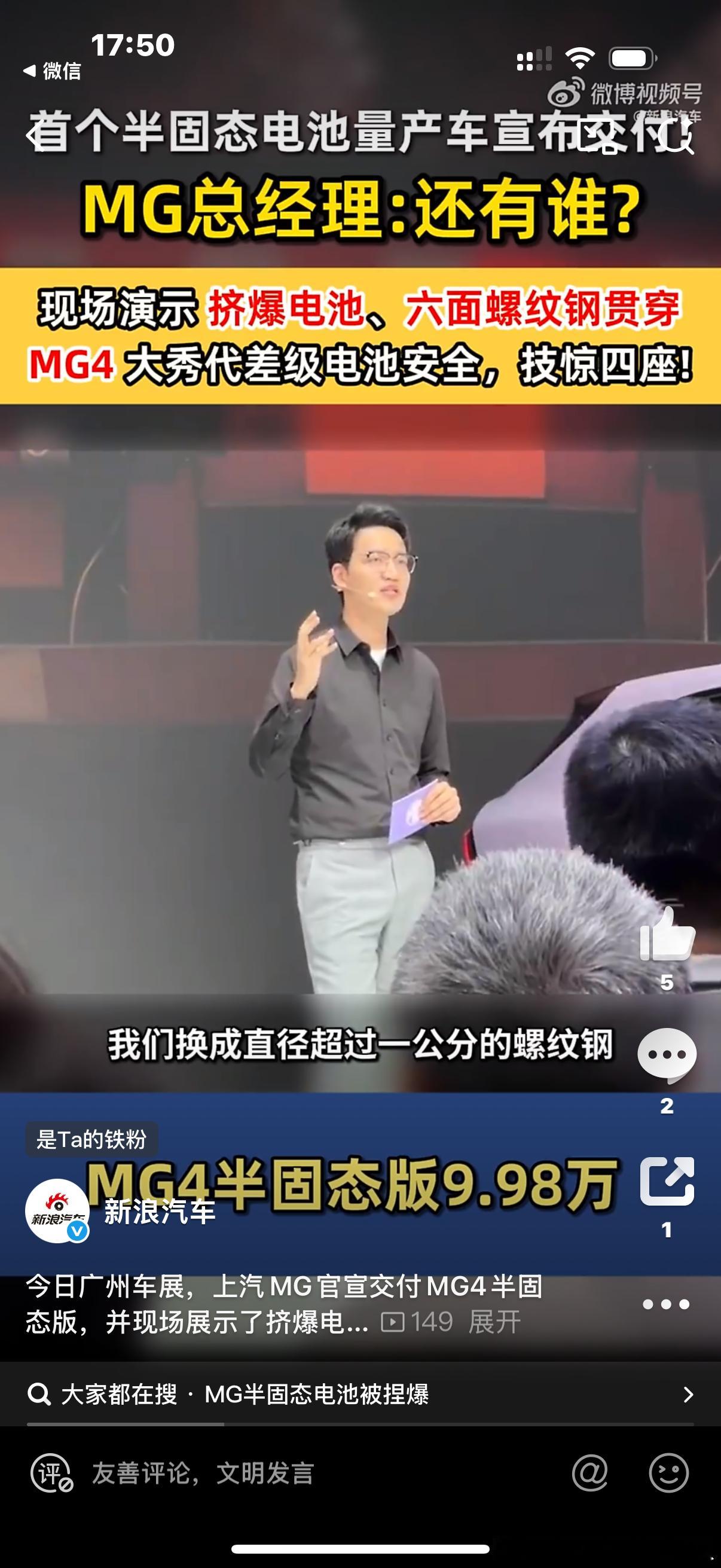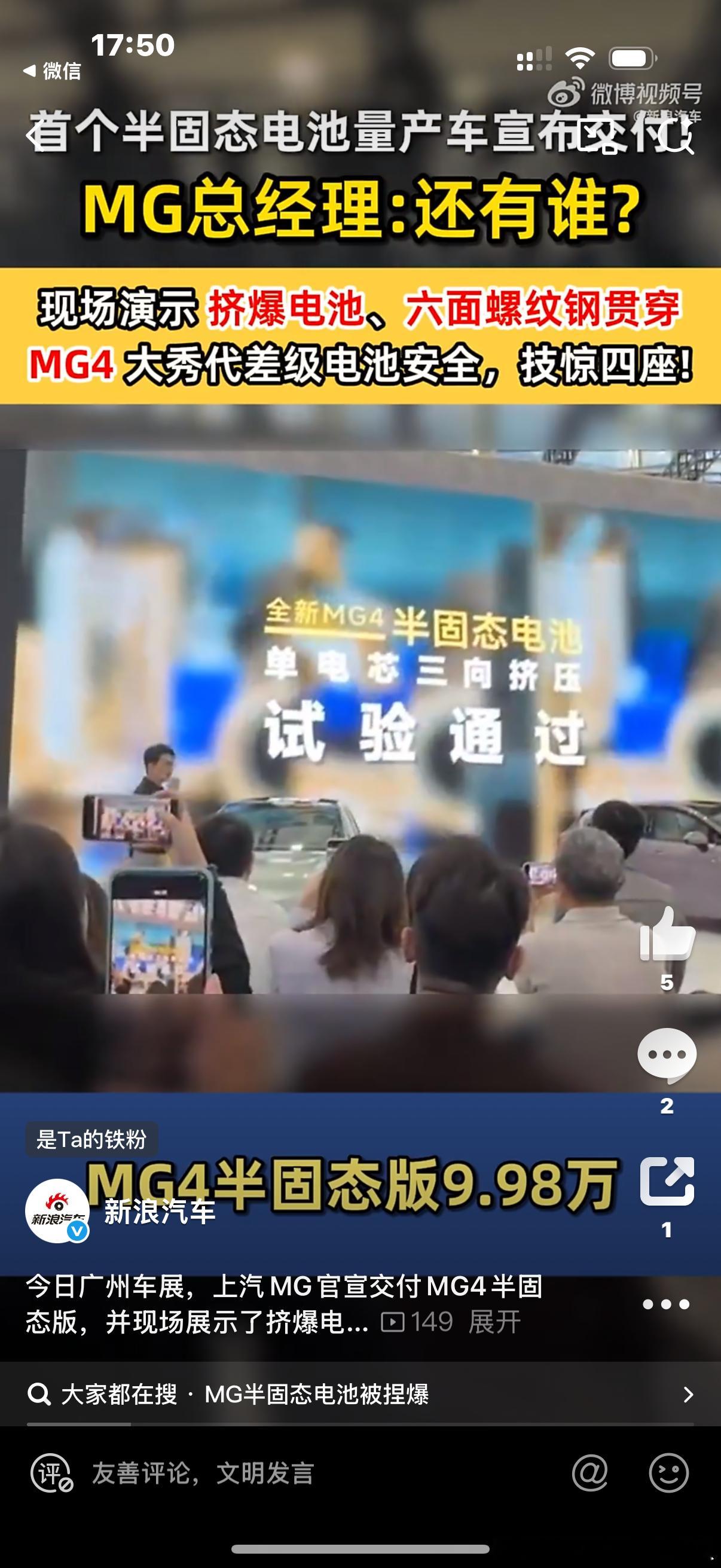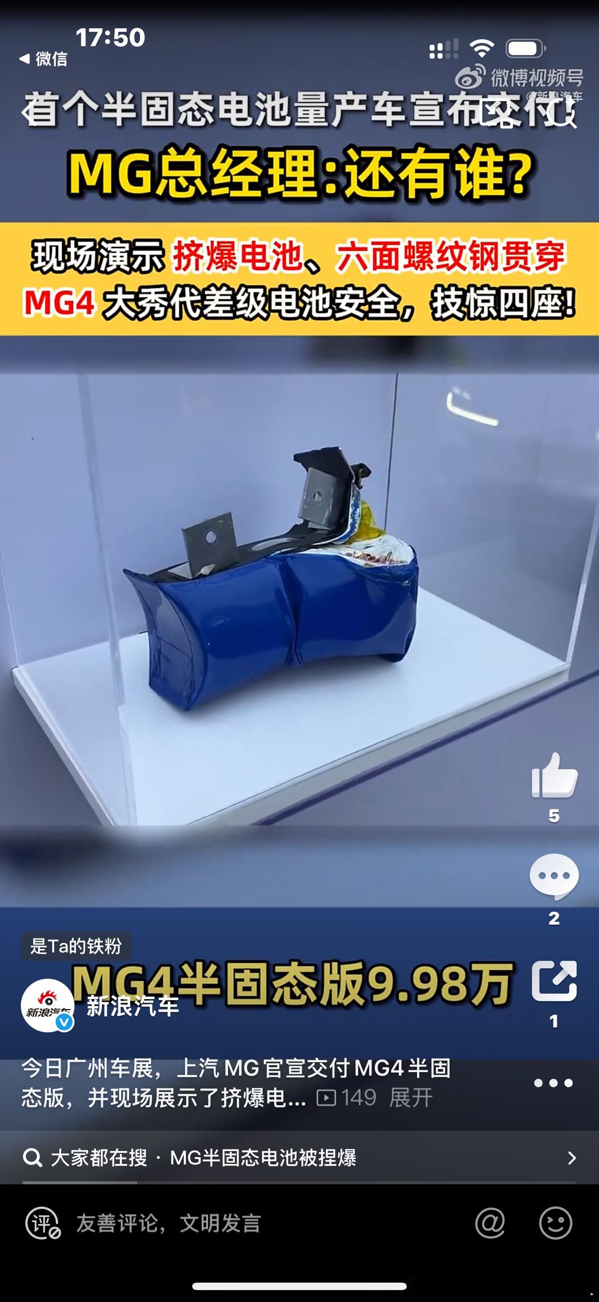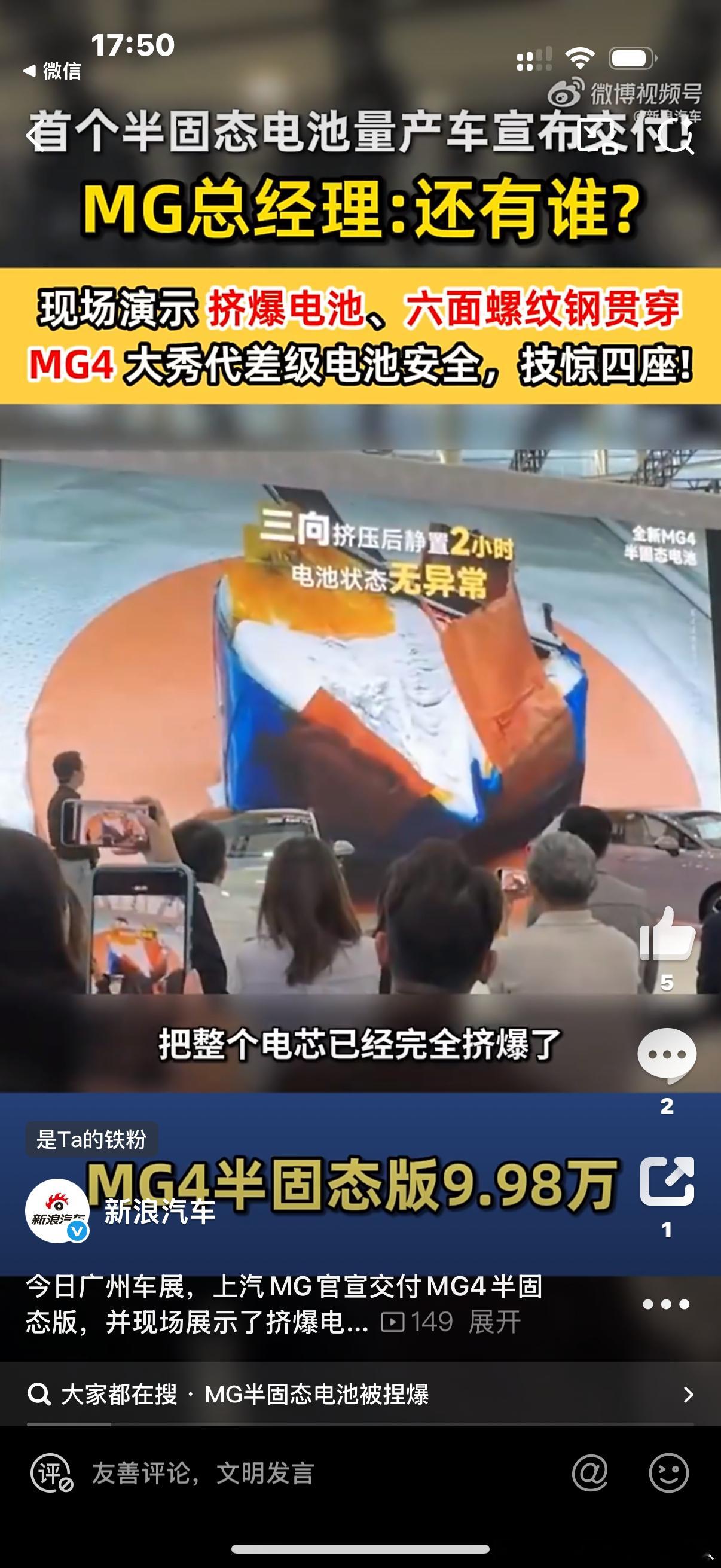 在 的舞台上,MG4半固态安芯版无疑是最能“抢戏”的主角之一。不是因为价格,而是它把本该只存在于技术发布会、实验室里的极限安全测试,赤裸裸地搬到了公众面前——挤压、穿刺、六面螺纹钢“扎心”,换作传统三元锂或部分磷酸铁锂,早已“情绪失控”。而MG4半固态,却稳得像台演示机:不热失控、不起火、不冒烟,直接对标行业最苛刻的安全红线。 从我的角度看,MG这块半固态电池真正的价值不只在结果,而在路径。它背后是600多位行业专家、20多年材料体系演进、上千项专利积累——不是突击式堆砌,而是体系化研发的自然结果。更关键的是:MG没有选择“技术在旗舰车型上首发”,而是把它装进了一台售价不到10万元的两厢车里。这种打法,才叫真正的“技术平权”。至于它有没有竞争对手?如果单看价格段,当然有一票强敌;如果单看半固态概念,也有不少同行正在研发。但在“极限安全可公开验证”这件事上,MG4目前几乎是独一份。这不仅是讲故事,而是让测试成为内容,让安全成为产品力的明面。当然,半固态不是“终极形态”。它是向全固态过渡的重要节点:更高能量密度意味着更长续航,固态隔膜意味着更高安全上限,MG现在抢的,是这个时代节点的“首发位”。谁先把技术量产并跑通,谁就占据下一轮竞争的起跑线。 MG4半固态安芯版不是“卷价格”,而是“卷技术周期”。而这种卷,才是消费者真正受益的那种。