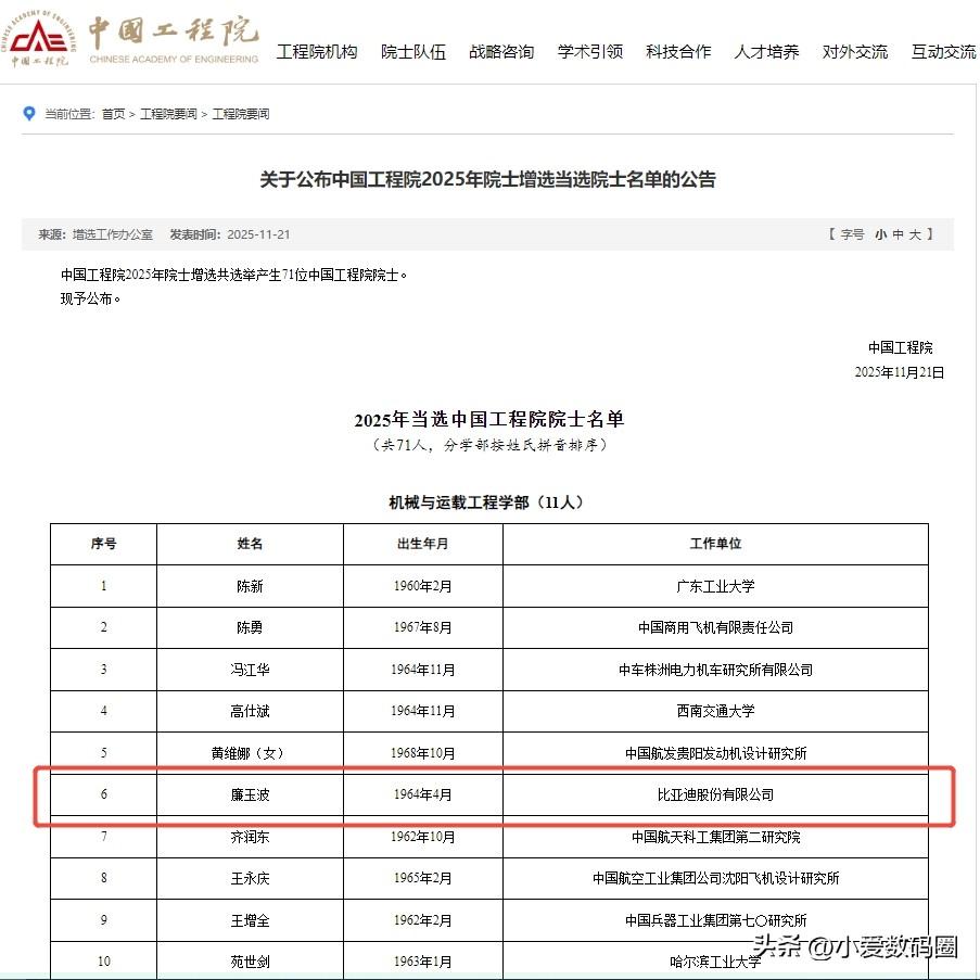 比亚迪诞生院士!什么是工程师文化?什么是技术为王?这就是一个证明。 11月21日,中国工程院公布新晋院士名单,比亚迪集团首席科学家、汽车总工程师、汽车工程研究院院长廉玉波当选,以技立身荣膺院士,成为新能源汽车领域的重要代表人物。 作为比亚迪技术体系的奠基者之一,廉玉波带领团队在电机电控、电池管理、整车架构等核心领域实现突破,可以说完整见证了中国新能源汽车从跟跑到领跑的全过程。 我觉得廉院士此次当选不仅是对其个人科研生涯的肯定,也是对比亚迪“技术为王、创新为本”发展路径的印证,而也在数十万研发工程师的共同努力下,中国汽车产业正迎来跨越,我也是见证了历史。