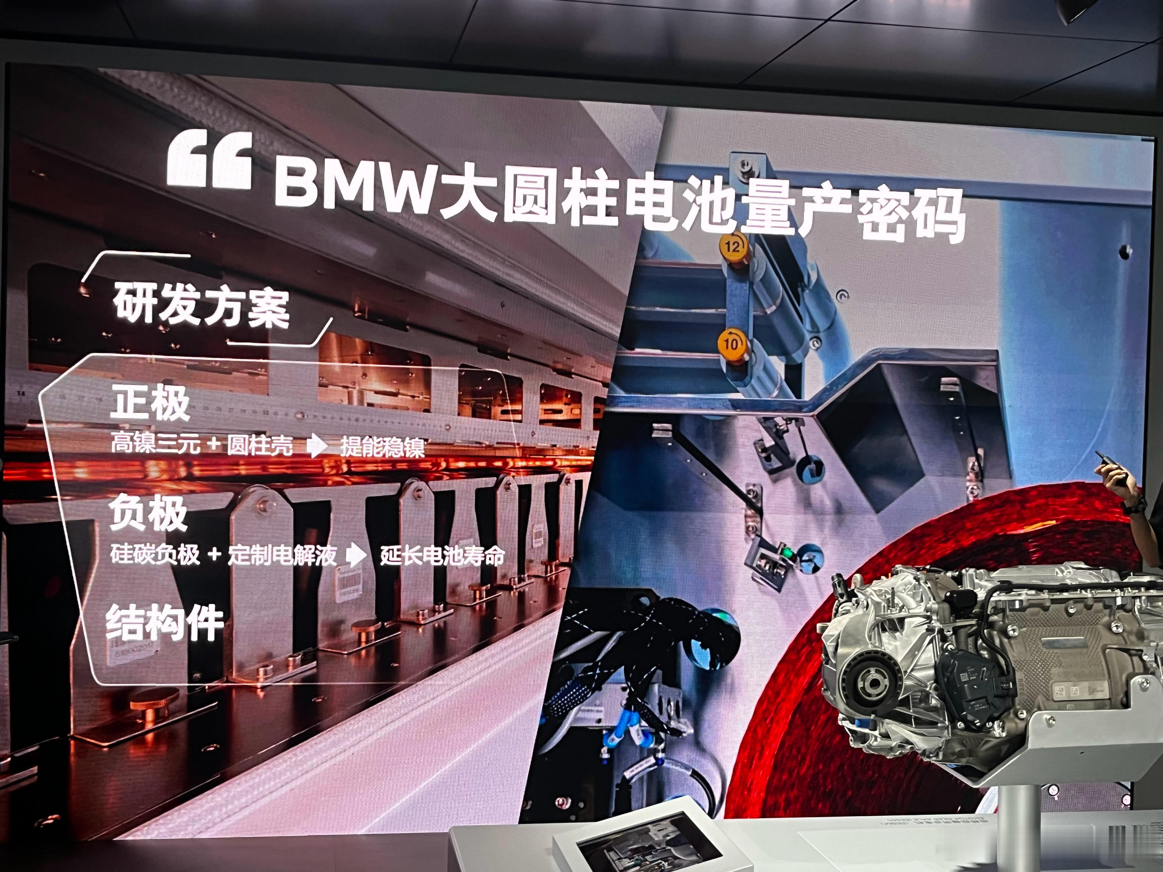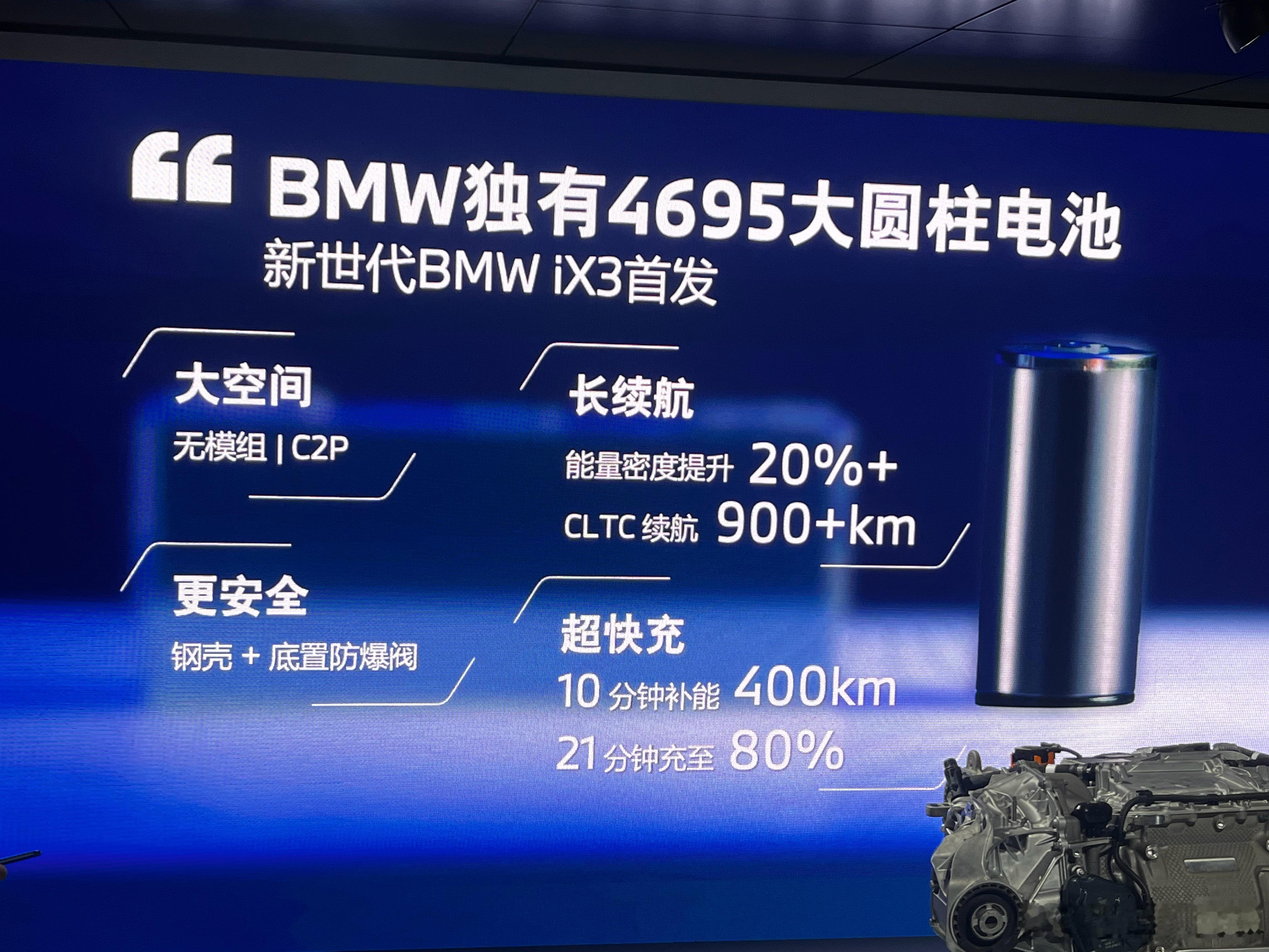 今天认真学习了一下宝马的新世代技术,这次宝马首秀了电驱系统,宝马的大圆柱电芯也第一次见到实物。宝马独有的4695大圆柱电芯(直径46mm,高度95mm),能量密度相比前代产品提升高达20%。其中,正极采用高镍三元 +圆柱壳,提能稳镍。负极上,硅碳负极+定制电解液,延长电池寿命。结构上,将泄压阀在底部,防止爆炸。在制造上,以全极耳代替双极耳,前一天发布的奔驰也是这样。由此,降低内阻和热量提升效率。这个电池还有很不错的充电效率,10分钟补能 400km,21分钟充至 80%。配合宝马自研的“能量智控系统”,实现了更智能、更安全的电池管理。新世代电驱系统还搭载了行业独有的励磁同步电机与异步电机组合,使电机能量损耗降低高达40%,也让整车效率提升20%。在此高效基础之上,国产新世代BMW iX3的CLTC综合续航里程突破900公里;同时,800V高压平台更将其充电效率推向新高度,仅需10分钟即可补能高达400公里,让日常出行告别电量焦虑。数字很多,大家可能感觉也不深刻,预计实车上市以后就可以很清楚的体会到这些技术带来的体验上的差异。这是宝马非常重要的一款车,决定了在未来几年的电车市场命运。