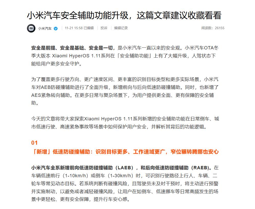 小米汽车:安全是前提、安全是基础、安全是一切,是小米汽车一直以来的安全观。 今天,雷军转发了小米汽车发布了一篇文章,主要内容是讲小米汽车安全辅助功能升级内容。 可以看到,最近无论是雷军本人还是小米汽车官方,都在强调安全,而前几天因为这个事情,雷军还有网友“争论”了起来。 目前,小米官方还没有具体公布其辅助驾驶系统新版本的推送时间,就看真正使用后会是什么样的情况吧!