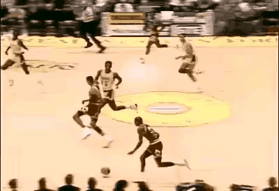 一直没搞明白,这一招如此无解,乔帮主怎么只用过这一次呢?让对手怎么防?没法防。盖都盖不了,球被他拉到后脑勺去了。这需要异于常人的滞空和核心力量。很奇怪,后来再也没用过。真是进攻万花筒。
