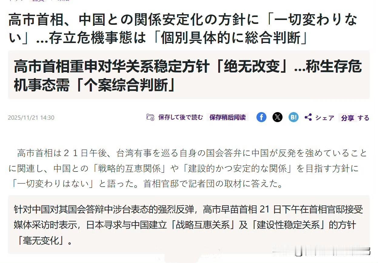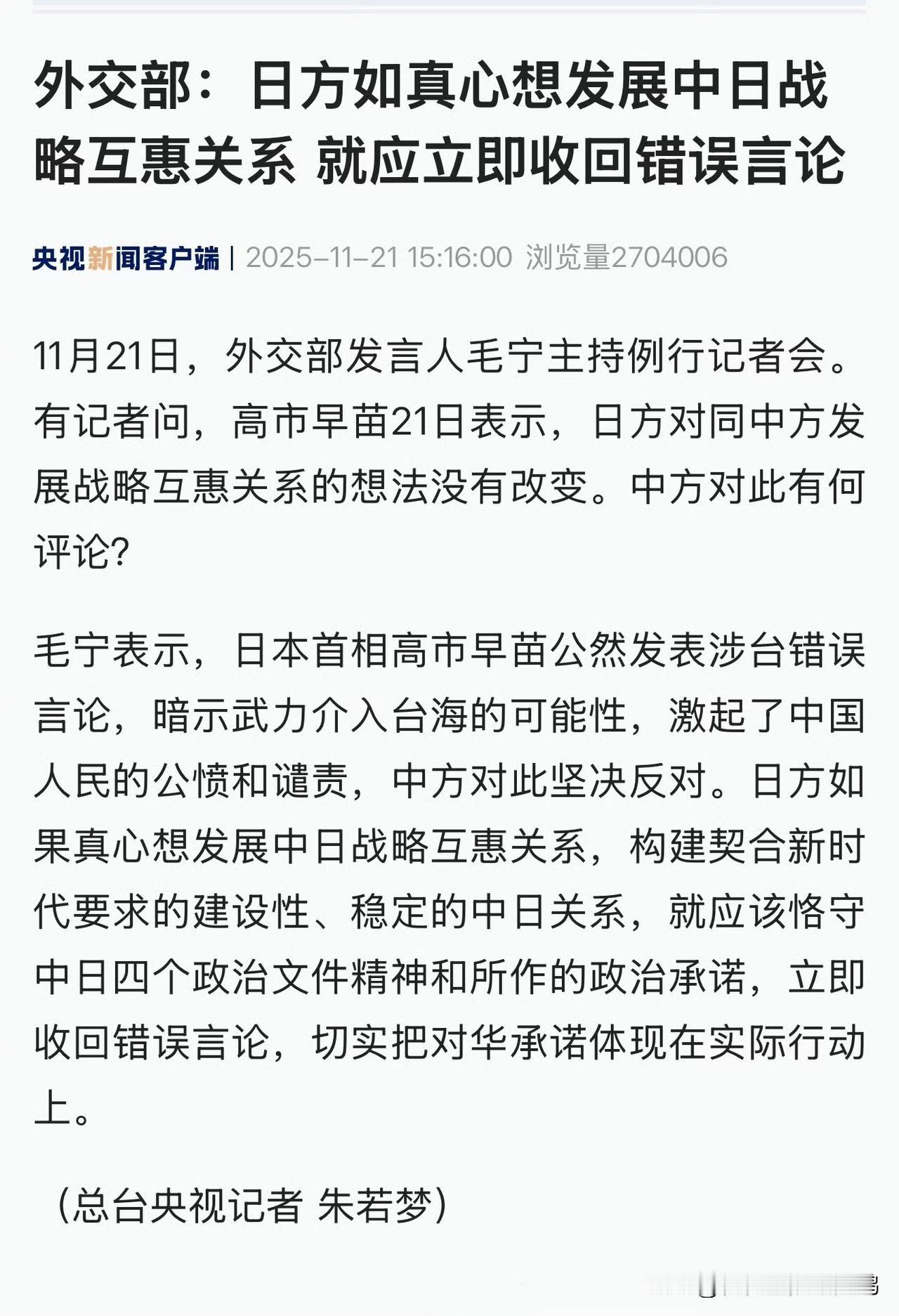 日本首相搞事早苗今天就“台湾有事,就是日本有事”的错误言论进行狡辩,并且依然不撤回其错误言论,咱们外交部第一时间作出回应。 11月21日,高市早苗在接受采访时表示,日本寻求与中国建立“战略互惠关系”及“建设性稳定关系”的方针“没有变化”。 而关于那句闯祸的“台湾突发事态可能构成日本行使集体自卫权的‘生存危机事态’”,她依然说:“何种事态符合生存危机事态的定义,需由(日本)政府根据实际发生的具体情况进行综合判断”,并再次强调这并非对特定案例的预判,但未明确表示是否会撤回相关言论。 对此,我外交部发言人毛宁今天回应称,日本首相高市早苗公然发表涉台错误言论,暗示武力介入台海的可能性,激起了中国人民的公愤和谴责,中方对此坚决反对。日方如果真心想发展中日战略互惠关系,构建契合新时代要求的建设性、稳定的中日关系,就应该恪守中日四个政治文件精神和所作的政治承诺,立即收回错误言论,切实把对华承诺体现在实际行动上。 #海外新鲜事# #日本多个行业为高市早苗买单##人们不禁要问日本意欲何为#