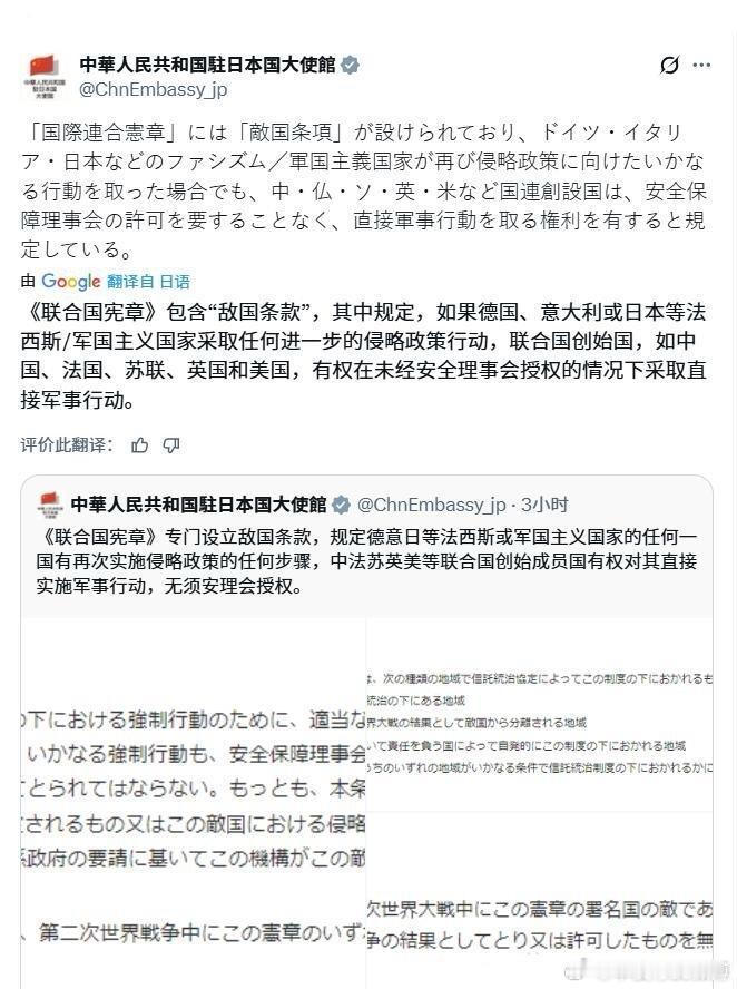 我国驻日本大使馆首次引用“敌国条款” 日本集体破防。