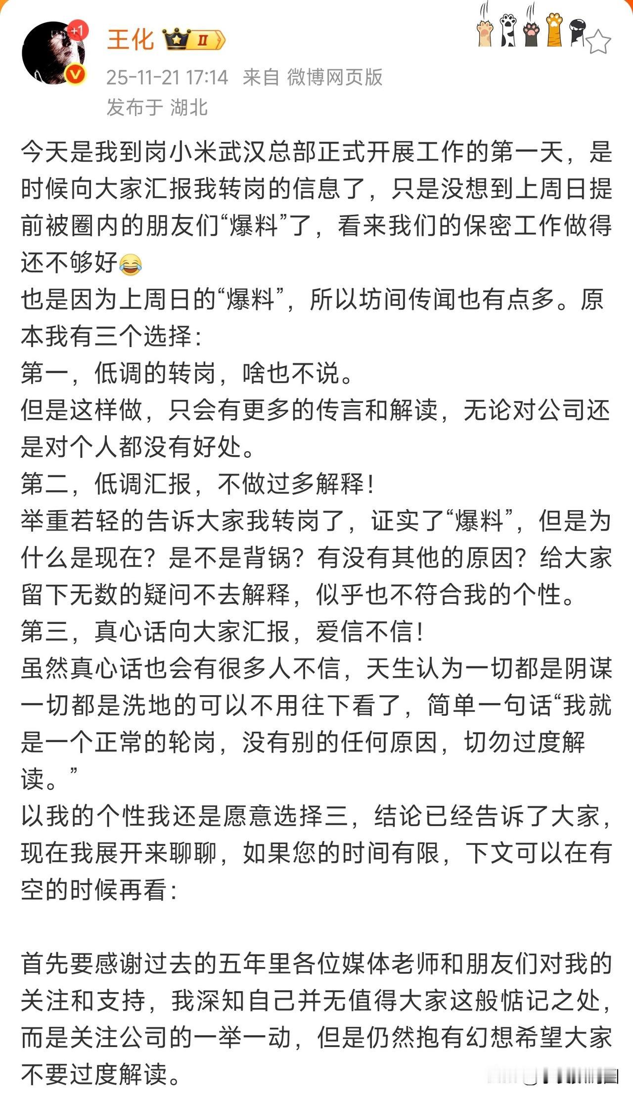 王化转岗到小米武汉总部原来小米里面三年得轮岗,最长5年都得轮岗,网友问:唯一不用轮岗的只怕是雷军了,结果一下被反驳了,雷总从手机轮岗到汽车了[吐舌]