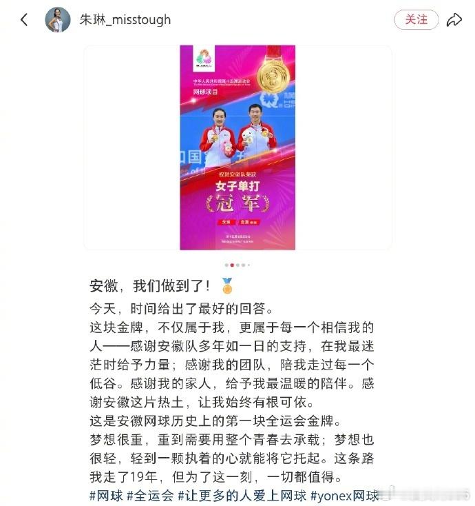 朱琳的金牌不只是个人的突破,更是安徽网球的新起点。她感谢安徽的培养,更希望这枚金牌能点燃更多后辈的梦想。这份 “饮水思源” 的温暖,配上 “想吃爱吃” 的可爱,让冠军的光芒里多了人情味与烟火气。