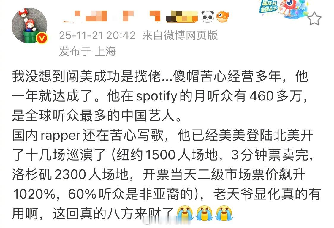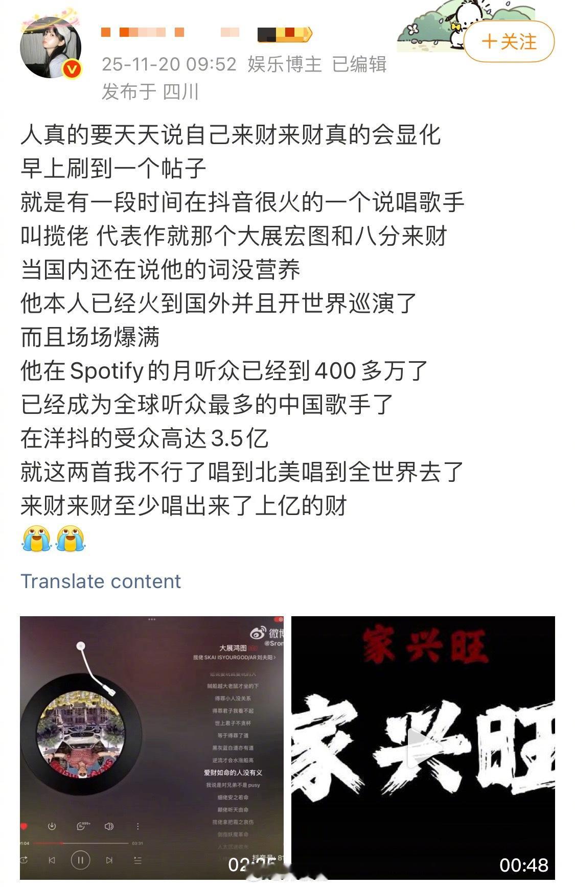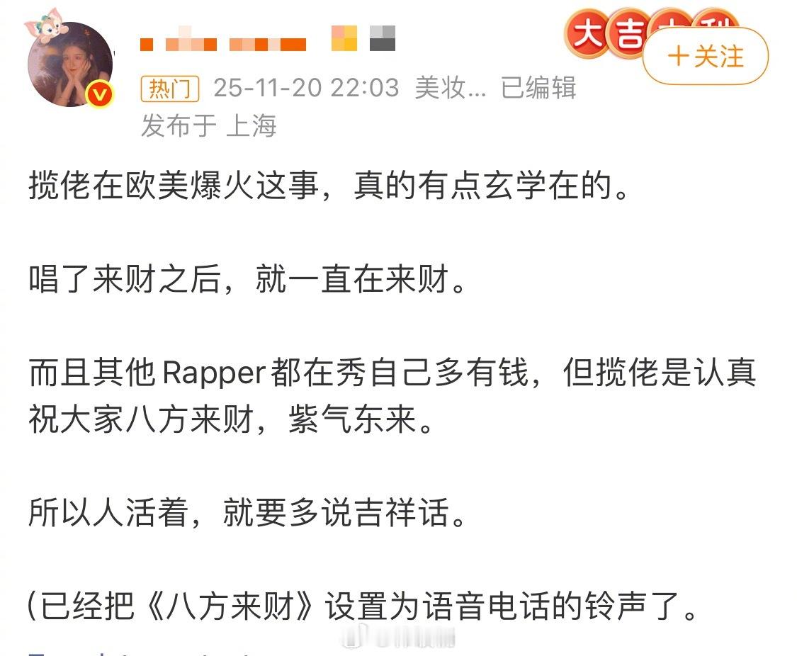 揽佬的八方来财显化玄学🈶️他已经成为全球听众最多的中国歌手这会正在北美开世界巡演呢别人企业出海 他带着财神爷出海了成功填补了西方没有财神爷的空白