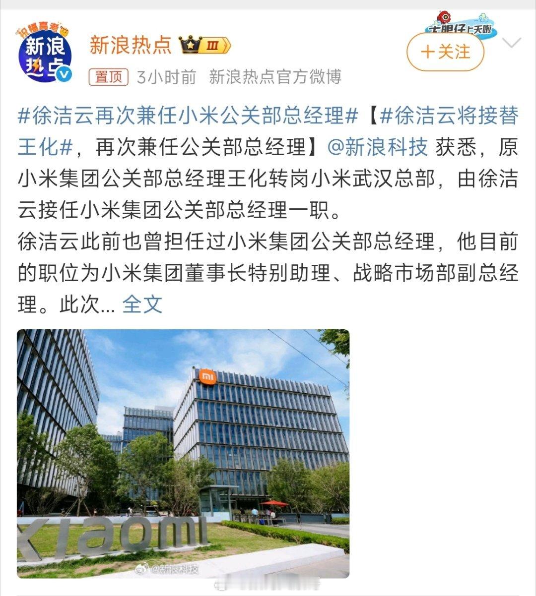 徐洁云再度执掌小米公关部,接替转岗武汉的王化。