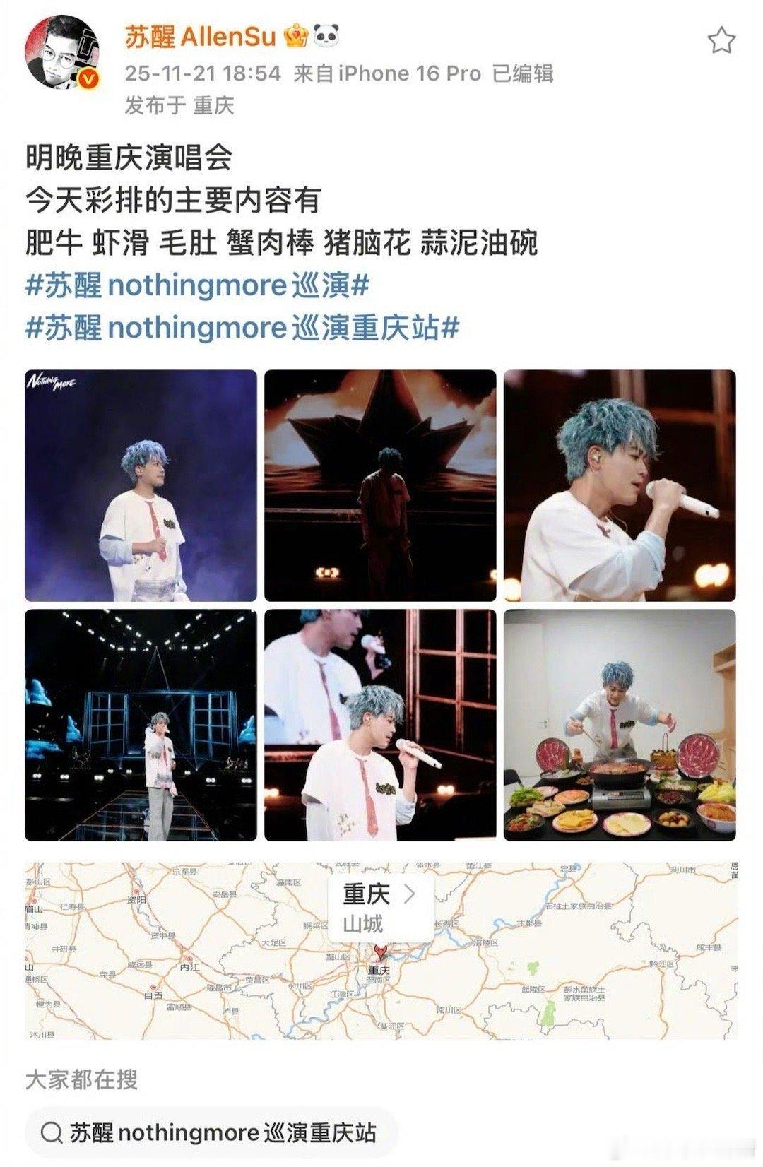 用火锅沸腾的节奏为巡演预热,用毛肚七上八下的秒数练气息!苏醒这顿“彩排”完美诠释了“入乡随俗”,舌尖上的重庆和舞台上的山城今晚都要被他征服。