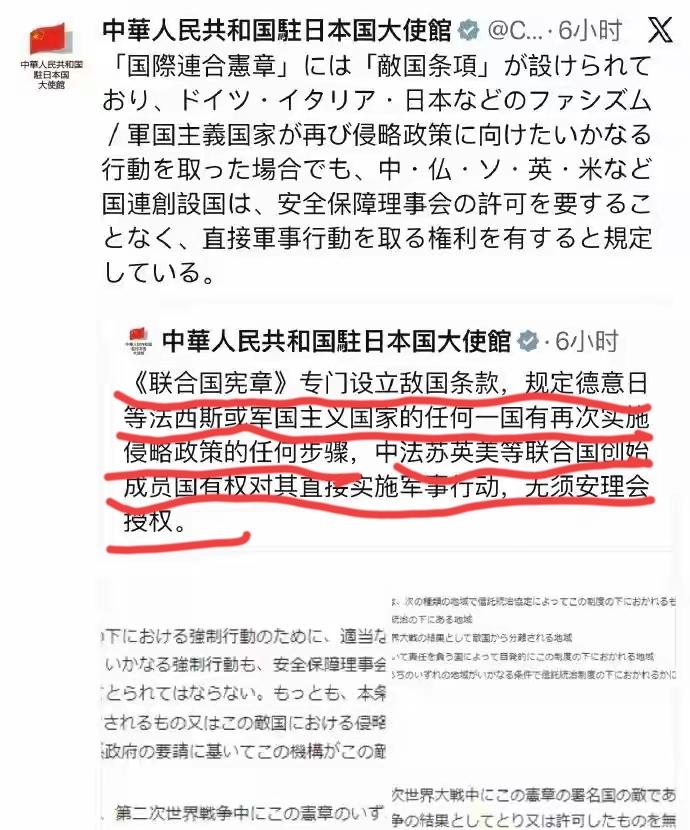 五常直接开打!中国驻日使馆甩出王牌,专治日本军国主义妄想症! 最新消息!中国驻日本大使馆前两天在X上发了个狠声明,中日双语的,核心就一句:联合国宪章里那把悬了八十年的“达摩克利斯之剑”——敌国条款,它还锋利着呢!要是日本胆敢再走侵略老路,中美俄英法这五常,有权直接抄家伙上,收拾它!压根不用看安理会脸色! 啥叫“敌国条款”?说白了就是二战后给德意日量身定做的紧箍咒。当年他们到处点火搞侵略,欠下滔天血债。宪章里白纸黑字写着:只要这仨国家敢冒头搞“再侵略”,创始五常国家就能直接动武反制。 这次使馆特意翻出来晒晒太阳,矛头直指谁,不言而喻啊! 为啥这时候甩王炸?看看日本最近干的啥好事!首相高市早苗之流,嘴巴就没闲过,天天在涉台问题上瞎蹦跶,什么“台湾有事就是日本有事”——我的地盘我做主,中国台湾省的事儿,轮得着你隔着海瞎掺乎? 更离谱的是,他们还惦记着给和平宪法动刀子,跟北约套近乎搞军事演习。这架势,活脱脱一副想给军国主义招魂,把日本重新绑上战车当炮灰的样儿! 使馆这时候搬出祖传“杀器”,就是给日本右翼分子劈头盖脸浇盆冷水,也是给所有想趁乱搅局的国家提个醒:别以为历史书翻篇了,账本还在那儿搁着呢! 日本老百姓想过安稳日子的不少,可架不住总有人揣着明白装糊涂,想把国家拖下水。这条款一亮,既是敲山震虎,也算给日本民众提个醒:擦亮眼睛看清楚,谁在引火烧身! 有人嘀咕:都啥年代了,提这陈芝麻烂谷子管用?我看太管用了!联合国宪章是战后和平大厦的承重墙,当年靠这规矩才摁住了法西斯。现在日本要是敢拆墙脚,五常联手反制,那是师出有名,合法合规,谁也挑不出刺儿! 这哪是虚张声势?分明是把丑话说前头——再作妖,真收拾你没商量! 就像老话讲:“不听老人言,吃亏在眼前。” 这“老人言”就是联合国定的规矩! 咱就说三点实在理儿: 1. 历史伤疤是试金石。 日本政客嘴上喊“面向未来”,可连南京大屠杀、强征劳工这些铁证如山的事实都扭捏着不肯认,这“未来”能是光明正大的吗?连祖宗债都不认,谈何和解? 2. 中国台湾省,没您日本啥事儿! 高市们拿台湾说事,本质是干涉中国内政,想拿台湾当棋子阻碍中国统一,门儿都没有! 咱们底线清晰:一个中国原则是铁律,台湾是中国不可分割的一部分。 3. 和平需要牙齿护卫。 中国永远爱好和平,但和平不是乞讨来的。朋友来了有好酒,豺狼来了有猎枪。 敌国条款就是那把磨快的猎枪,专防某些国家好了伤疤忘了疼,重蹈覆辙。 所以啊,使馆这波操作,绝非小题大做。它是清醒剂,提醒世界:军国主义幽灵仍在游荡;也是照妖镜,照出日本右翼的真实图谋。 五常亮出的不是威胁,是守护战后秩序、捍卫和平的决心。这记警钟,够不够响?日本右翼,听懂弦外之音了吗? 您觉得,这“达摩克利斯之剑”能镇住不安分的势力吗?评论区聊聊您的看法! 信息来源:环球时报2025年11月21日报道《中国驻日使馆重申联合国敌国条款:若日本再侵略,五常可直接军事行动》及后续分析文章。中国驻日使馆重申敌国条款