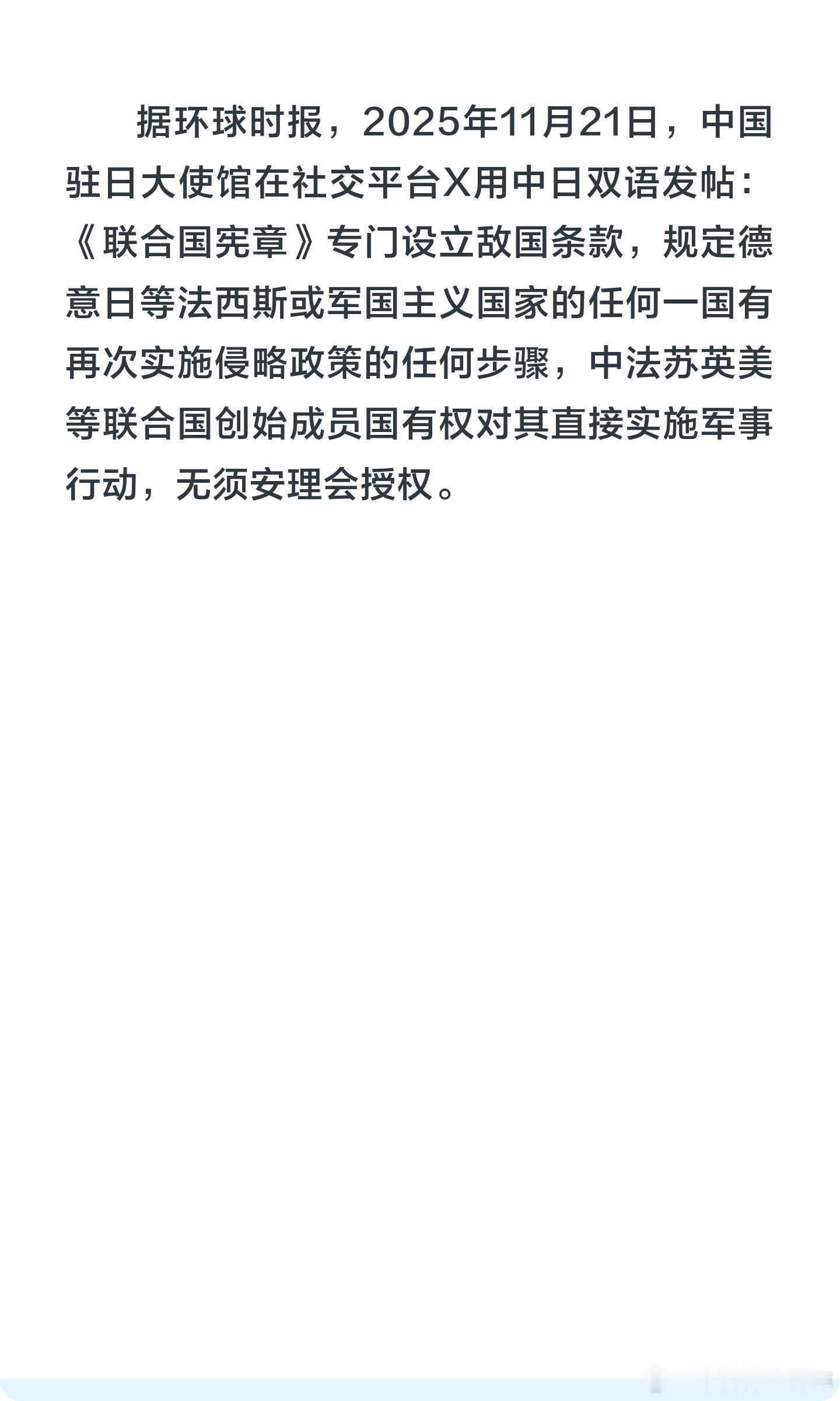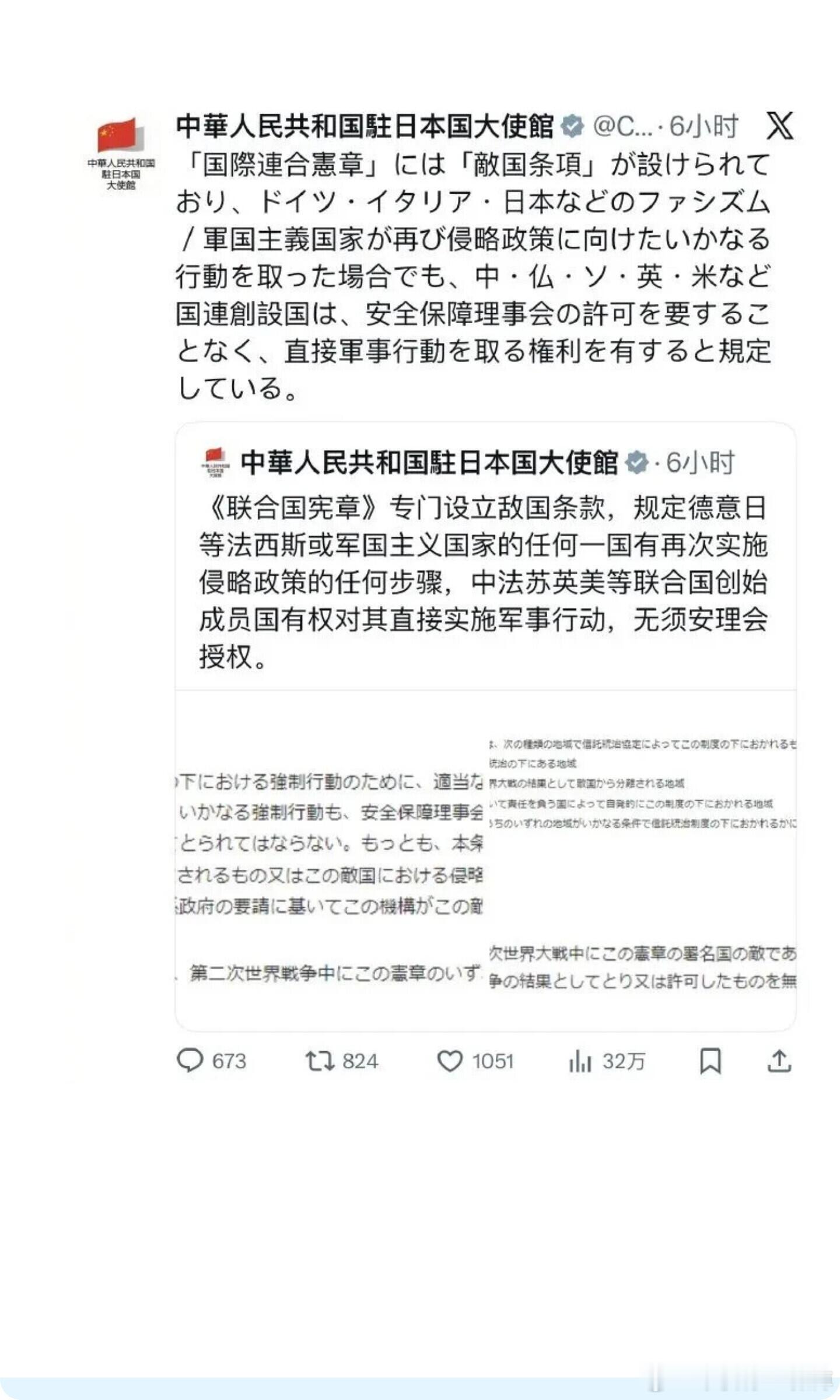 中国驻日使馆重申联合国敌国条款。
