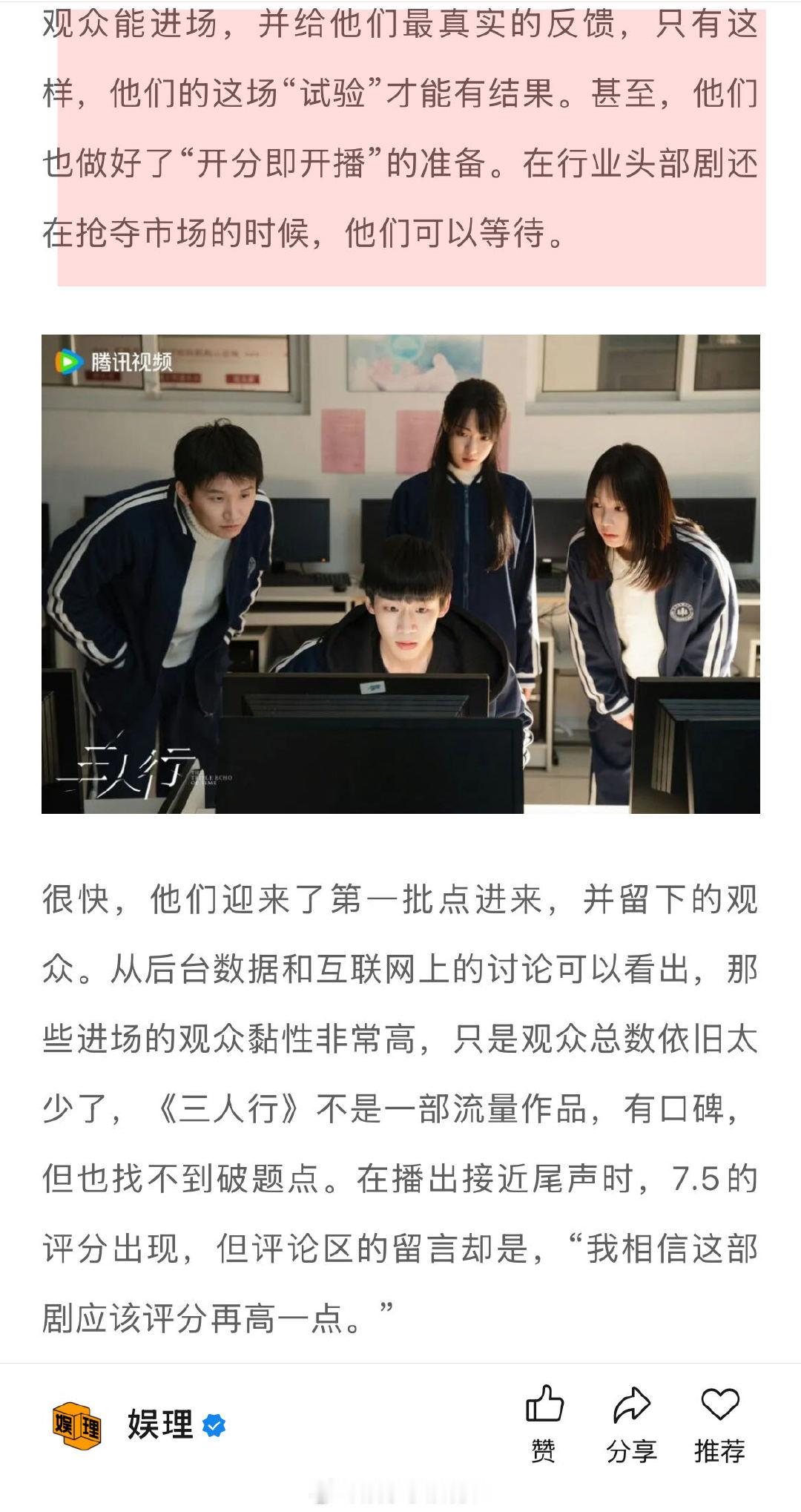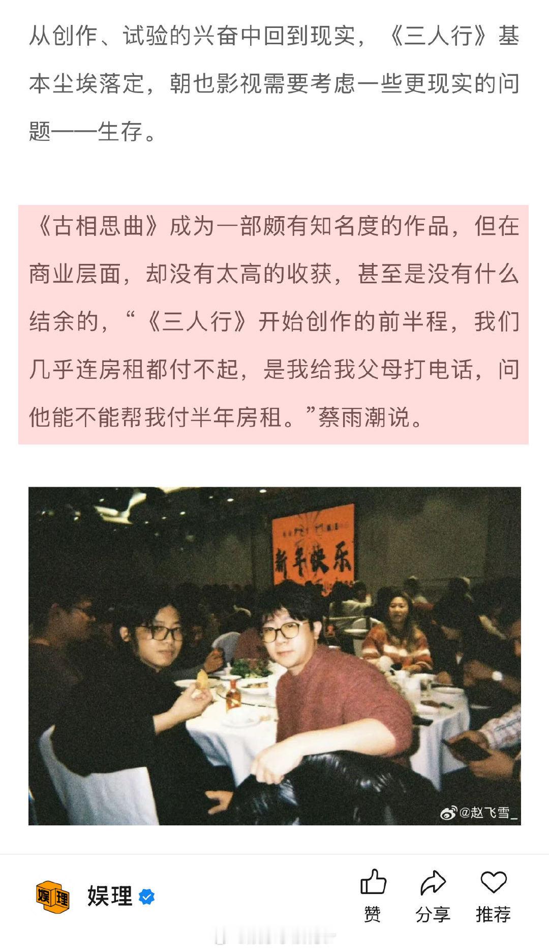 从创作、试验的兴奋中回到现实,《三人行》基本尘埃落定,朝也影视需要考虑“生存”这类更现实的问题。比如口碑剧《古相思曲》在商业层面没有太高的收获,甚至没有什么结余,“《三人行》开始创作的前半程,我们几乎连房租都付不起,是我给我父母打电话,问他能不能帮我付半年房租…”↓