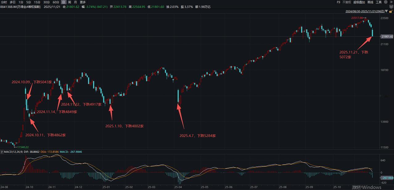 超5000家下跌,市场跌到头了吗?数据告诉你,接下来会怎么样? 今日市场放量下挫,个股几乎全线飘绿——全市场近5100只股票收跌,一片惨淡。 面对如此剧烈的调整,市场自然不乏“解释”: 美联储12月降息预期落空引发流动性忧虑 AI概念估值泡沫引发资金撤离 海外局势再度升温 叠加国内公募基金年底考核压力…… 各种利空消息纷至沓来,仿佛每一根阴线都有“合理”的理由。 但如果我们暂时跳出盘面波动,冷静审视一个更本质的问题: 真正驱动这轮下跌的,是不是股价本身已经处于相对高位? 值得注意的是,当前市场已连续六个交易日下跌。 而历史经验告诉我们,在持续下行过程中,利空消息往往会集中释放、被放大甚至被“制造”出来,用以解释市场的悲观情绪。 然而,情绪归情绪,现实未必更糟。 不妨拉长时间维度来看:现在的情况真的比2024年9月更差吗?比2025年4月更严峻吗? 回顾自2024年9月以来的数据,全A股单日下跌家数超过4800只的情形总共出现过7次。 其中,2024年有4次,集中在9月快速冲高后的震荡回调阶段,而2025年至今已有3次,分别出现在1月和4月——而这两次,恰恰都构成了阶段性的重要底部区域。 换句话说,极端普跌往往不是风险的起点,反而可能是市场情绪过度释放、接近阶段性拐点的信号。 当绝大多数股票都在下跌时,与其被短期噪音裹挟,不如多一分理性,多一分对历史节奏的敬畏。