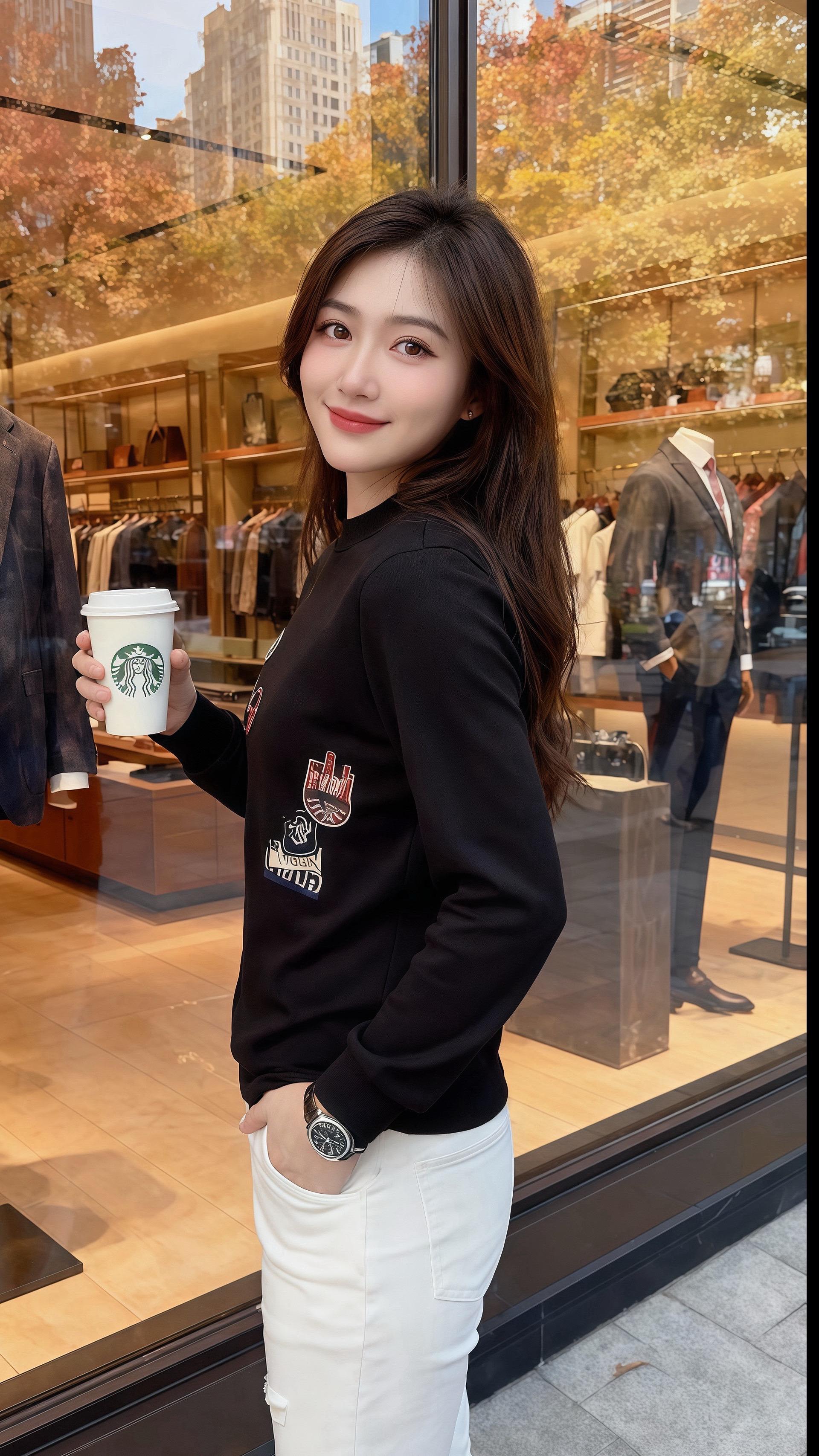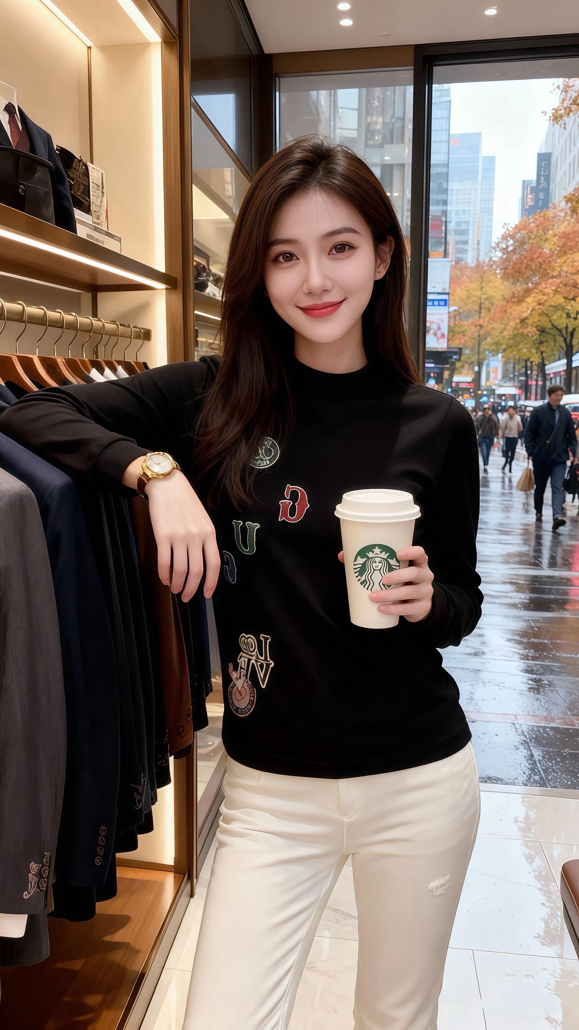 秋阳裹着梧桐暖光贴在橱窗时,周屿正靠在西装架旁等林晚。她推门进来时,黑衫上的绣标在暖光里泛着绒边——红棕徽章衬着墨底,像把复古邮戳盖在了风里,配米白裤装,偏偏腕间银表勾得人眼热。