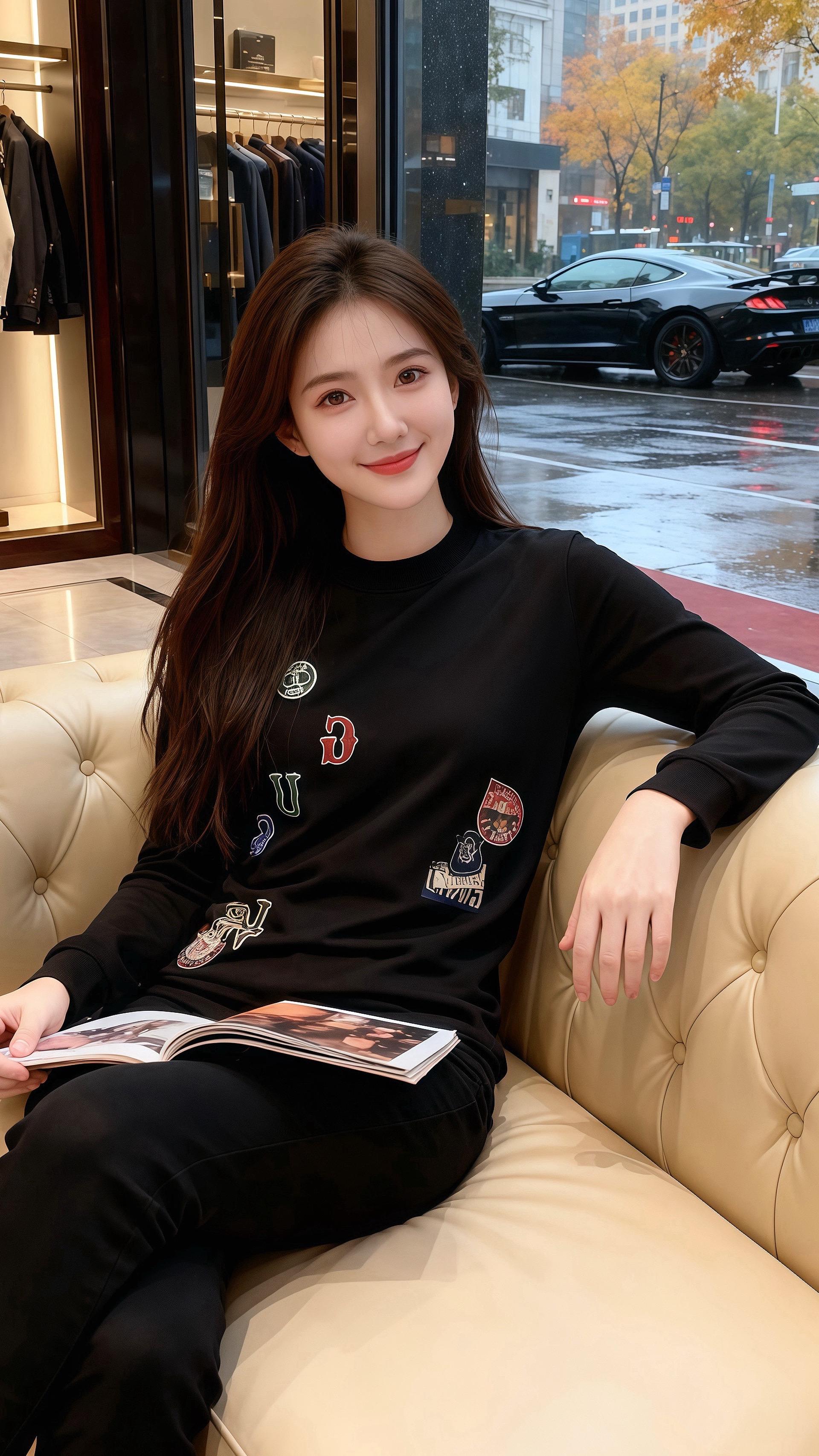 “这件比上次的白款更衬你。”他指尖碰过她袖上的字母绣章,布料软得像她眼下的笑。林晚蜷进米白沙发翻杂志时,黑衫裹着肩线,绣标随动作轻晃,像把碎星钉在了衣摆。