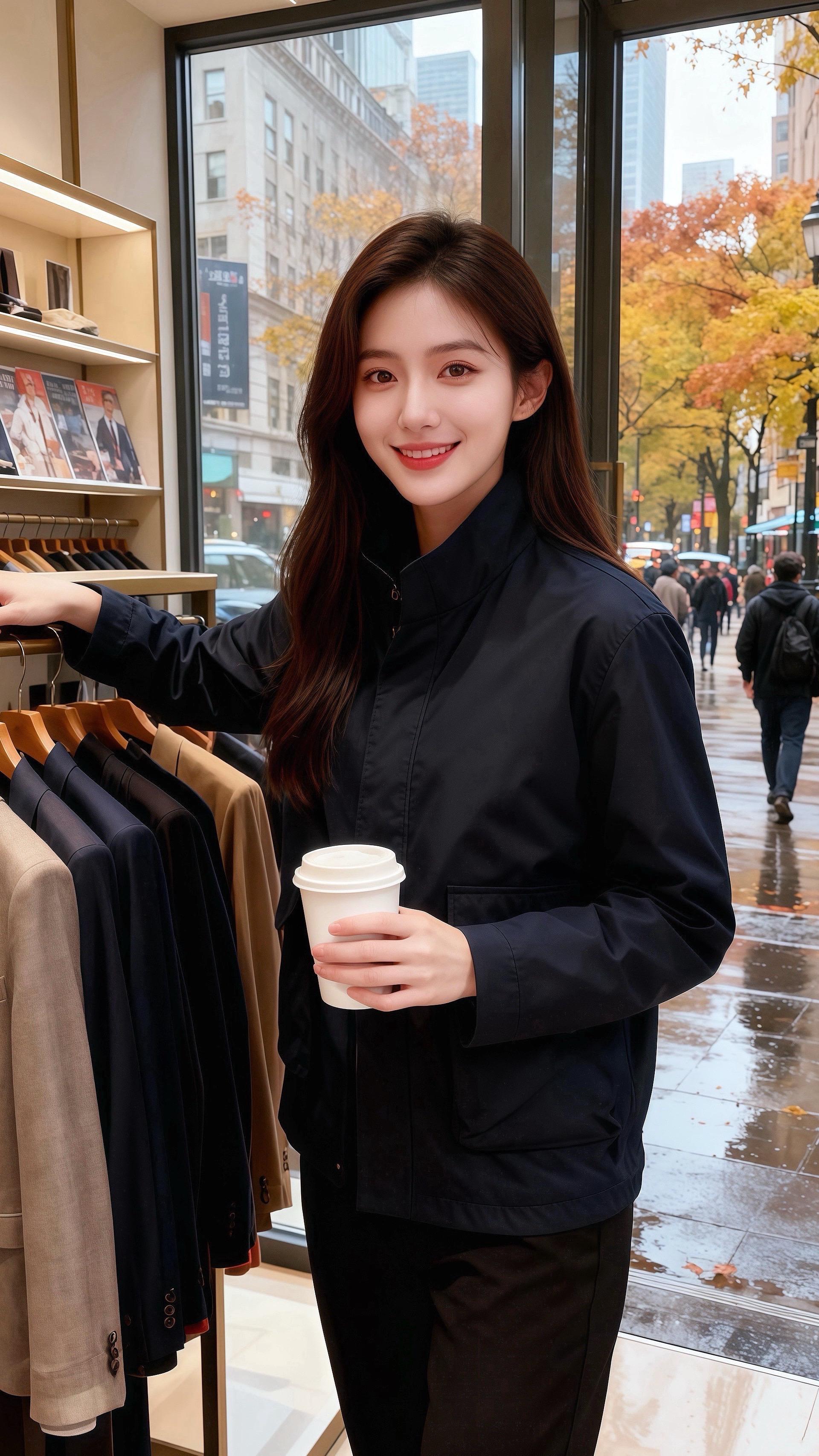 秋雨裹着桂香漫进橱窗,许妍指尖蹭过衣架上的藏青夹克,转身时撞进皓明的目光里。