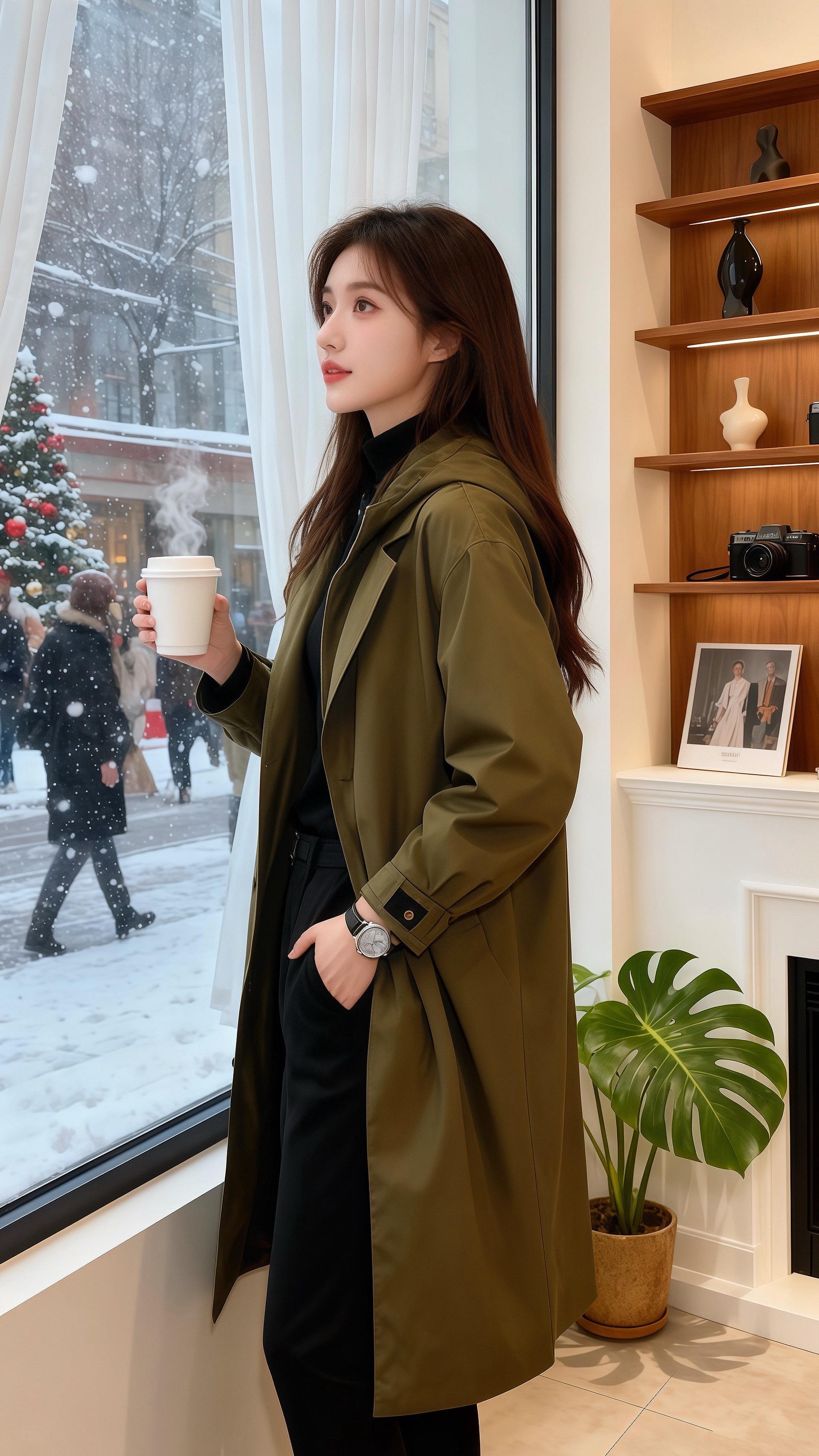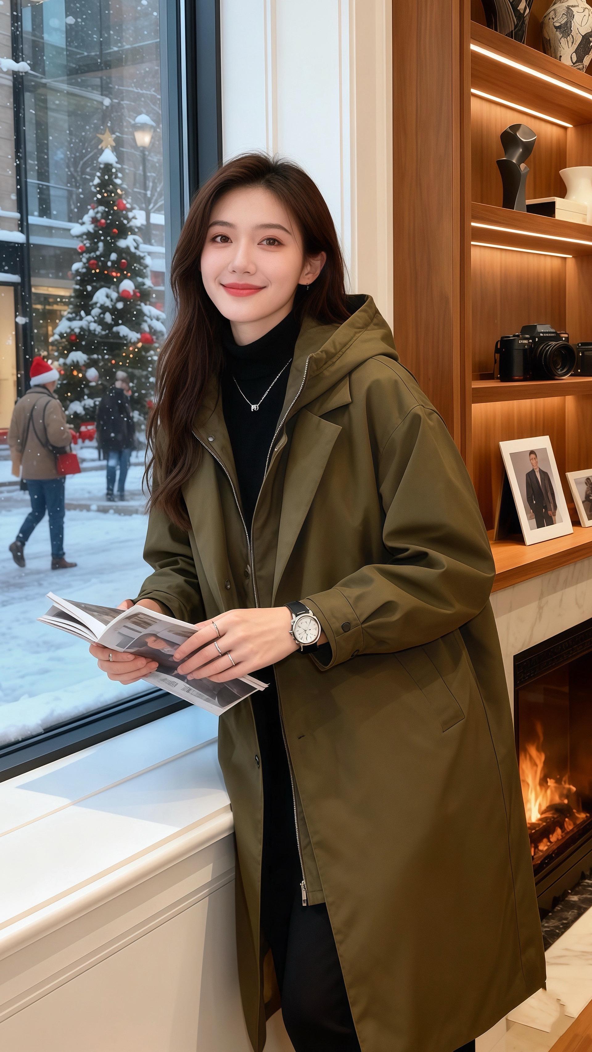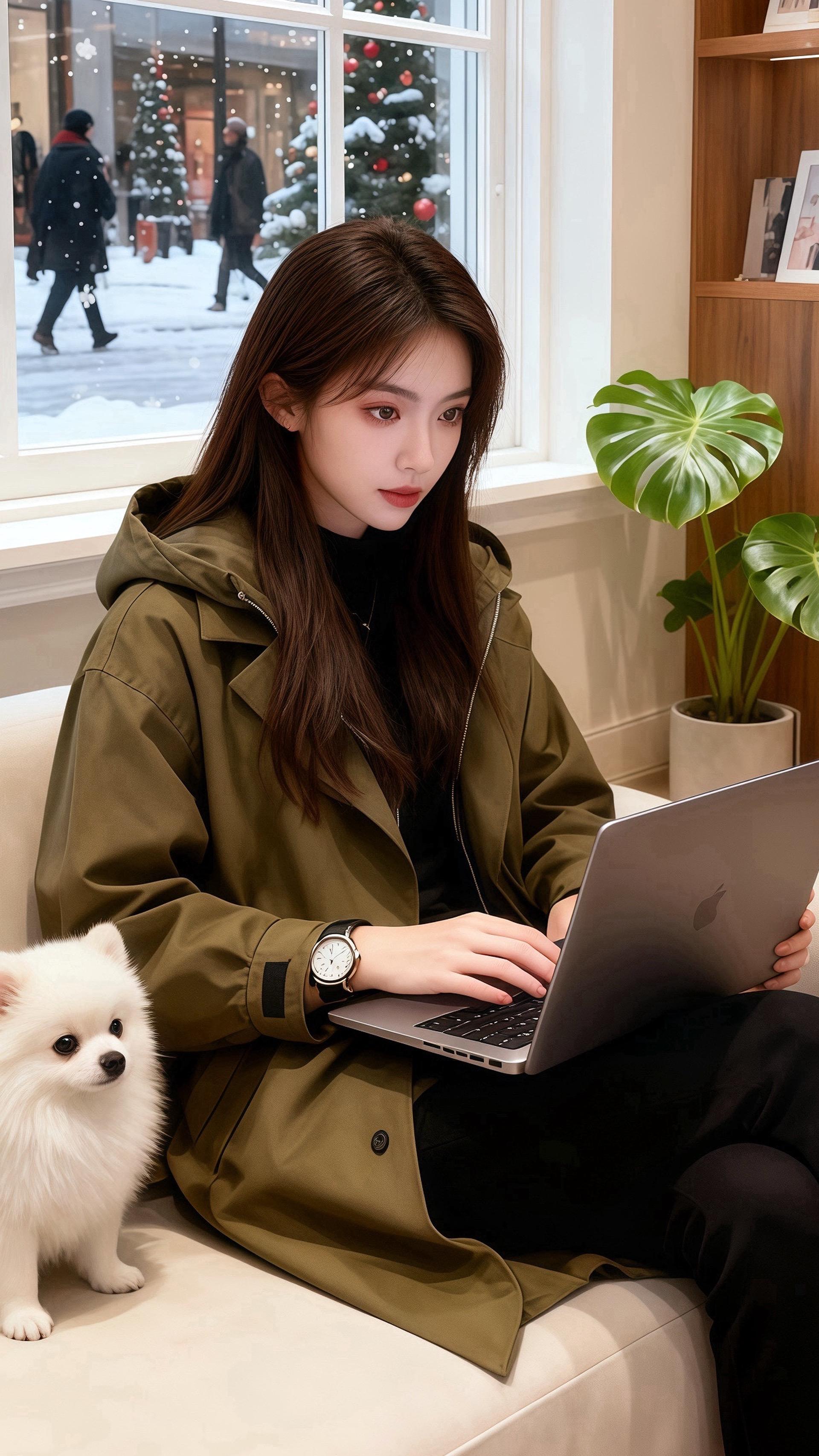 她裹着件橄榄绿外套,面料垂得刚好,连帽衬得肩线软和又利落。黑高领贴着下颌,袖口的扣袢露出半截细腕,正垂眼敲笔记本,膝头蜷着只白绒小狗。