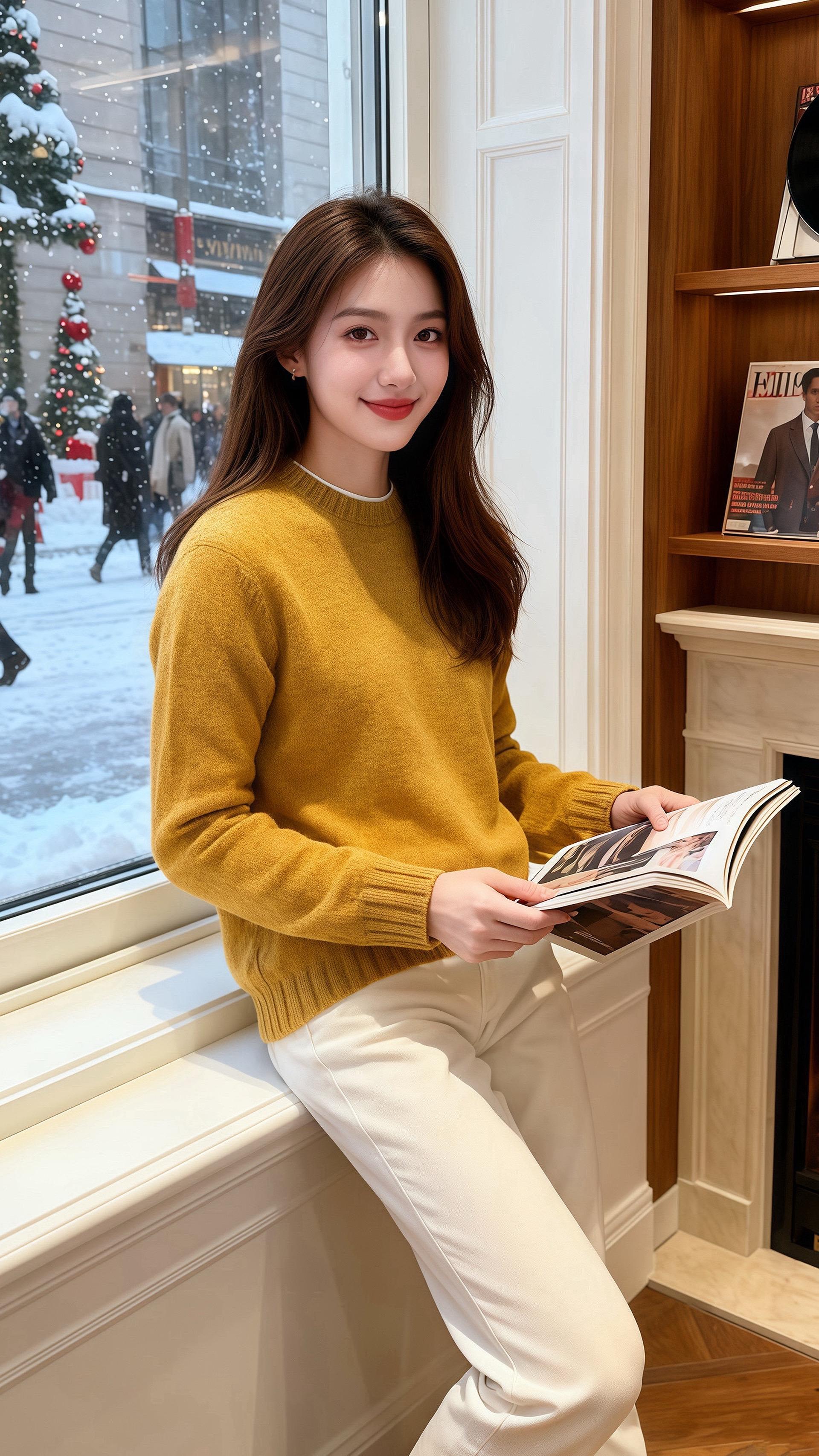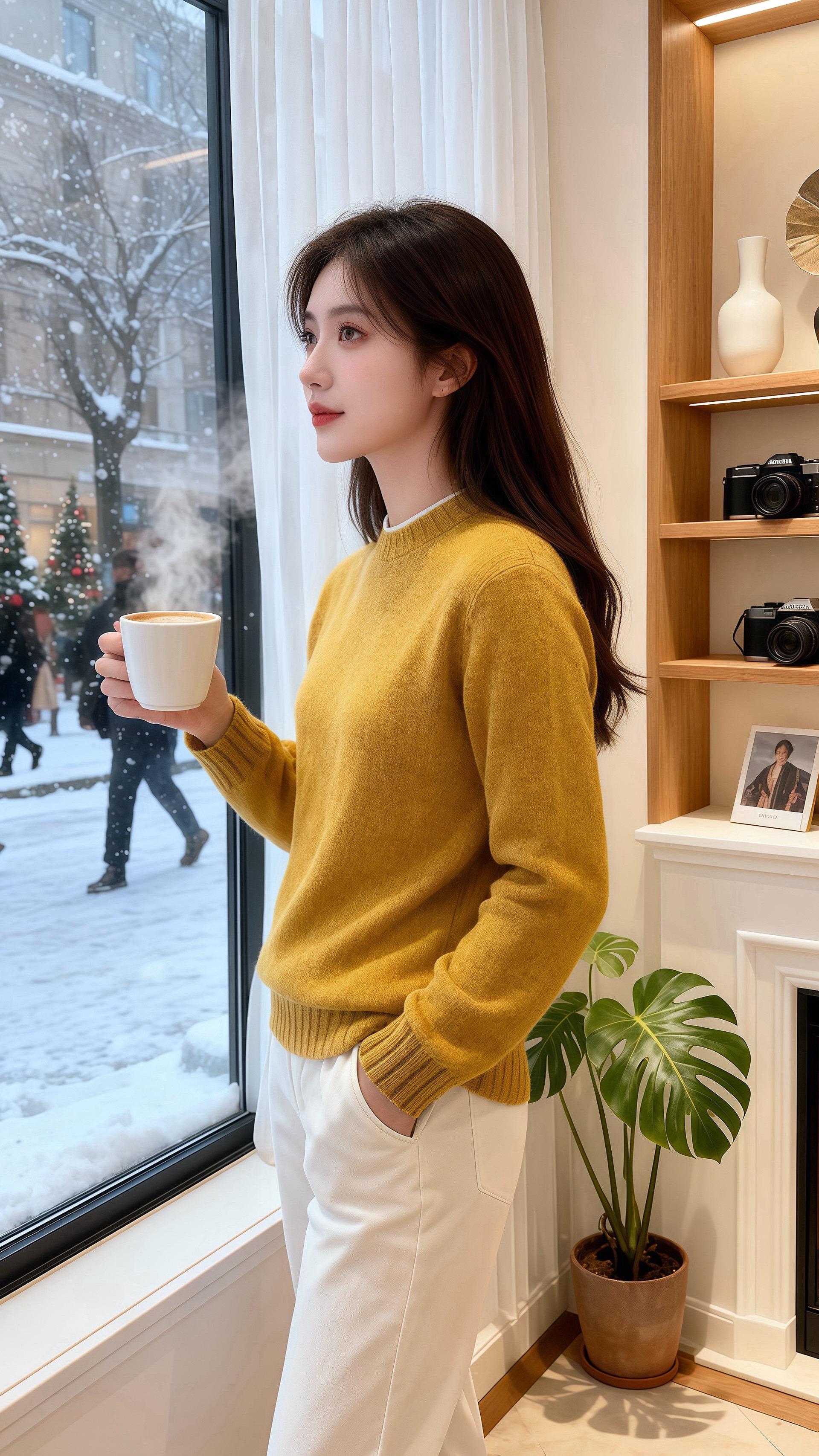 再见面是跨年夜,她穿了件一模一样的姜黄毛衣,配同款米白裤。他盯着她袖口的细绒边笑:“原来那天你不是在看衣服。”