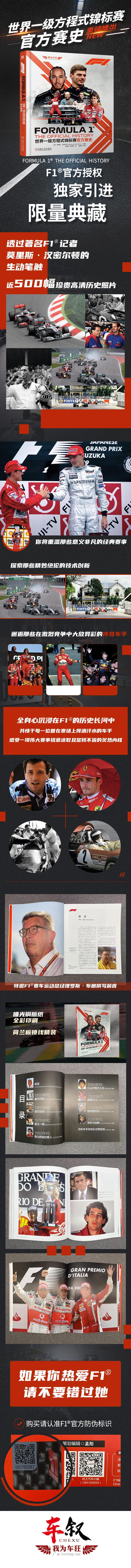 【世界一级方程式锦标赛官方赛史·简体中文版独家引进】从1950年的银石起跑,到塞纳、舒马赫、阿隆索、汉密尔顿、维斯塔潘的时代更迭,再到风起云涌的混动纪元和当下的百亿级技术竞赛……一本书,看尽F1这项世界之巅的速度史诗。F1官方出版物,由机械工业出版社独家引进,我领衔翻译、虾哥审校的《世界一级方程式锦标赛官方赛史》(英文原名Formula 1: The Official History)现已正式上市。这不是单纯的F1入门读物,而是官方视角下对七十余年传奇赛事的系统梳理:500余张珍贵正版照片、数十段首次公开的幕后故事、近百支车队的兴衰、传奇车手们的成败时刻、规则演变与技术革命……所有你耳熟能详或闻所未闻的F1故事,都在字里行间生动展现。对赛道竞逐的挚爱、对技术创新的执着、对竞技精神的赞颂,都浓缩在这本书里。如果你热爱F1、热爱赛车、想真正读懂它、真正与你所仰慕的车手共情,这本书会是你最好的起点。本书将在11月22日的情怀车展举办签售活动,现场将会有粉丝惊喜价,同步上线机械工业出版社京东和天猫官方旗舰店。购买时请认准封底的F1官方防伪镭射标识。
