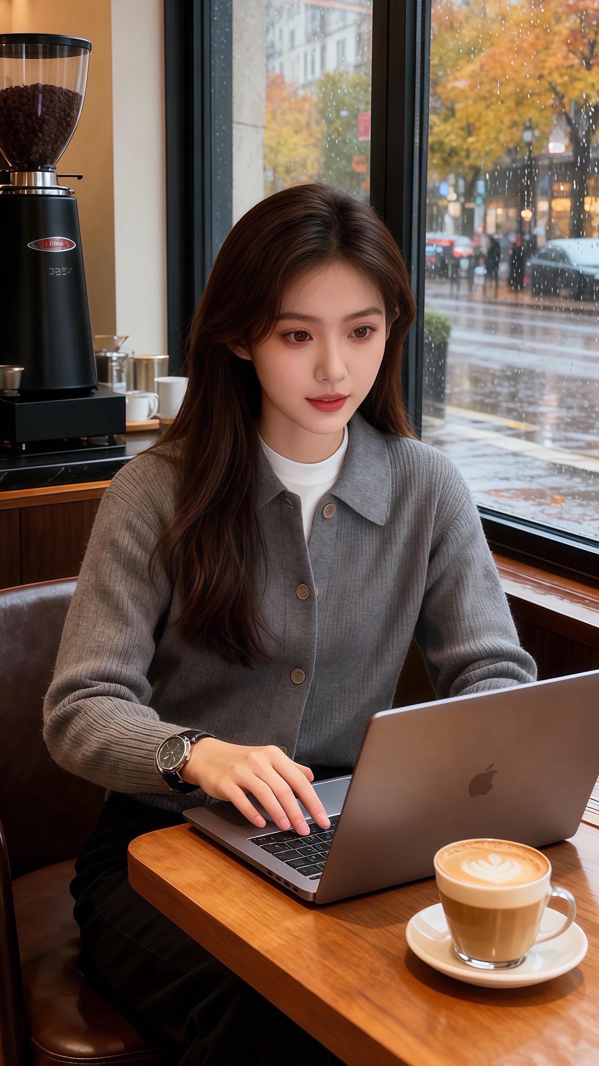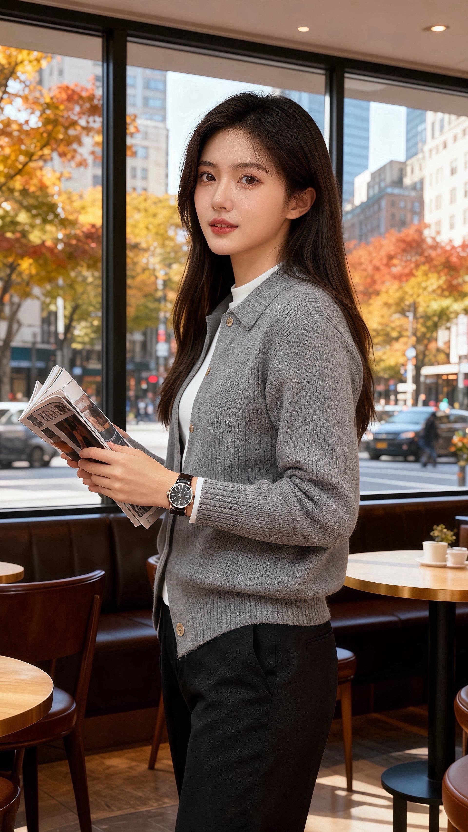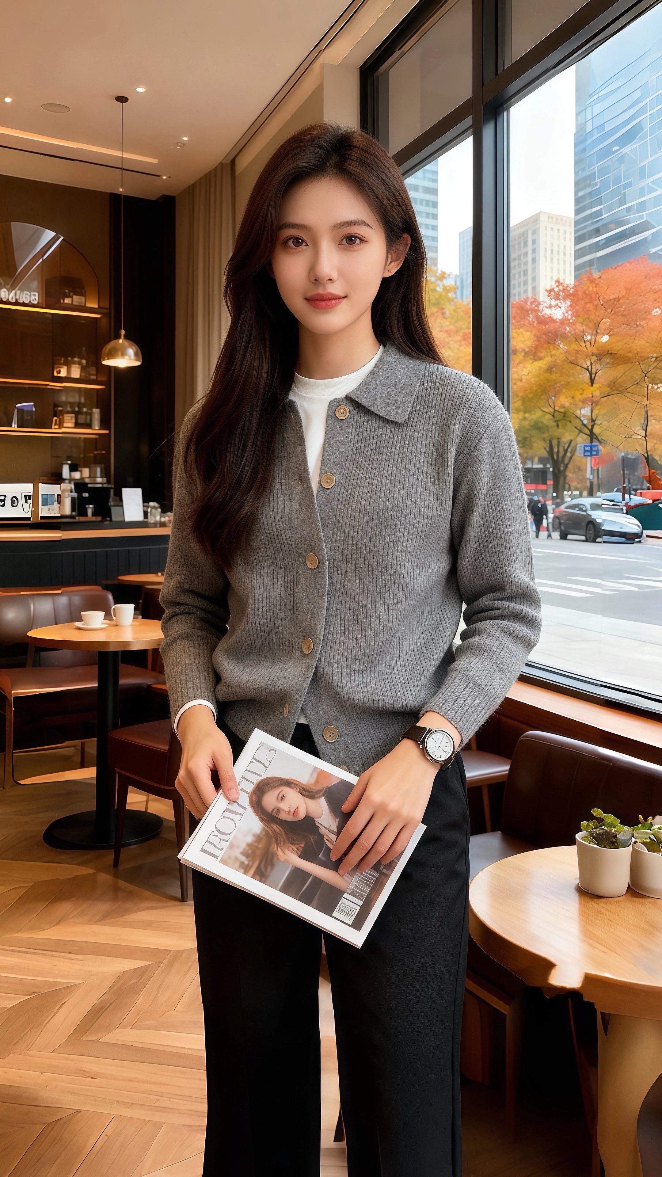 雨丝裹着桂香贴在咖啡馆窗沿时,许妍正对着笔记本敲字。她身上的浅灰开衫衬得秋意都软和——针织纹理细密却不紧绷,翻领刚好露出内搭的白边,配着垂感黑裤,松弛里裹着温温的质感。