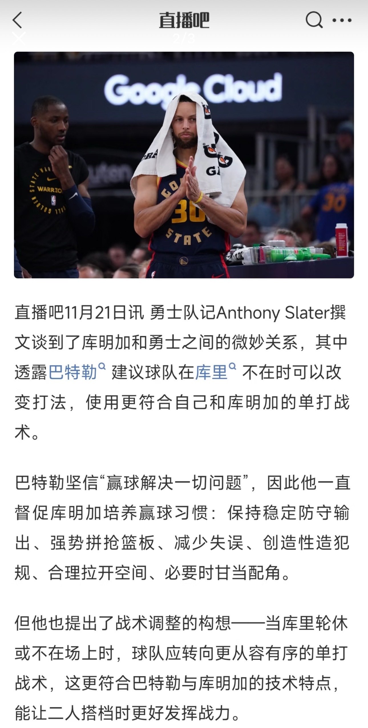 我感觉说的在理,你们觉得呢🤔1.巴特勒:督促库明加养成赢家习惯,建言球队设计“无库里”战术,库里是“终极作弊码”,胜利能治愈一切。巴特勒坚信胜利能解决所有问题。因此他一直督促库明加提升赢球习惯——持续努力防守、强力拼抢篮板、减少失误、创造性地站上罚球线、合理拉开空间以及在必要时退居二线。但他同时也主张进行战术微调,以便在库里轮休或不在阵容时,让两人在场上更好地协同发挥——转向更谨慎、有条理的隔离单打战术,这种打法应更有利于发挥巴特勒和库明加的技术特点。“斯蒂芬上场和不在场时完全是两种局面,”巴特勒表示:“如果库里不在时还坚持打他的战术,那根本行不通。对手不会过度反应...我并非全盘否定那种打法,只是说斯蒂芬就像终极作弊码。”“所以评价球员'无法适配某套阵容'有失公允。只要斯蒂芬在场上,任何人都能与他完美配合。”