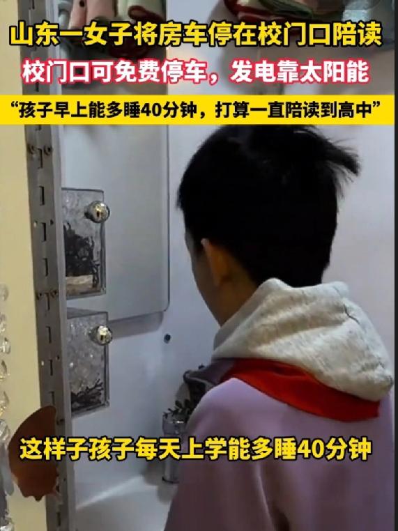 校门口的房车陪读:是守护还是过度呵护? 山东一位爸爸买了房车停在校门口陪读,太阳能供电、兔费停车,只为让孩子早上多睡40分钟,还计划陪读到高中。这份用心太戳人! 他女儿上学车程超一个多小时,于是他买了房车,让妻子和母亲轮流陪读,这房车虽不大,但厨房、卫生间一应俱全,像个温馨的小公寓。 这事在网上引发争议:有人觉得,为了让孩子充足睡眠、提升学习效率,这钱花的值。毕竟睡眠比啥都重要,也有人担忧"甲醛"问题,更怕过度呵护会削弱孩子的独立能力。 陪读没有标准答案,关键是平衡关爱与放手。可怜天下父母心。所有付出皆为孩子成长,若能在陪伴中慢慢培养孩子的自主能力,这份守护便既有温度,又有分寸。你怎么看待校门口的房车陪读?