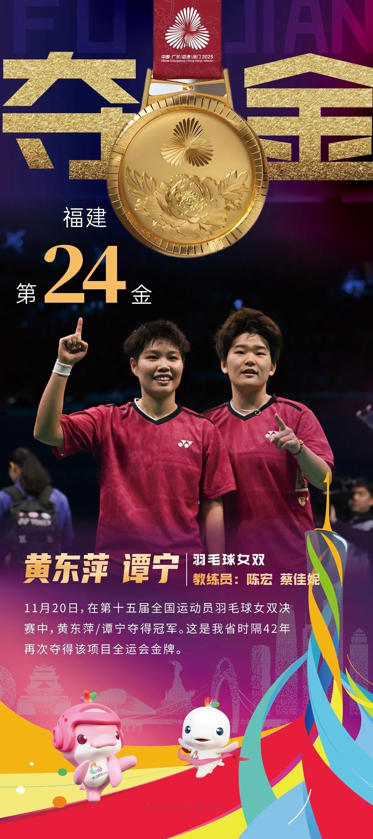 黄东萍和谭宁的羽毛球女双金牌是福建24金,也是福建时隔42年再次获得女双金牌,这