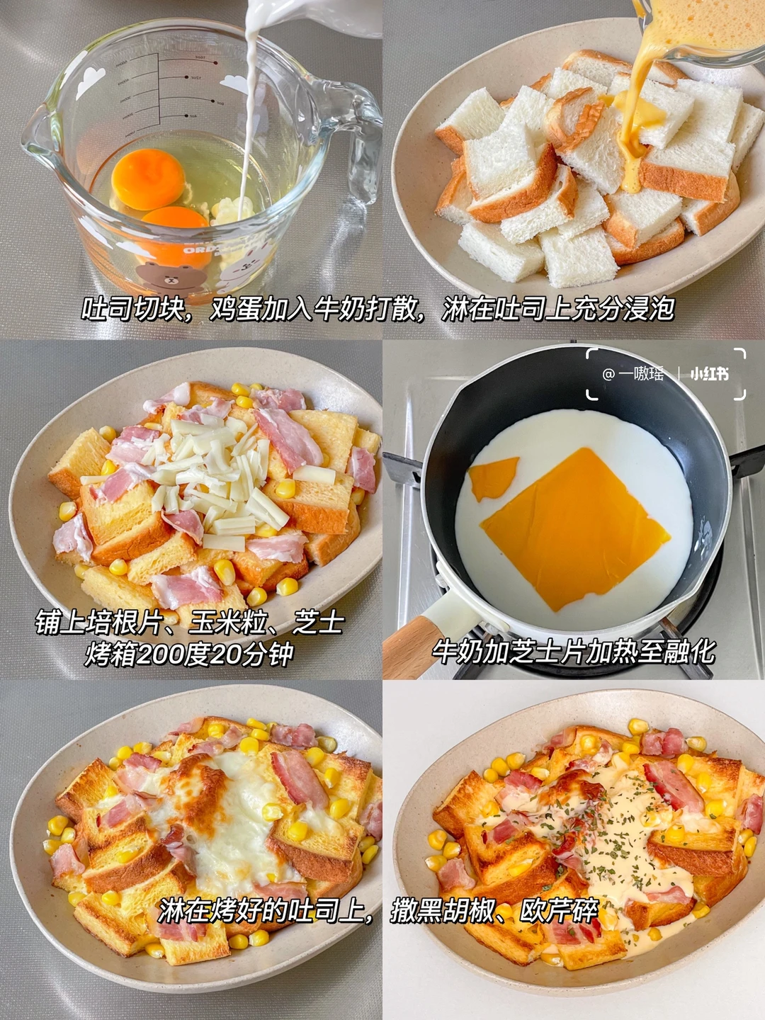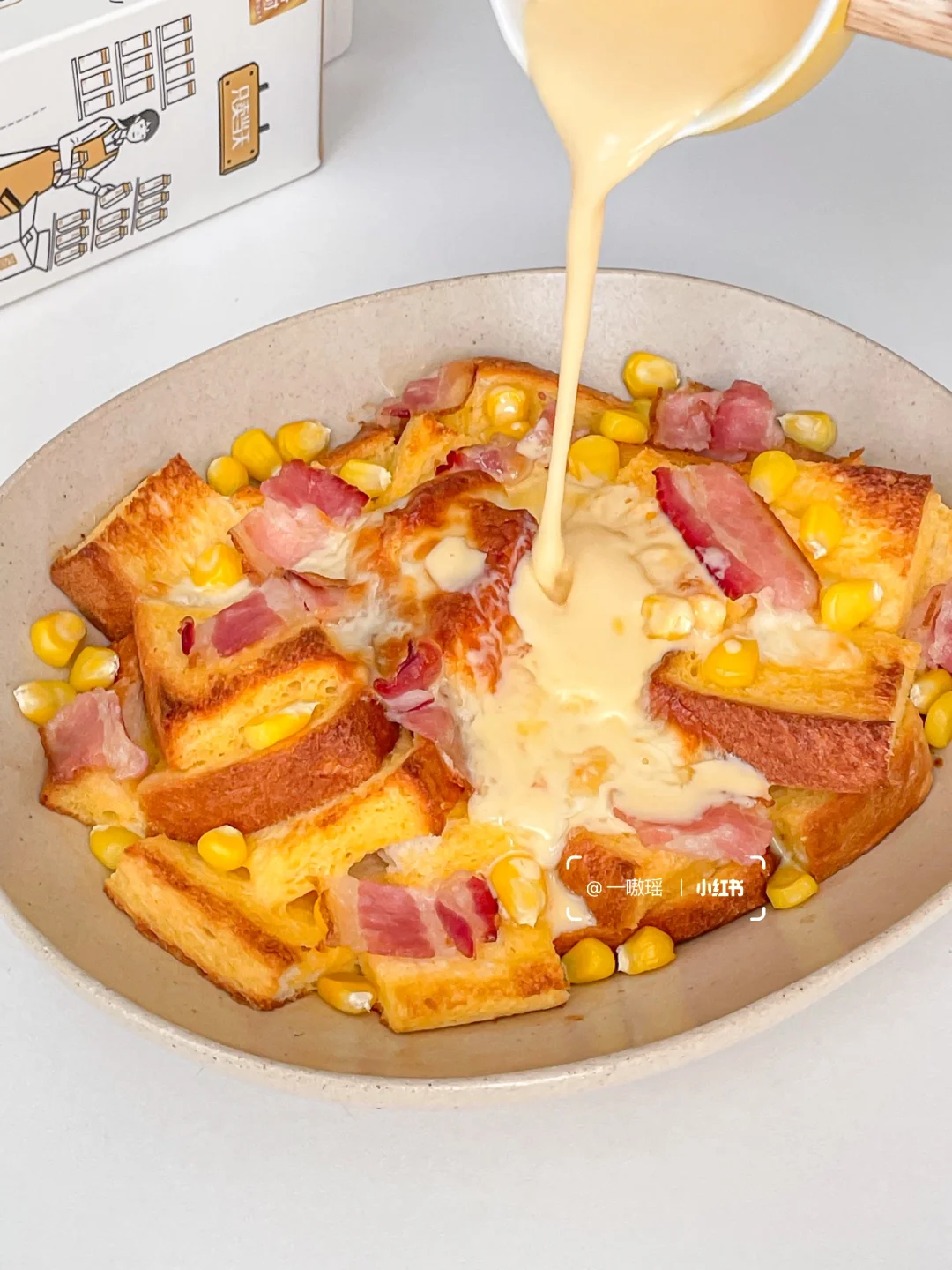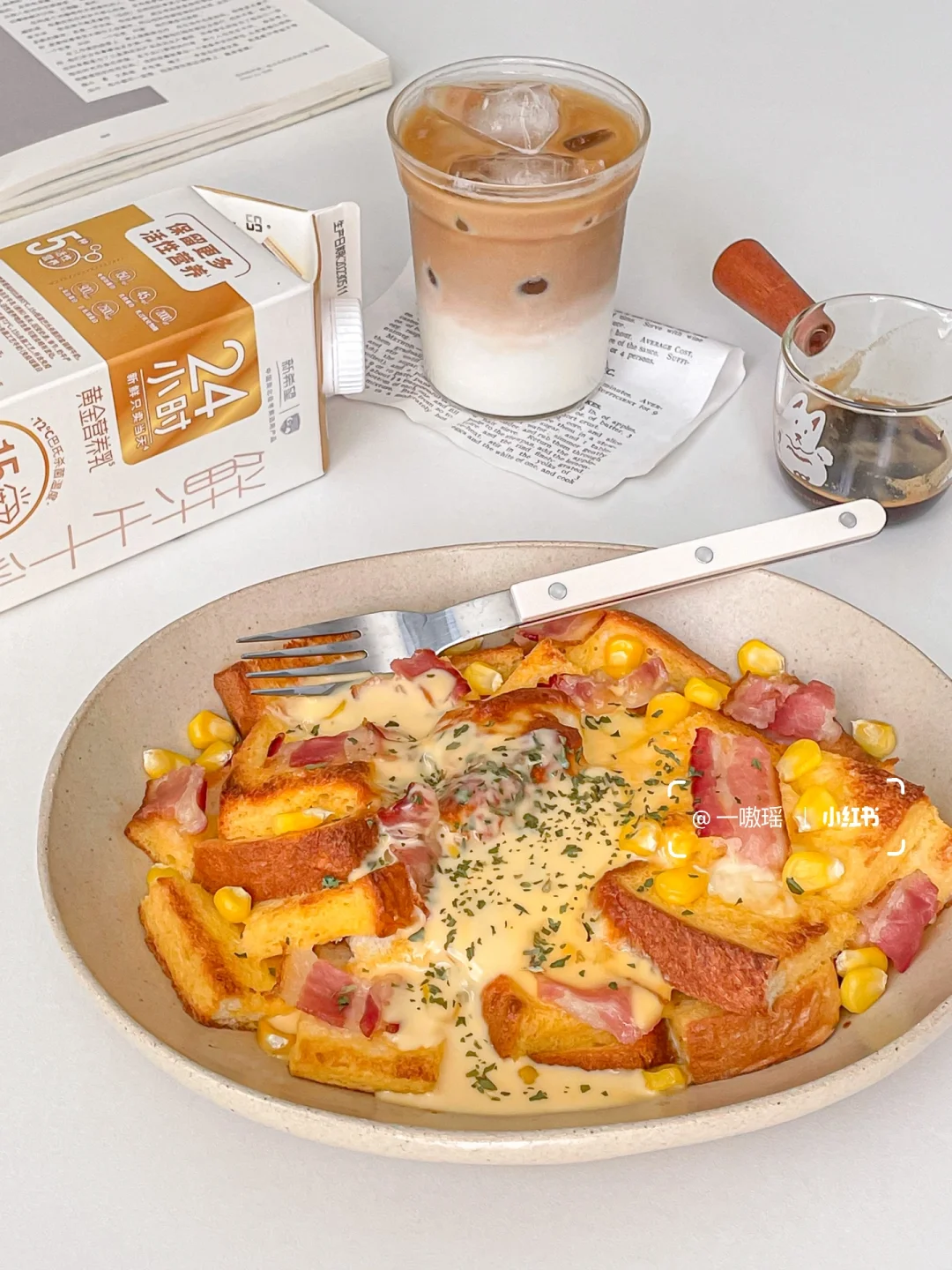 懒人早餐也有无限可能🥄 被牛奶蛋液浸泡的吐司🍞烤完之后软软嫩嫩香喷喷 还有咸香培根和超长拉丝芝士!多重快乐~必须拿捏👌 - 🛒食材 吐司三片 鸡蛋两个 芝士片两片 奶酪棒一根 鲜奶60毫升 玉米粒适量 👩🏻‍🍳做法 ·吐司切块,鸡蛋打散加入牛奶搅匀 ·淋在吐司上,充分浸泡 ·铺上培根片、奶酪碎、玉米粒 ·烤箱200度20分钟 ·鲜奶加芝士片加热至融化淋在烤好的吐司上 ·撒黑胡椒、欧芹碎 - ☕️今日咖啡 将好喝又省事贯彻到底的冰拿铁🧊 🥛新希望24小时黄金营养乳+☕️现磨咖啡浓缩液 0糖0负担,very醇香,完胜咖啡店!据说这款鲜奶只卖上市当天,很新鲜🍃入口丝滑不粘腻,自然清甜,太喜欢了[两颗心R]