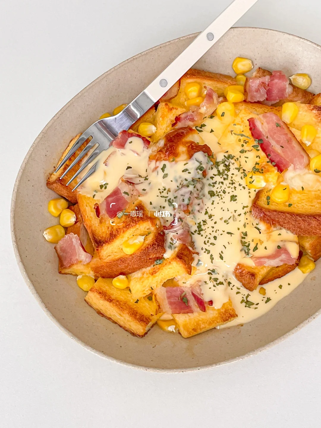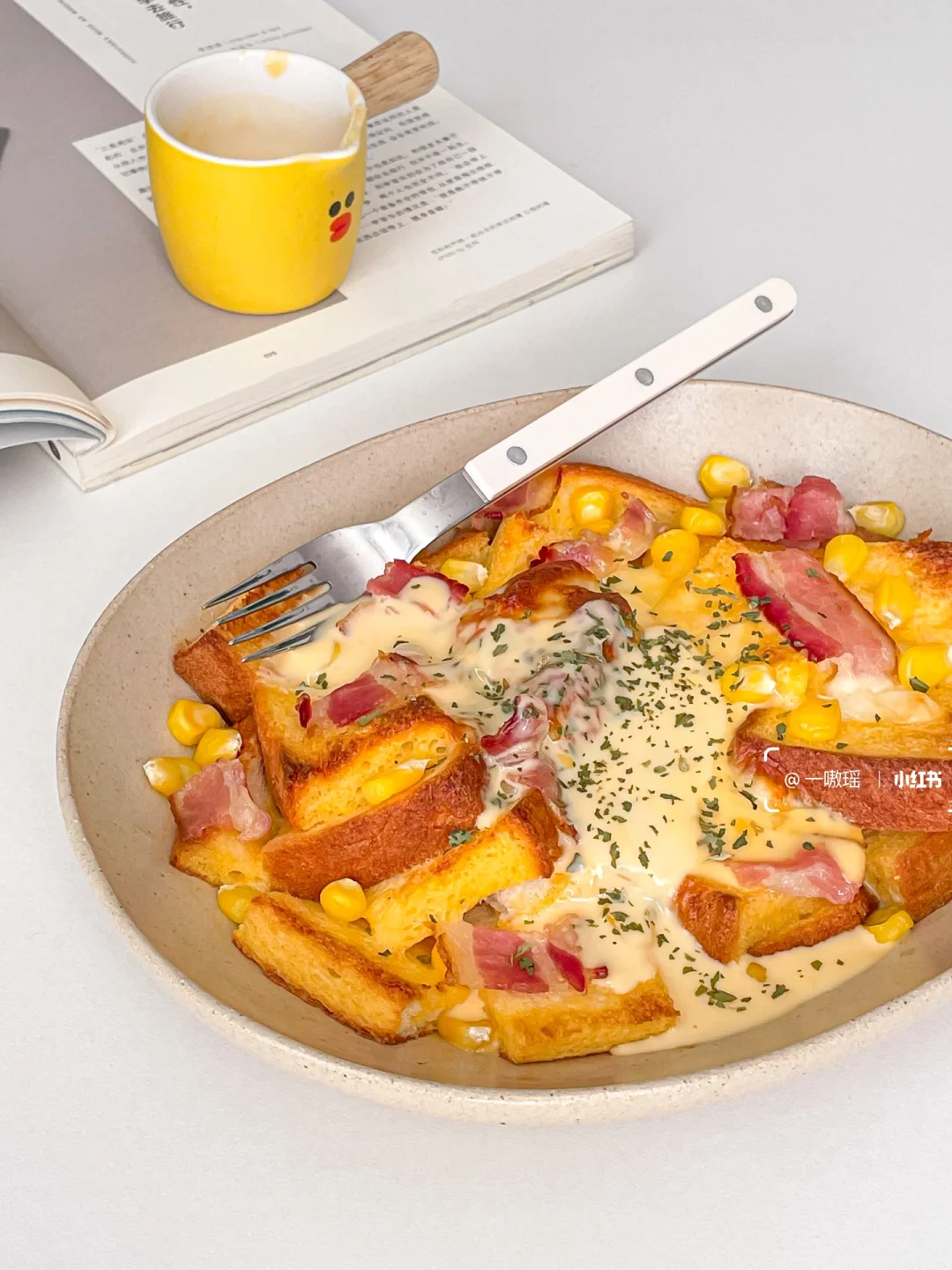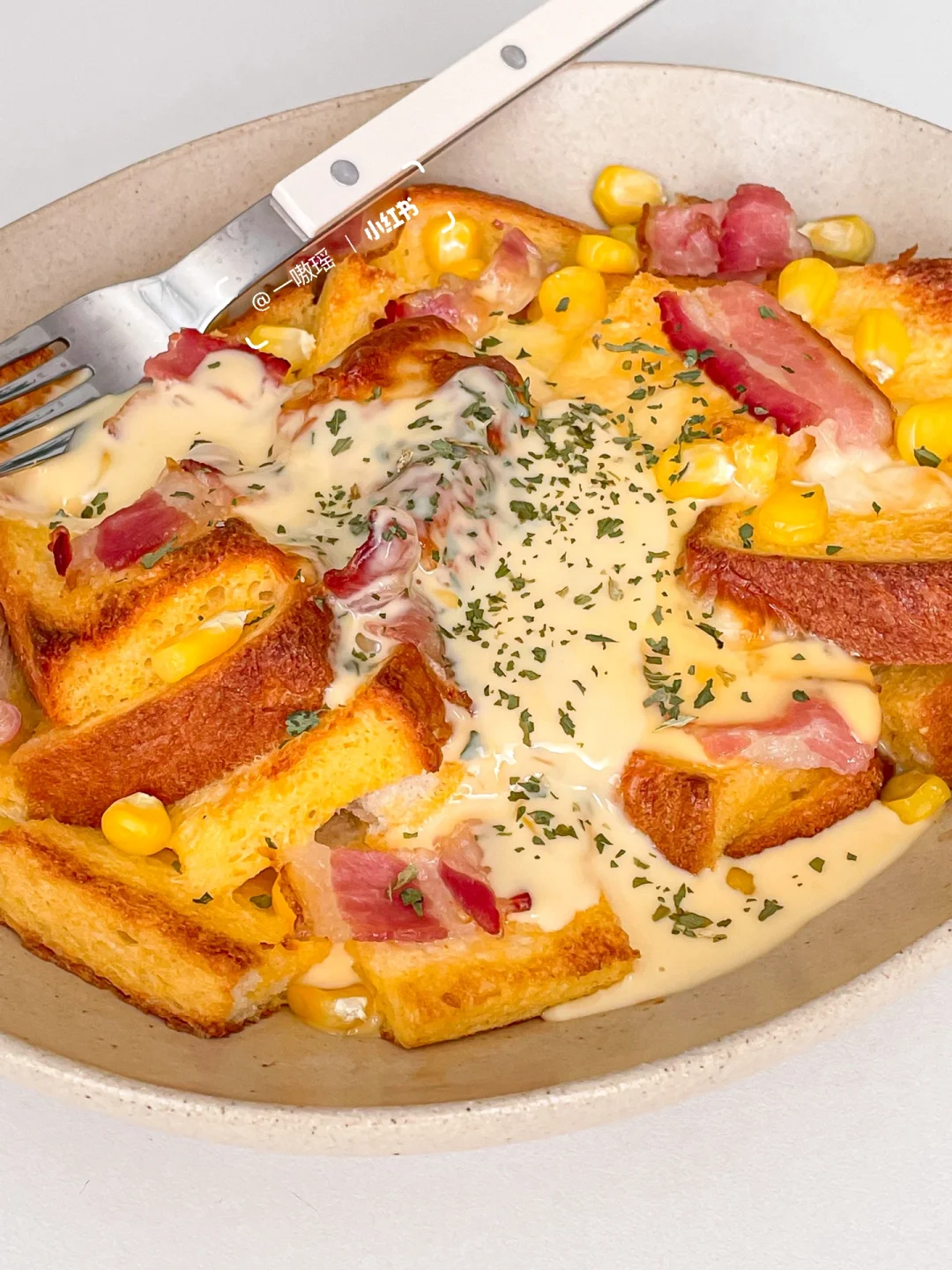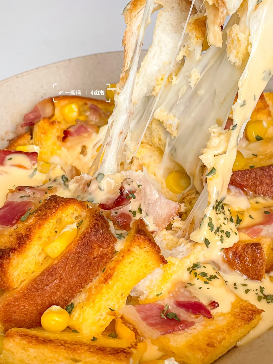 懒人早餐也有无限可能🥄 被牛奶蛋液浸泡的吐司🍞烤完之后软软嫩嫩香喷喷 还有咸香培根和超长拉丝芝士!多重快乐~必须拿捏👌 - 🛒食材 吐司三片 鸡蛋两个 芝士片两片 奶酪棒一根 鲜奶60毫升 玉米粒适量 👩🏻‍🍳做法 ·吐司切块,鸡蛋打散加入牛奶搅匀 ·淋在吐司上,充分浸泡 ·铺上培根片、奶酪碎、玉米粒 ·烤箱200度20分钟 ·鲜奶加芝士片加热至融化淋在烤好的吐司上 ·撒黑胡椒、欧芹碎 - ☕️今日咖啡 将好喝又省事贯彻到底的冰拿铁🧊 🥛新希望24小时黄金营养乳+☕️现磨咖啡浓缩液 0糖0负担,very醇香,完胜咖啡店!据说这款鲜奶只卖上市当天,很新鲜🍃入口丝滑不粘腻,自然清甜,太喜欢了[两颗心R]