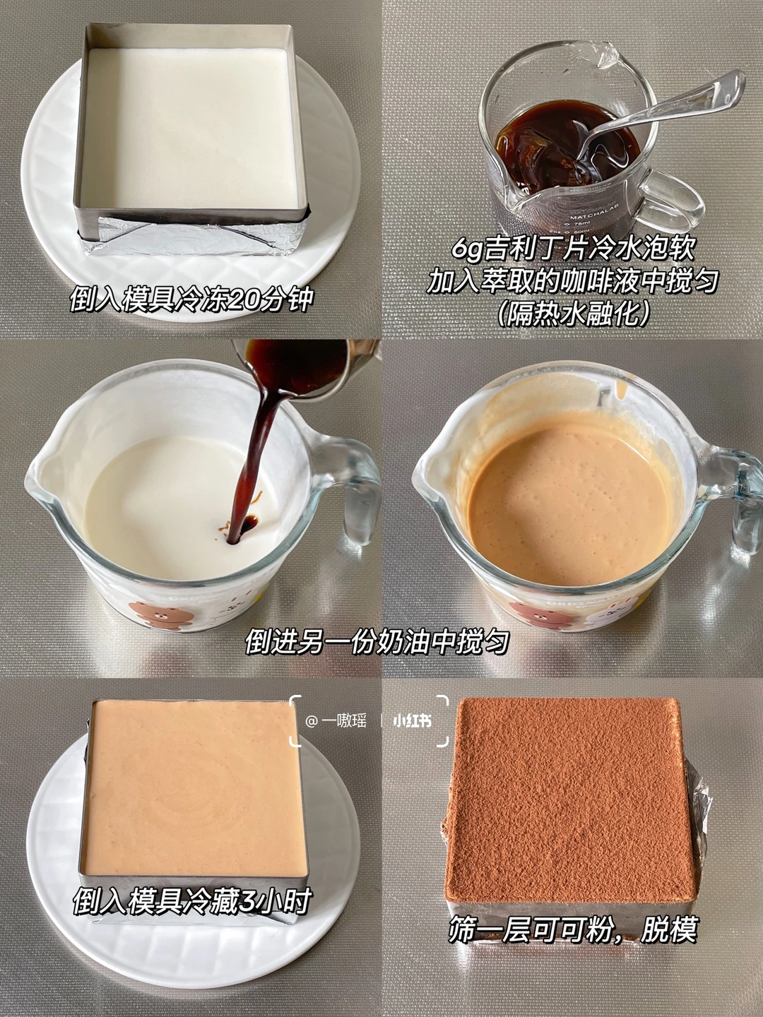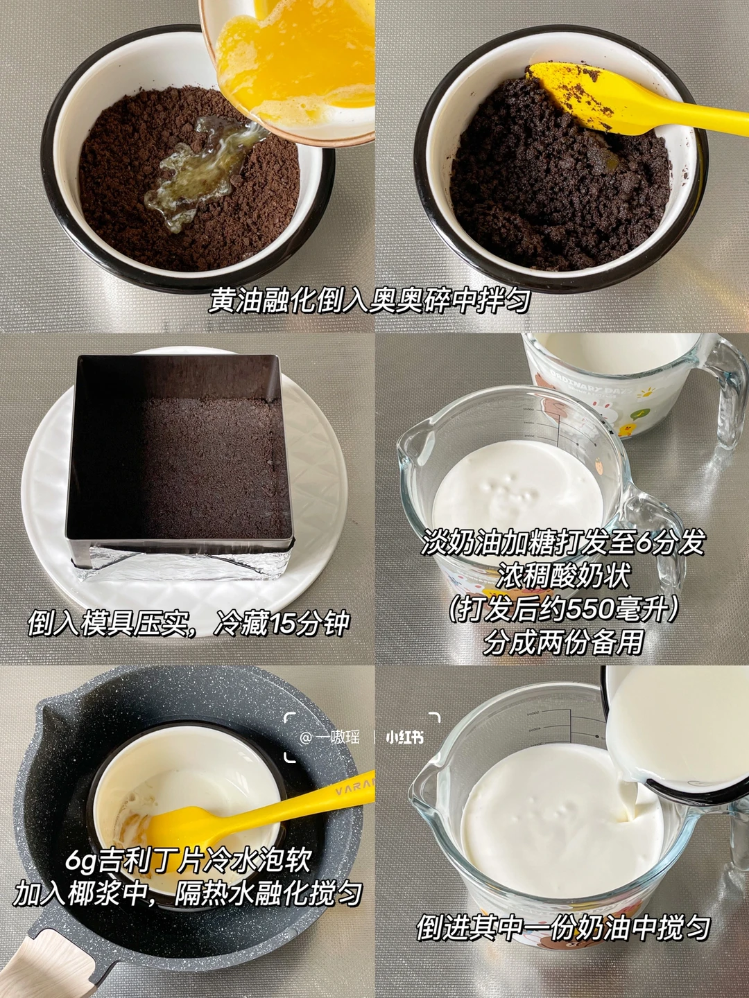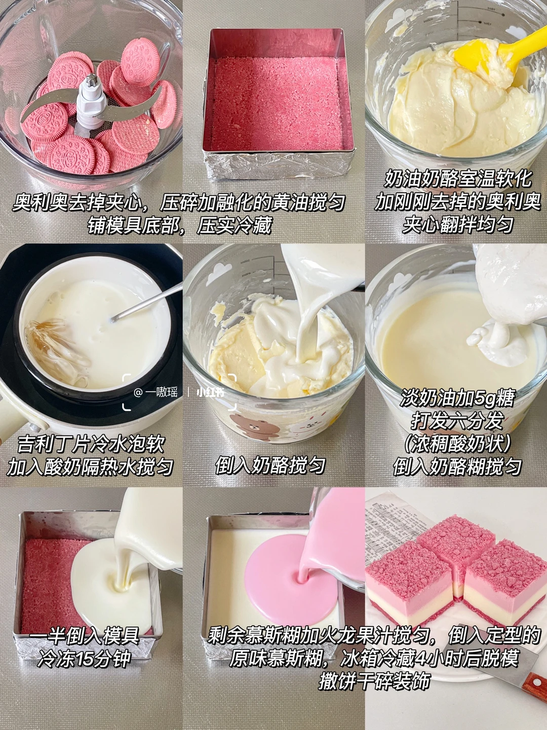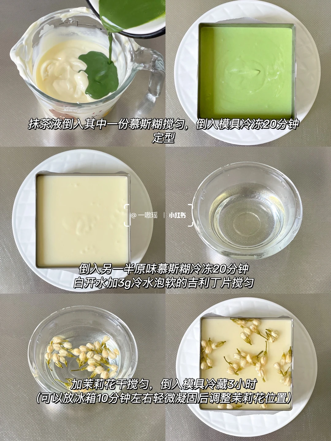 冰冰凉凉四款自制慕斯蛋糕🎂 搅一搅就能做,绵密丝滑 奶香浓郁 超级简单又好吃,颜值也很在线!不需要烤箱很方便 - ▫️模具大小:对角6寸 高5cm 成品约4.5寸 1⃣️ 海蓝椰椰慕斯 🌊 •🍪饼干底 奥利奥饼干碎55g 黄油30g •🍰慕斯 淡奶油250g 椰浆65g 吉利丁片10g 糖15g 蝶豆花粉4.5g 椰蓉适量 · 2⃣️ 生椰拿铁慕斯☕️ •🍪饼干底 奥利奥碎65g 黄油25g •🍰慕斯 淡奶油250g 糖30g 吉利丁片12g 椰浆60g 咖啡液35g(约60毫升) · 3⃣️ 粉嘟嘟酸奶慕斯蛋糕🌸 •🍪饼干底 粉色奥利奥碎(桃花米酿味or樱花柚子味)55g 黄油25g •🍰慕斯 奶油奶酪150g 酸奶150g 淡奶油170g 吉利丁片10g 糖5g · 4⃣️ 巧克力花生慕斯🥜 •🍪饼干底 奥利奥碎55g 黄油25g •🍰慕斯 奶油奶酪150g 酸奶150g 淡奶油180g 吉利丁片11g 抹茶粉 茉莉花适量 👩🏻‍🍳做法 ▫️奥利奥去利压碎加入黄油拌匀,倒入模具压实 ▫️奶油奶酪室温软化加30g糖翻拌均匀 ▫️冷水泡软吉利丁片,加入酸奶中,隔热水搅拌融化,再加入到奶酪糊里搅匀 ▫️倒入淡奶油搅匀,取出一半原味慕斯糊 ▫️热牛奶加抹茶粉打散,倒入其中一份慕斯糊里搅匀,再倒入模具冷冻20分钟定型 ▫️模具倒入另一半原味慕斯糊冷冻20分钟 ▫️白开水加3g冷水泡软的吉利丁片搅匀(喜甜可加5g糖) ▫️加茉莉花干搅匀,倒入模具冷藏3小时 (可以冷藏15分钟左右轻微凝固后调整茉莉花位置) - 🔴Tips ▫️经期女生&孕妇🤰不可以食用蝶豆花哦! ▫️椰汁有甜味,此配方为低糖配方,喜甜可酌情加糖 ▫️吹风机热风或者热毛巾敷一下模具即可轻松脱模