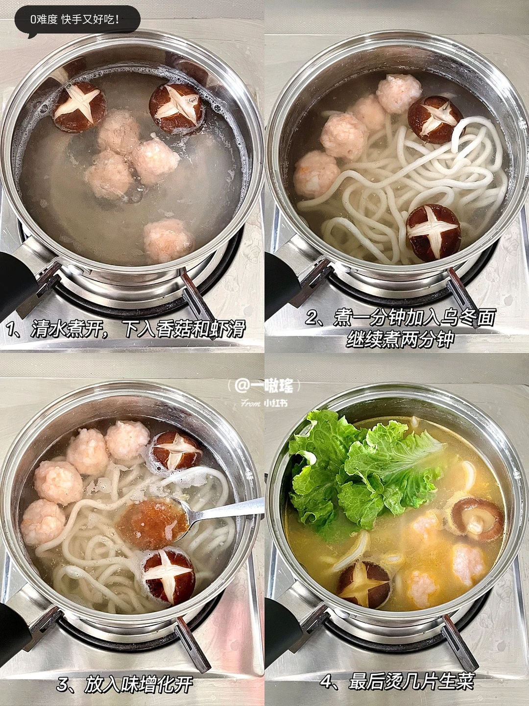 炎热的天气最最需要简单快手美食 今天分享一碗味增虾滑乌冬面🍜,所有食材烫熟就搞定啦!快手晚餐必选!🔝 爽滑劲道的乌冬面,Q弹鲜美的虾滑,浸入鲜香的味增汤底,每一口都大满足 - 食材🔖 乌冬面 虾滑 生菜 香菇 鸡蛋 味增 做法🔖 ▫️水开下入香菇和虾滑 ▫️煮一分钟加入乌冬面继续煮两分钟 ▫️放入味增化开 ▫️最后烫几片生菜就搞定啦! - 营养丰富热量低,暴风吸入,汤都喝光光了,过瘾!