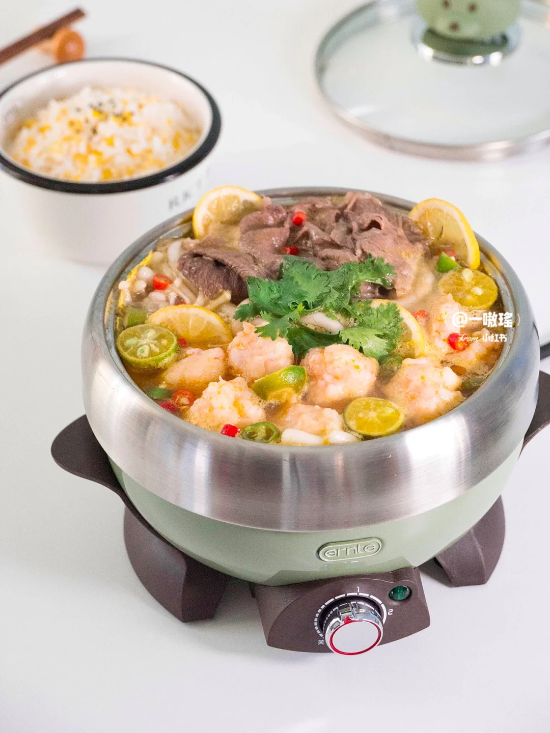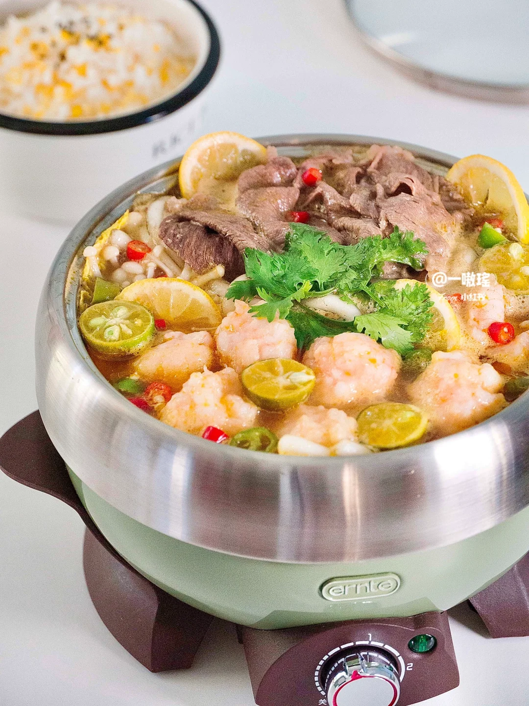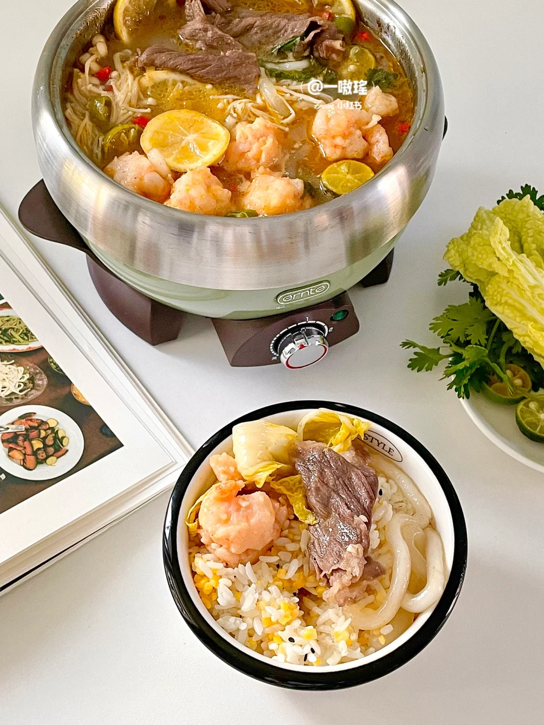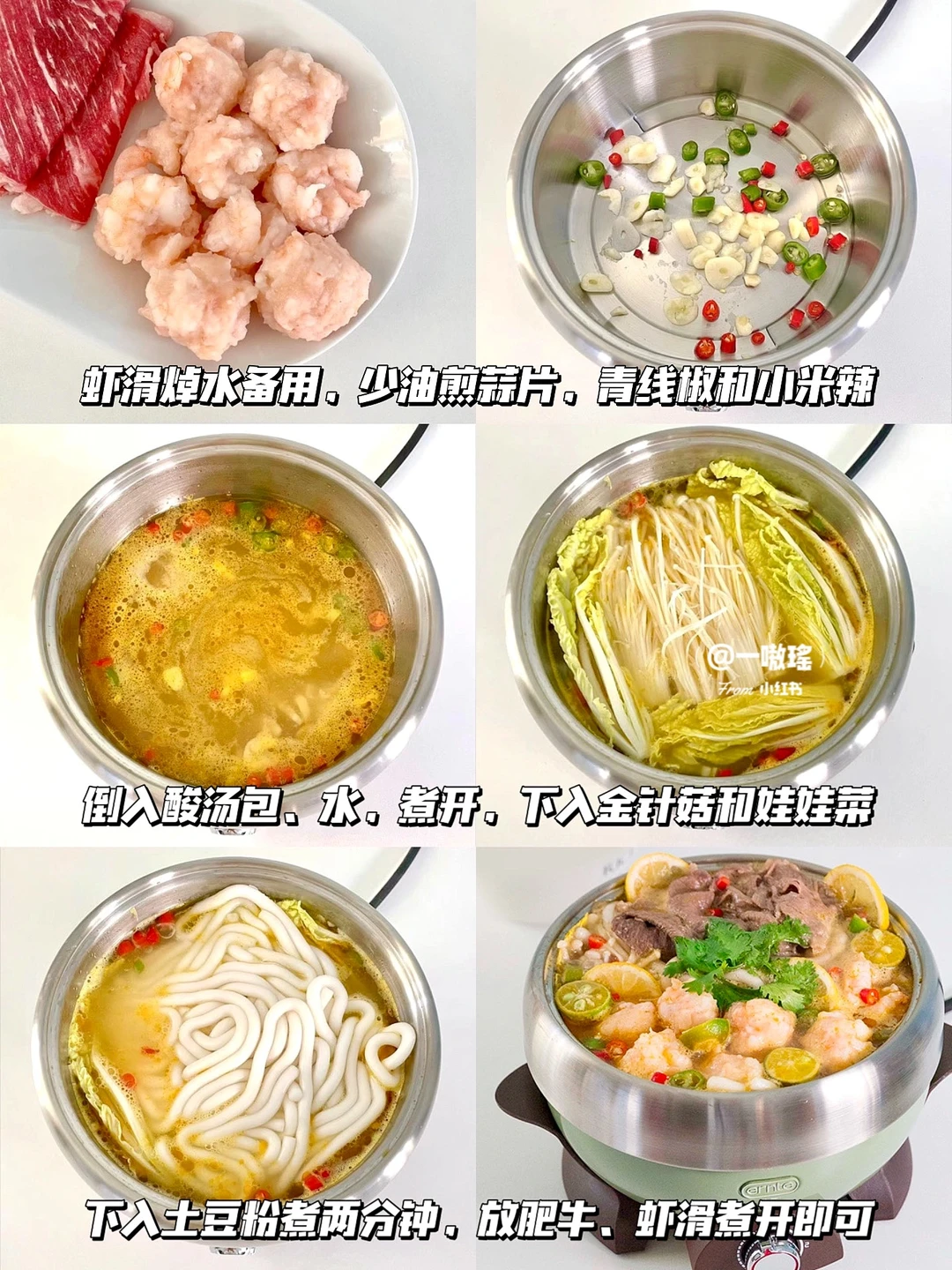 今天是5分钟快手美食一锅端🍲 虾滑+肥牛,双倍快乐爽翻天! 热乎乎又暖胃的酸汤肥牛虾滑真的一整个大满足 - 食材✨ 虾滑 肥牛 金针菇 娃娃菜 大蒜头 青线椒 小米辣 酸汤酱 土豆粉 柠檬 青柠 做法🔖 ▪️虾滑焯水备用 ▪️锅内少油煎青线椒、蒜片、小米辣 ▪️倒入酸汤包、水,煮开 ▪️放金针菇、娃娃菜、土豆粉煮两分钟 ▪️放肥牛、虾滑、柠檬、青桔等煮开即可 - 酸辣鲜美,好吃到汤都不剩,晚饭赶紧安排它吧!